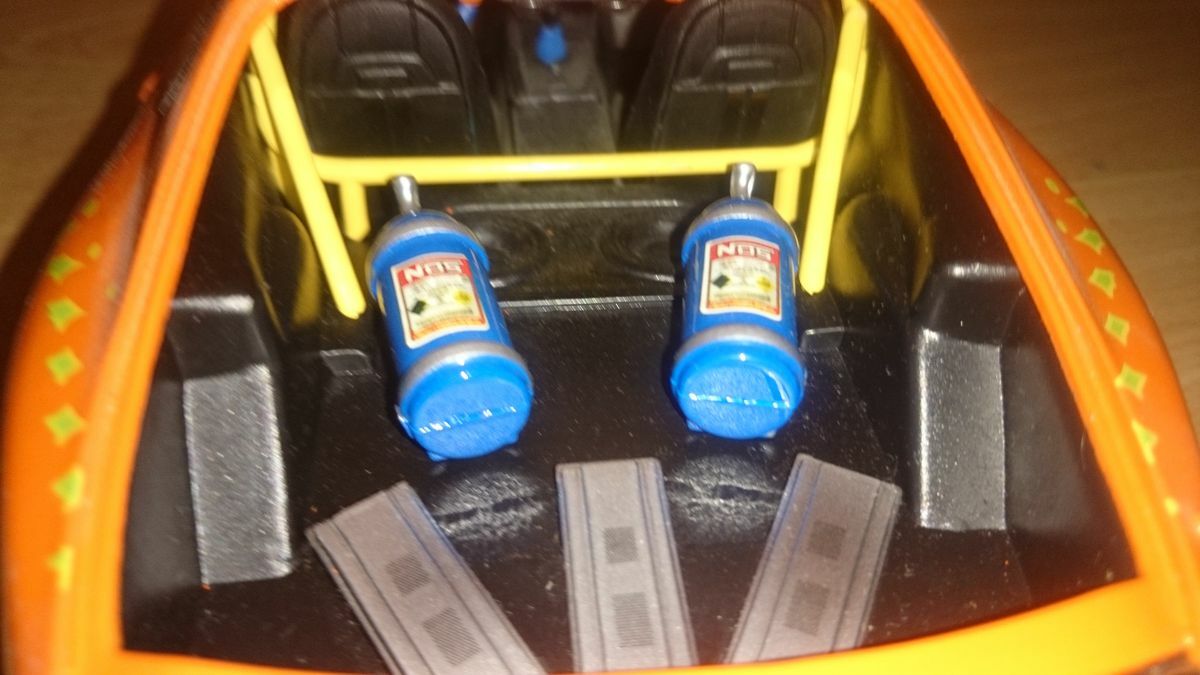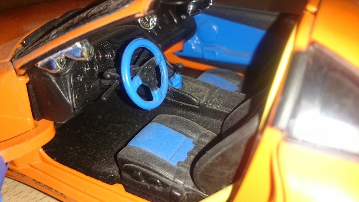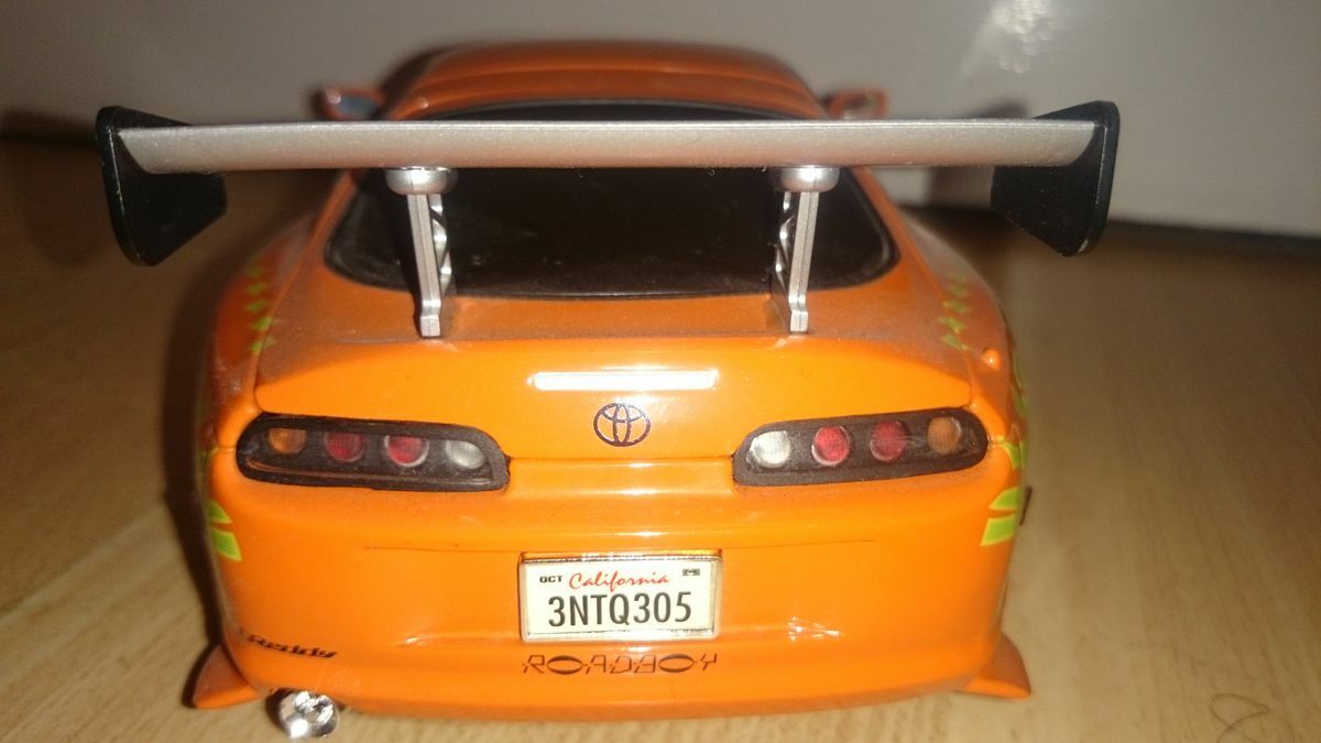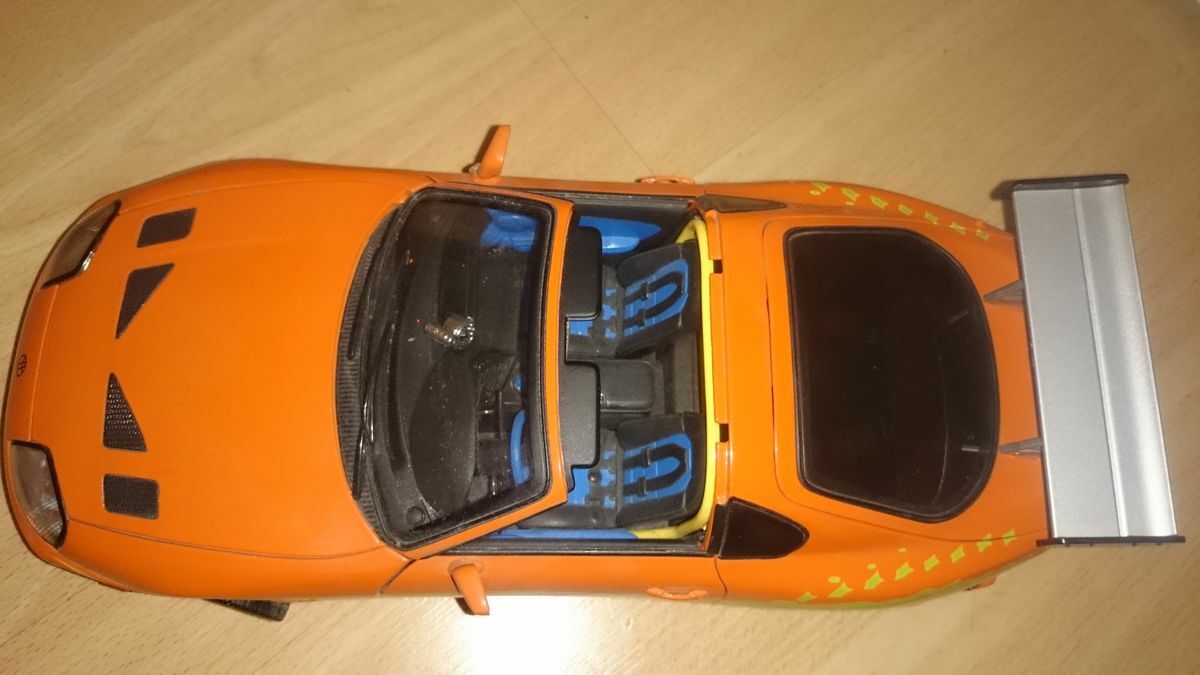 This 1/18 scale model car was crafted by Ertl, a renowned manufacturer of model vehicles. The unique model, part of the collection of Modelly member Shelby1967, captivates with its attention to detail. The striking orange paint with the original graphics and logos perfectly captures the film's look. Prominent features include the detailed headlights and aggressive front bumper, as well as the adjustable rear wing. Clearly visible in the photos, the model features chrome-finished wheels from 5Zigen, another faithful representation of the original's tuning components. Also noteworthy are the accurate carbon fiber accents on both the hood and rear wing.