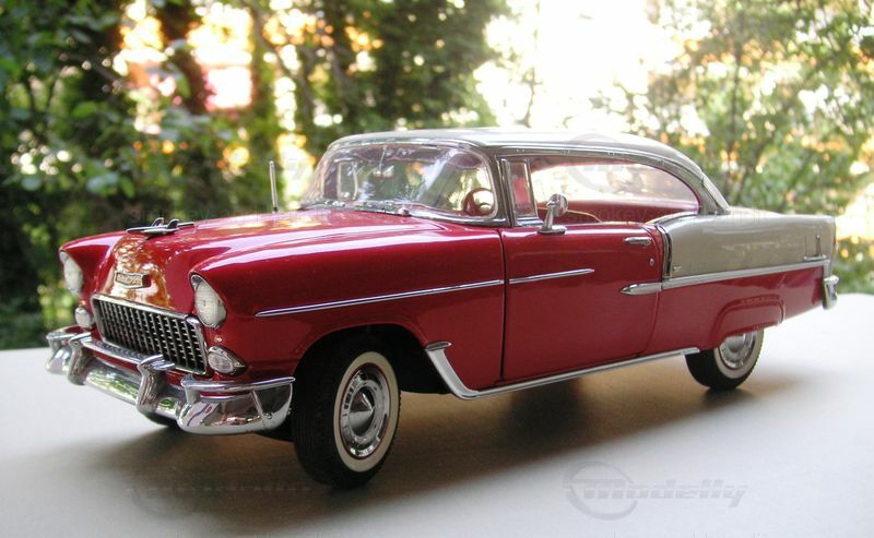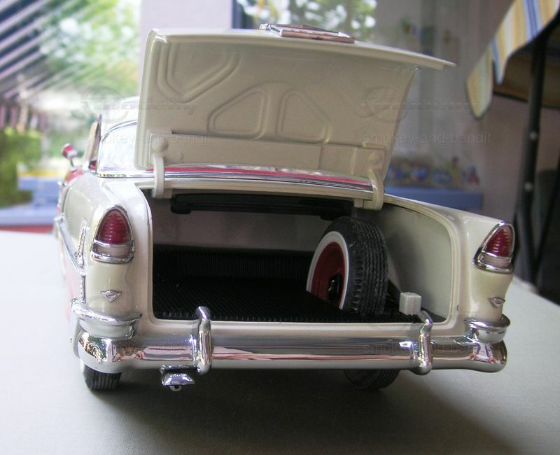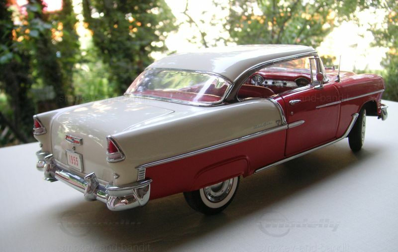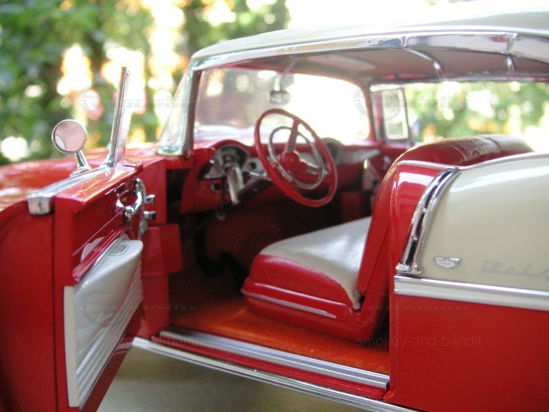 The model shown here is part of "smokey-and-bandit's" collection and is an excellent example of the attention to detail that Danbury Mint models are known for. The two-tone paint job of this model is an exact replica of the original color scheme, featuring a glossy red main body with contrasting beige roof and rear fenders. The emulated chrome bumpers, door handles, and side mirrors are precise miniatures of the original parts. Danbury Mint has strived to replicate every detail meticulously, appreciated by collectors worldwide. Particularly notable is the detailed replication of the wheels and the original Chevrolet logo on the hood.