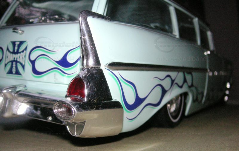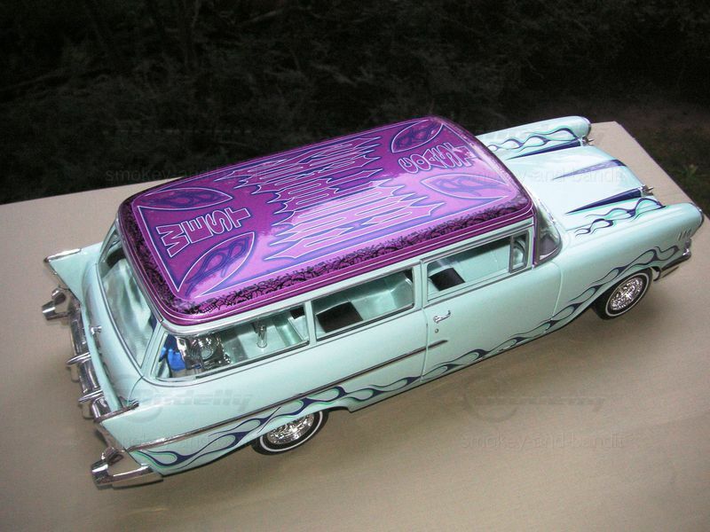 This model, a 1/12 scale car manufactured by Muscle Machines, showcases the Chevrolet Bel Air Wagon in a striking custom paint job that makes it a true head-turner. It features a two-tone paint scheme with a light mint green as the main color, complemented by deep blue flame patterns along the body. The arrangement and detailing of these flames are artistic, giving the model a dynamic yet classic aesthetic. The intricately crafted chrome details on the bumpers, grille, and hubcaps, as well as the meticulous reproduction of the headlights and taillights, complete the overall look. Particularly striking are the chrome wire-spoke wheels that could be from Dayton Wire Wheels, a well-known manufacturer of wire-spoke rims.