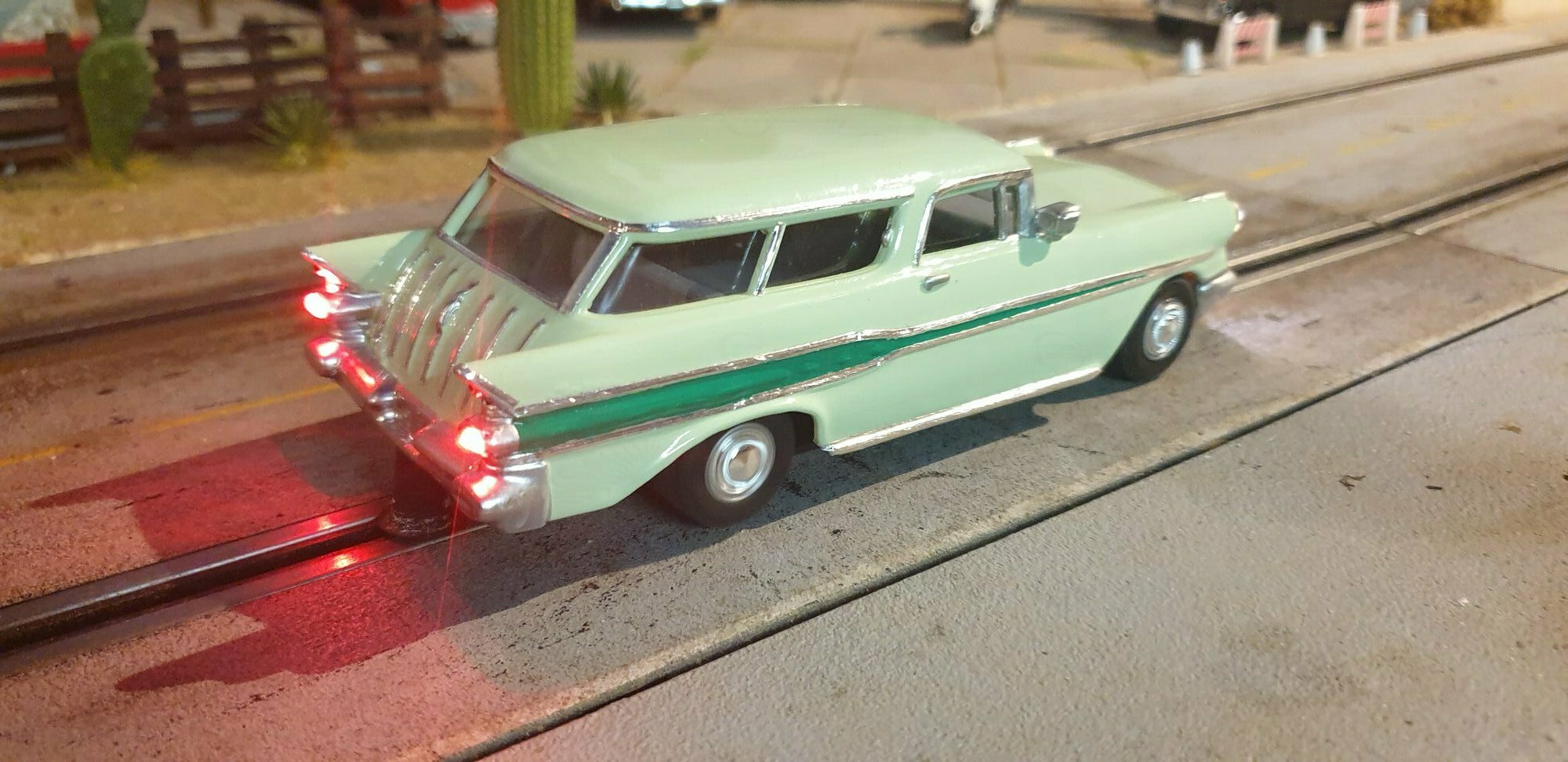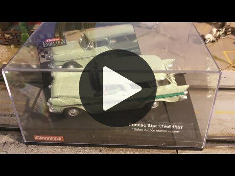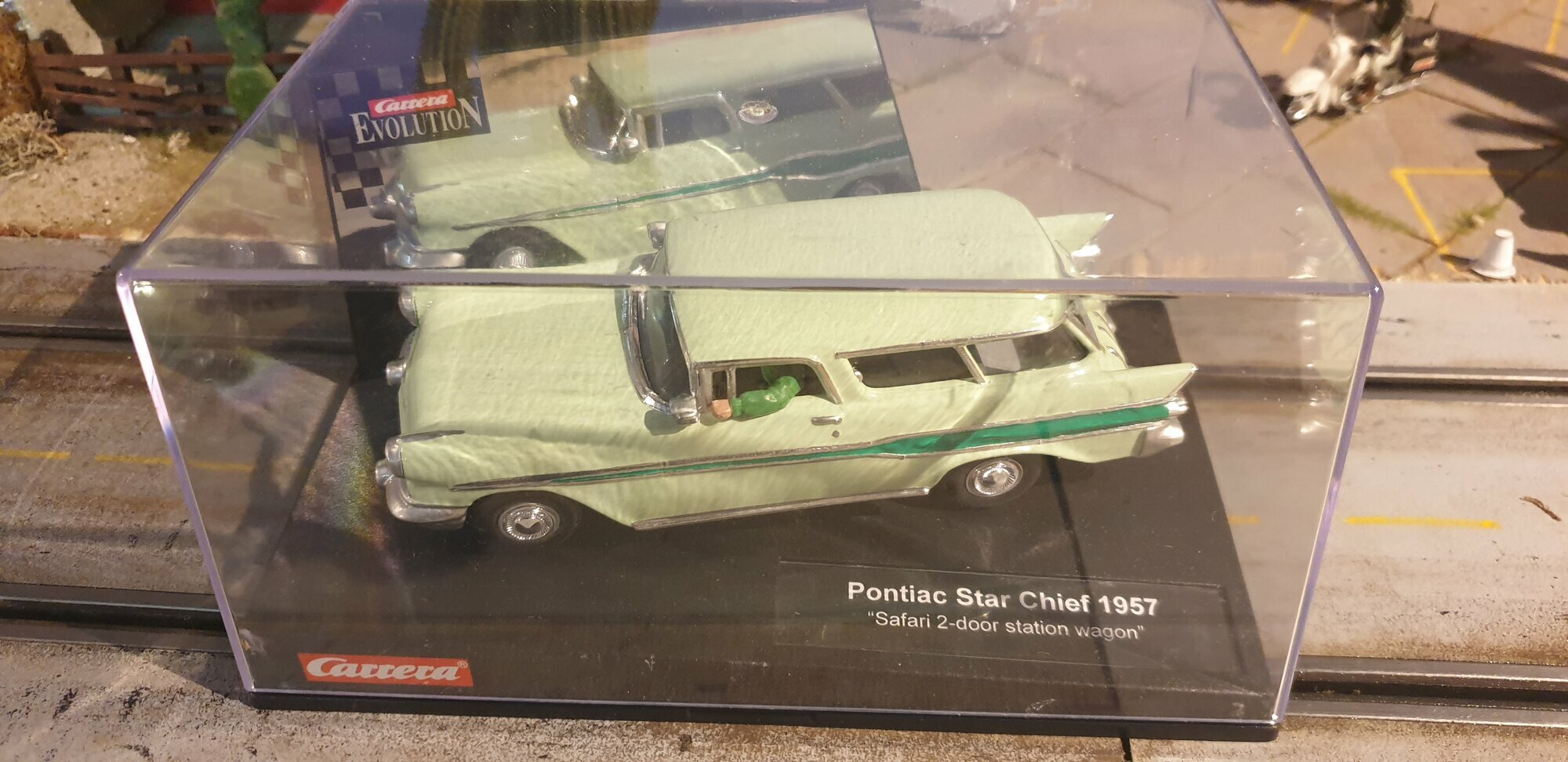 The mini version of the Pontiac Star Chief Safari accurately captures many of the original design elements—from the curved fenders to the front end. The working lights at the front and back add a fun dynamic, while the chrome details and authentic lines emphasize its aesthetic charm. This miniature offers a fantastic glimpse into the car designs of the 1950s. The clear display case wrapping around the model has the text “Carrera Evolution,” which might hint at its compatibility with slot car tracks.