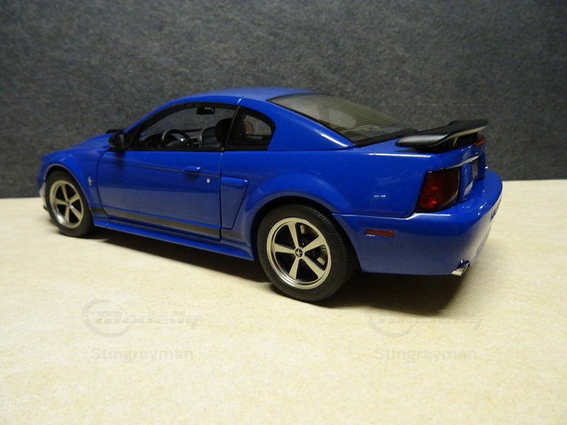 The 1/18-scale model car presented here, manufactured by AUTOart Performance, is a detailed replica of the Ford Mustang Mach 1 and belongs to the collection of Modelly member "Stingrayman." The model car is made of high-quality die-cast material, ensuring durability and precision in detailing. The model features a accurately painted body in a striking metallic blue color, attracting attention. The black accents, such as the hood and rear spoiler, give the model a sporty look. The tires and wheels are faithfully replicated, providing a realistic appearance. The wheels were designed by American Racing, contributing to the authentic representation of the original.