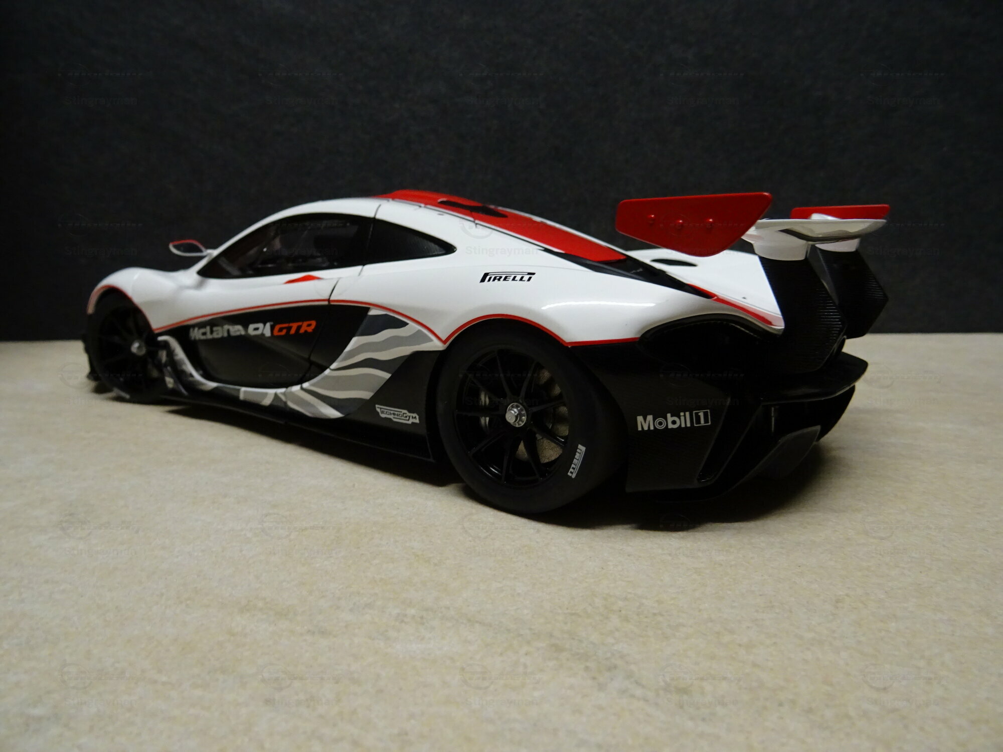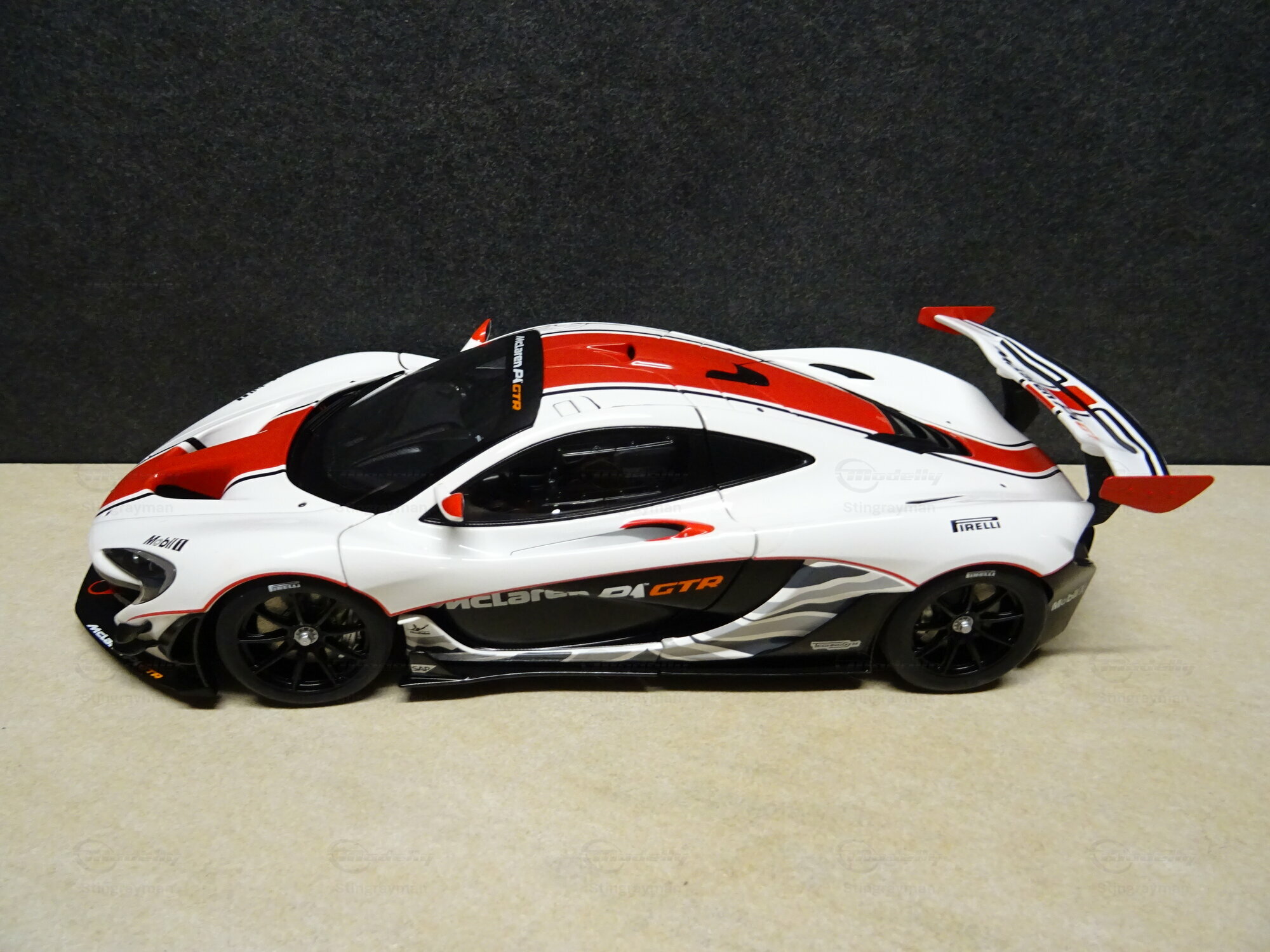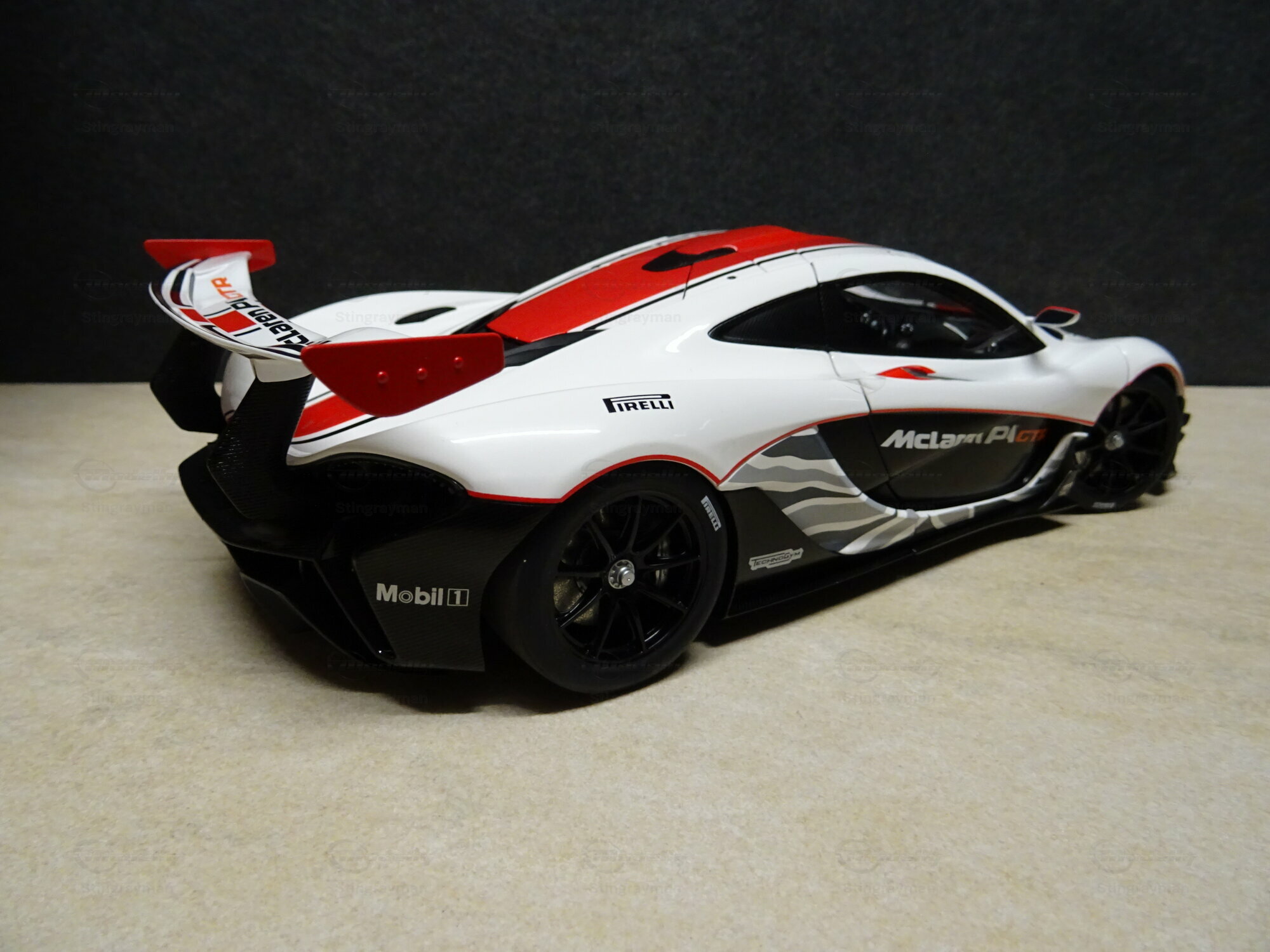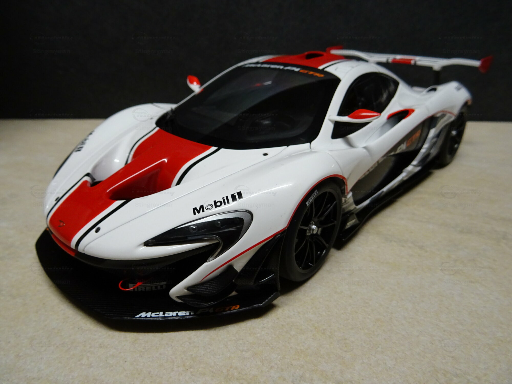 Collectors and model enthusiasts will be thrilled by the precision and detail of the AUTOart miniature of the McLaren P1 GTR in 1/18 scale. This model from the collection of "Stingrayman" features impressive elements that faithfully replicate the real car. The striking white paint with bright red accents extending across the hood and roof catches the eye. Technical decals from Mobil 1 and Pirelli on the body complement the authentic racing look. The distinctive black wheels resemble the custom-made Pirelli wheels found on the original.
