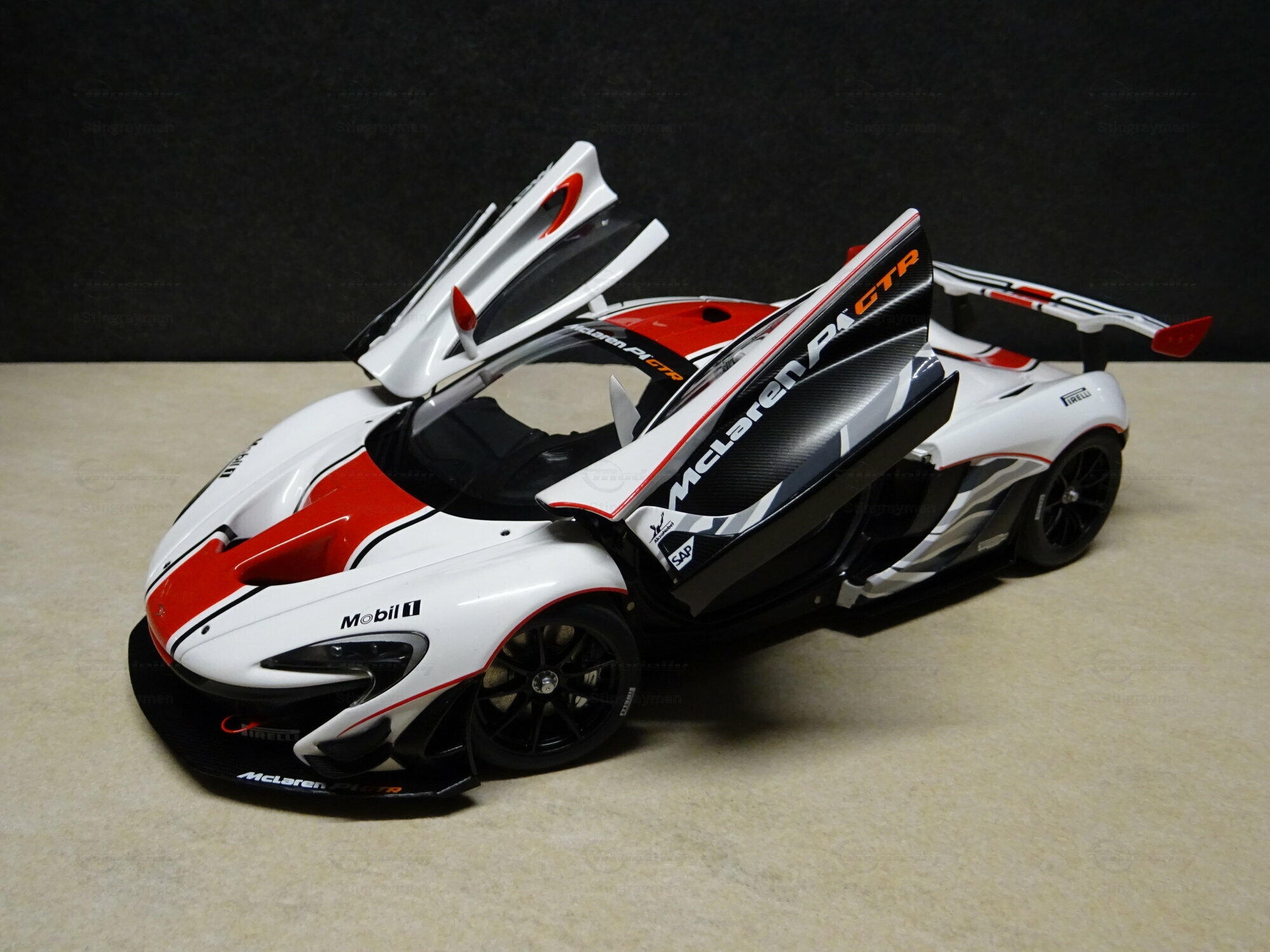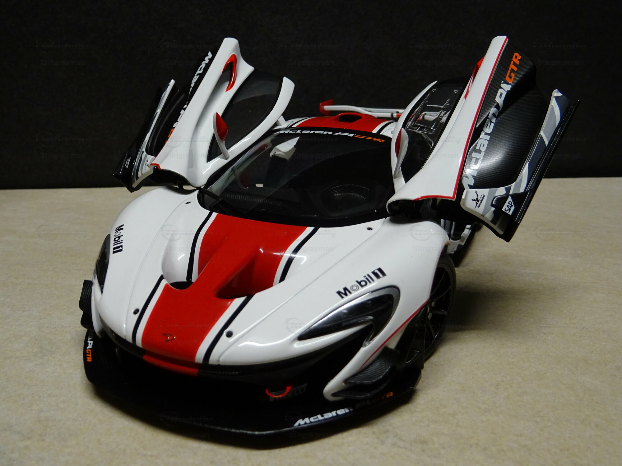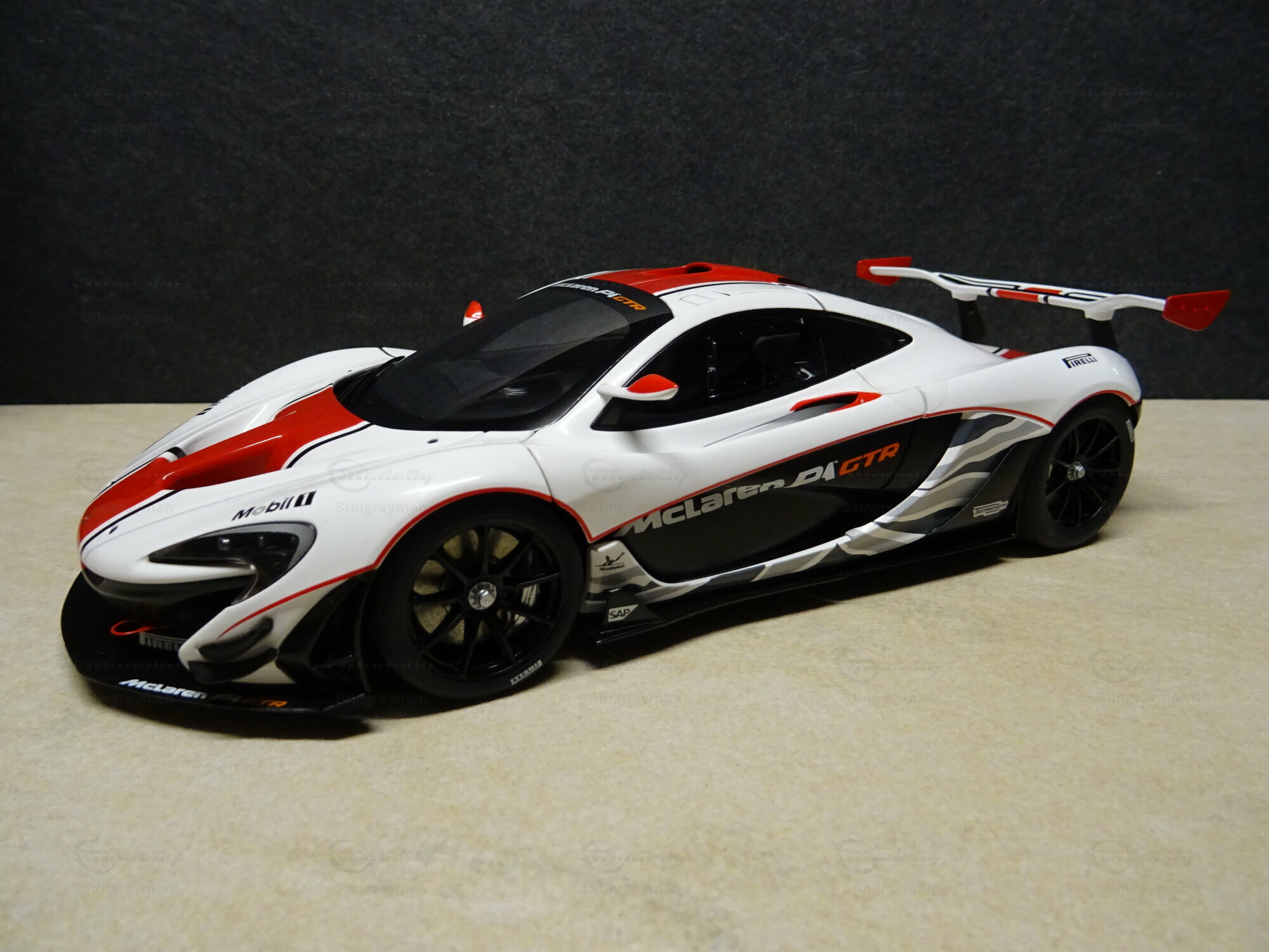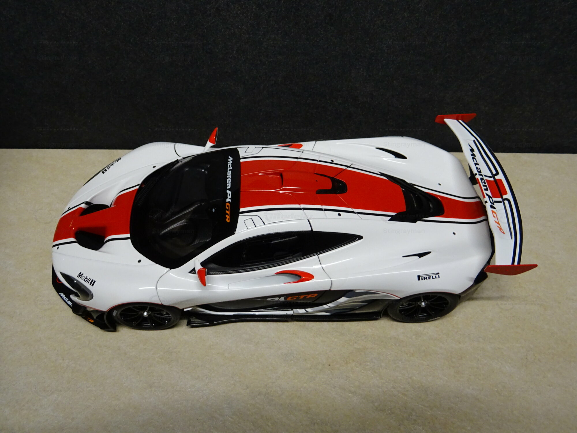 Collectors and model enthusiasts will be thrilled by the precision and detail of the AUTOart miniature of the McLaren P1 GTR in 1/18 scale. This model from the collection of "Stingrayman" features impressive elements that faithfully replicate the real car. The striking white paint with bright red accents extending across the hood and roof catches the eye. Technical decals from Mobil 1 and Pirelli on the body complement the authentic racing look. The distinctive black wheels resemble the custom-made Pirelli wheels found on the original.