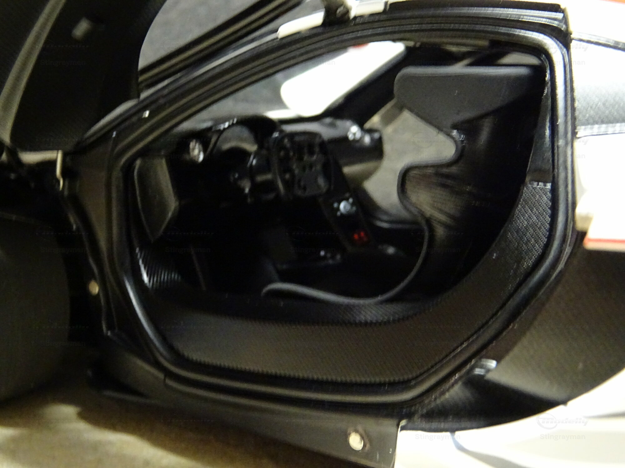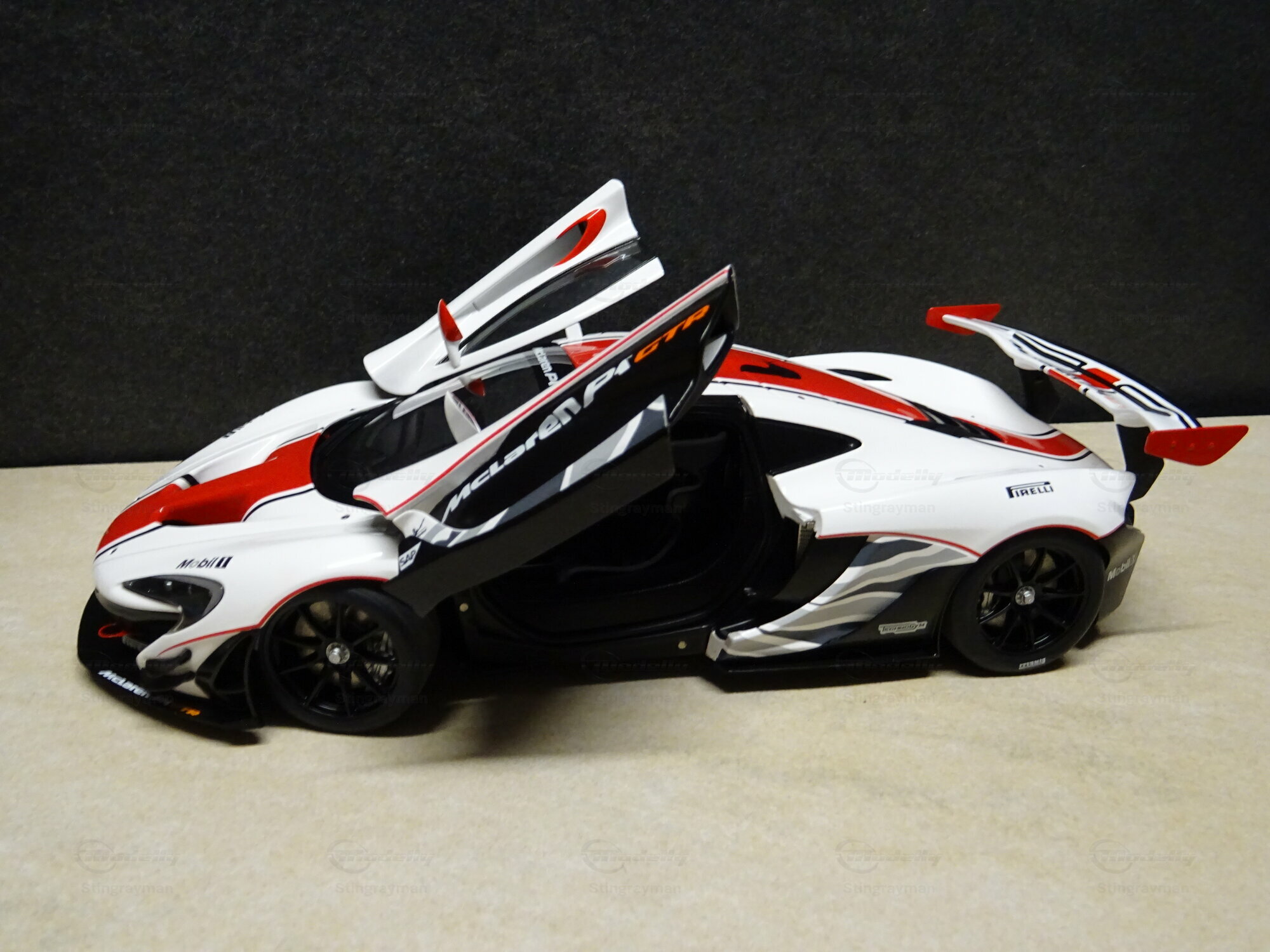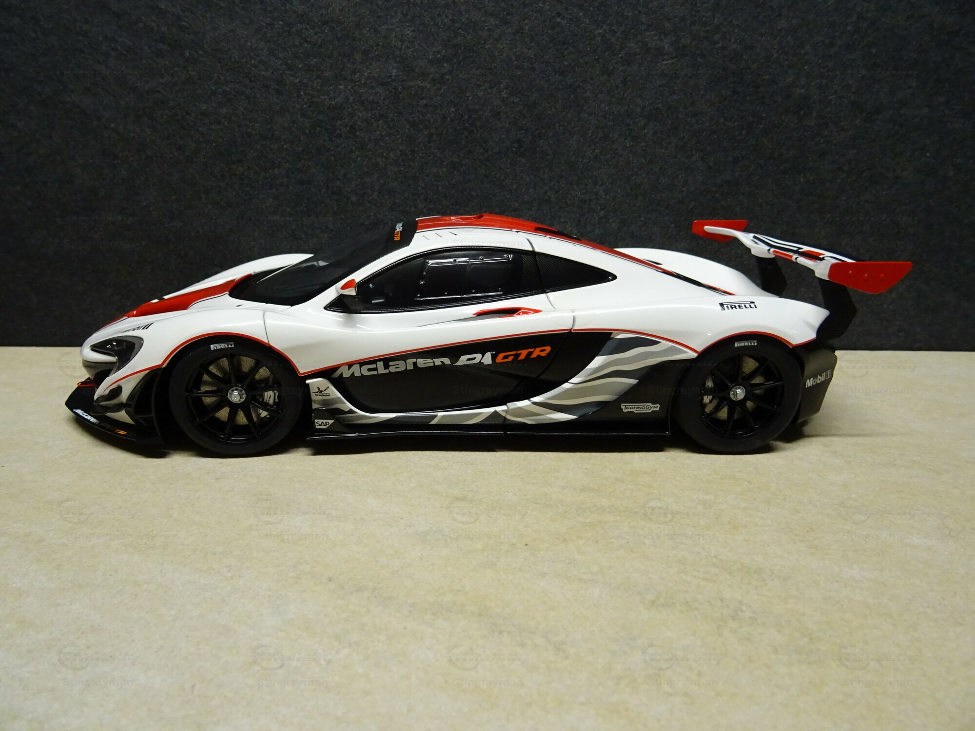 The AUTOart miniature of the McLaren P1 GTR in 1/18 scale utilizes an innovative material blend to achieve a high level of realism. The model is constructed from a mix of die-cast metal and high-quality plastics, allowing for both stability and meticulous detailing. These materials ensure that all elements such as the aggressive front splitter, aerodynamically optimized side skirts, and imposing rear wing can be accurately replicated. The doors open realistically, revealing the intricately detailed interior inspired by the cockpit of the original car.