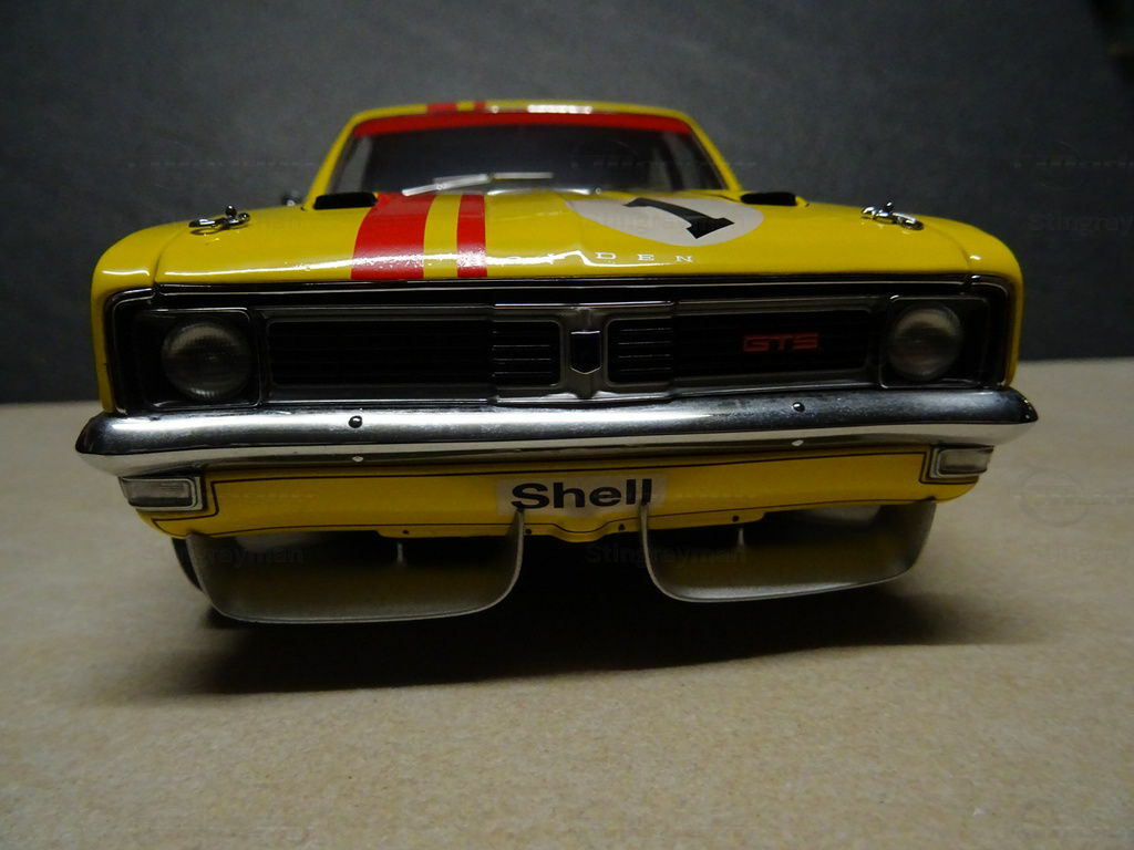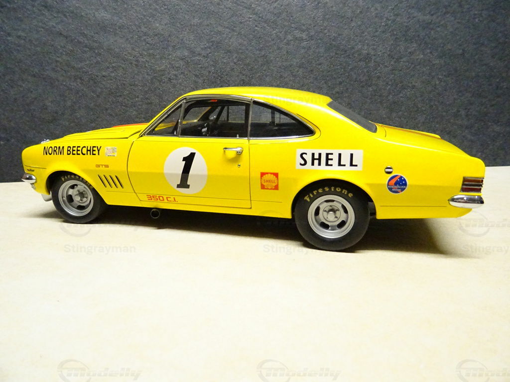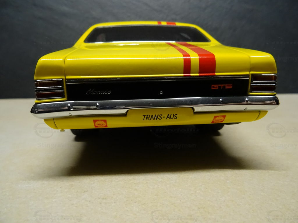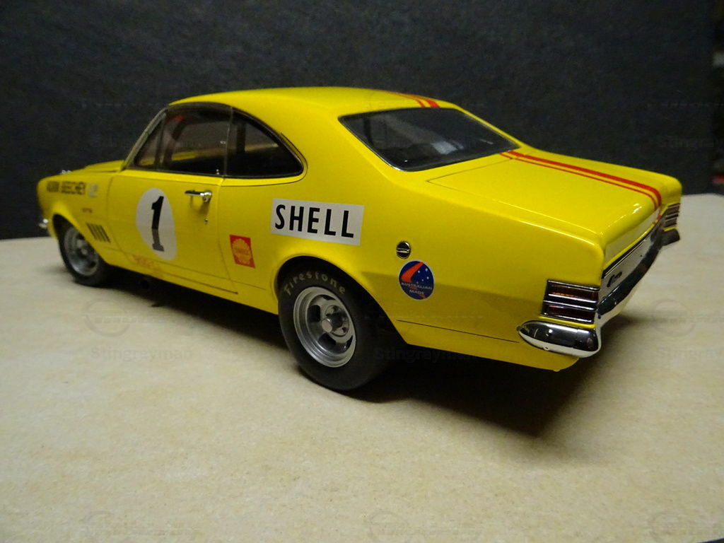 This 1/18 scale model car was crafted by Classic Carlectables and faithfully replicates the Holden Monaro HT. The model is made from diecast material and stands out for its high level of detail and quality. In the photos of the model, which is in the collection of Modelly member "Stingrayman," many precise details are visible, including the distinctive front end with the GTS emblem, detailed rims, and the characteristic yellow paint with red stripes and the number 1. Every small nuance of the original has been meticulously recreated, from the headlights to the sponsor decals like Shell and Repco.