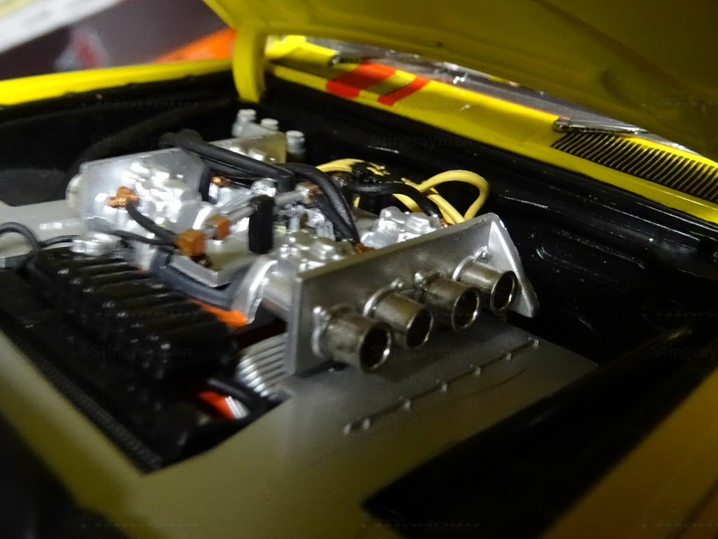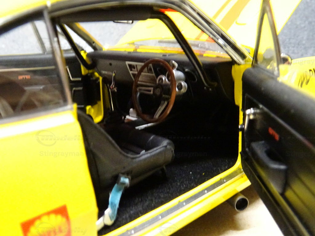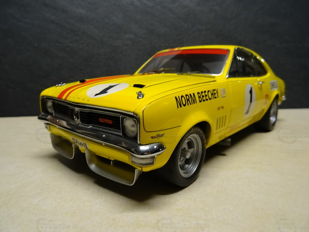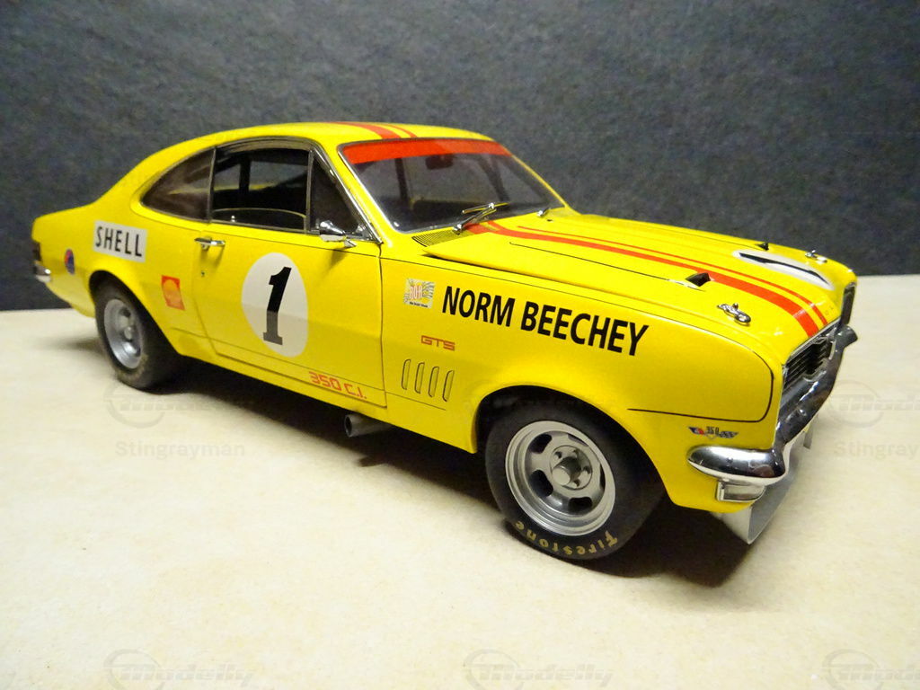 This 1/18 scale model car was crafted by Classic Carlectables and faithfully replicates the Holden Monaro HT. The model is made from diecast material and stands out for its high level of detail and quality. In the photos of the model, which is in the collection of Modelly member "Stingrayman," many precise details are visible, including the distinctive front end with the GTS emblem, detailed rims, and the characteristic yellow paint with red stripes and the number 1. Every small nuance of the original has been meticulously recreated, from the headlights to the sponsor decals like Shell and Repco.