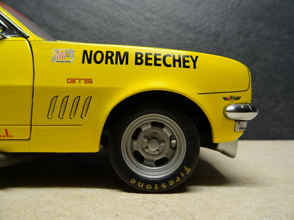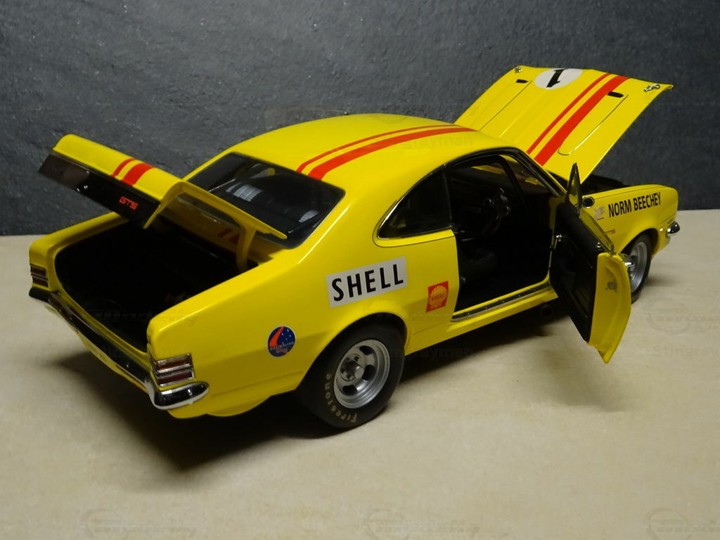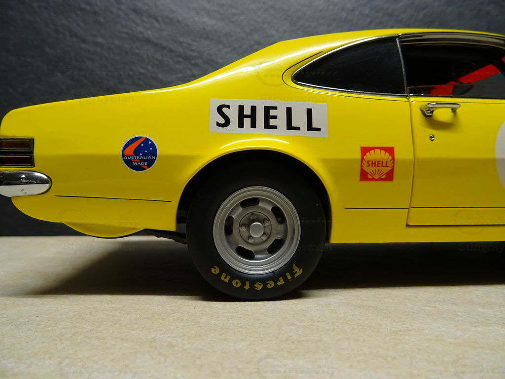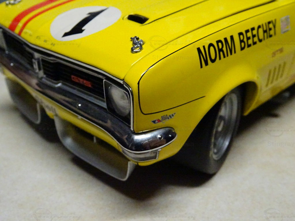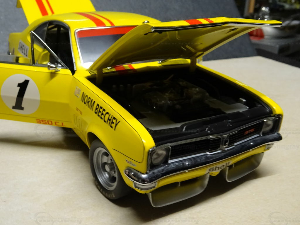 The Monaro HT GTS in model form, manufactured by Classic Carlectables, has a lot to offer. The striking yellow paint with red stripes is instantly recognizable, giving the model a dynamic and sporty look. The number 1 on the hood is also noticeable, harkening back to its racing history. Sponsor decals like Shell and Repco are carefully placed on the body. These details give the model an authentic appearance and evoke nostalgic memories of the glorious days of racing.