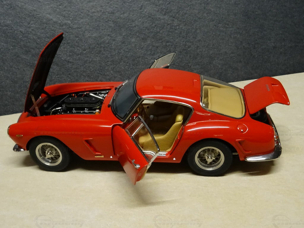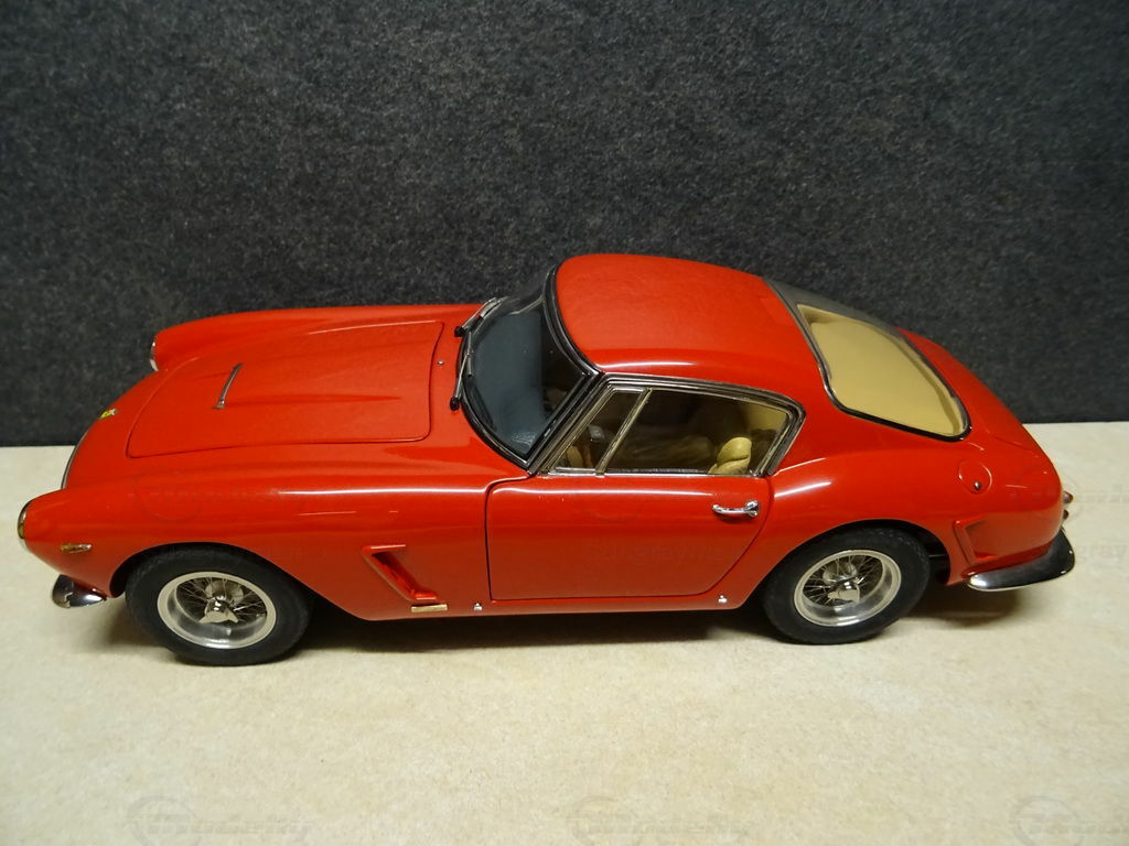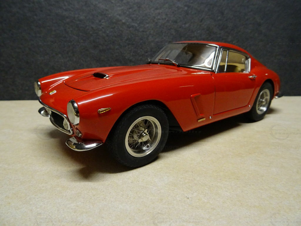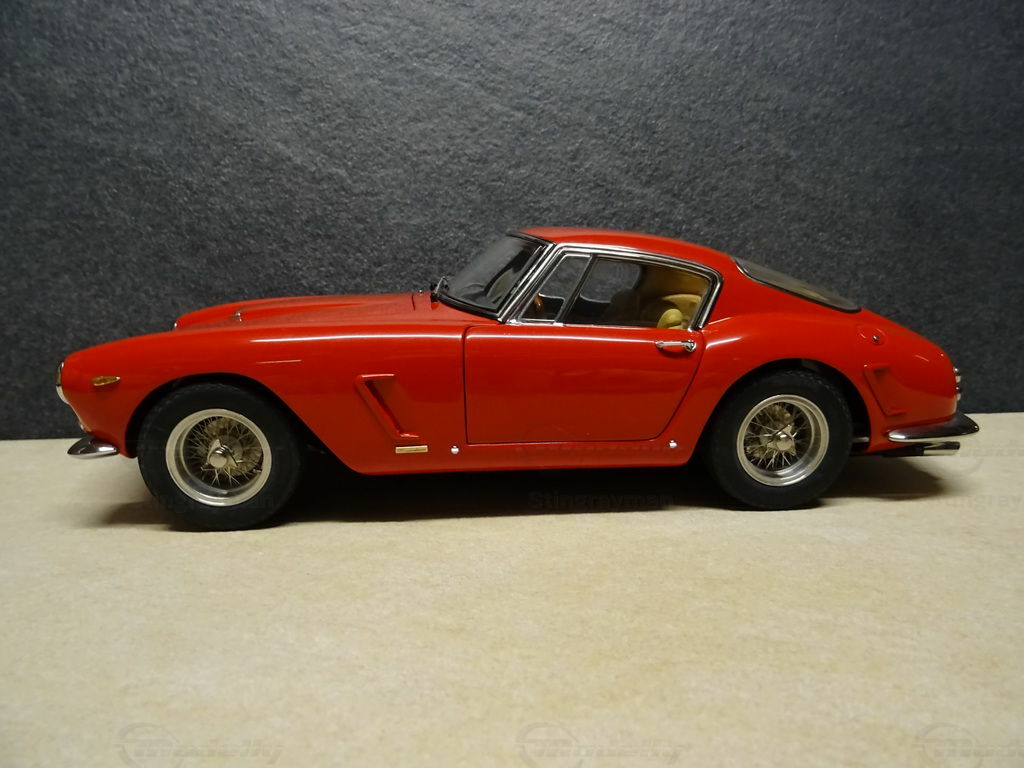 This scale model car, produced by CMC in 1/18 scale, is a precise replica of the iconic Ferrari 250 GT Berlinetta SWB. The attention to detail of this miniature is remarkable. The model is made of die-cast material, known for its high quality and durability. Particularly striking are the precise chrome details on the bumpers and the faithfully reproduced rims. The golden accents on the sides and the excellent replication of the Ferrari logo on the hood are also highlighted features of this model. Modelly member 'Stingrayman' has this detailed miniature in their collection, and the high level of precision and detail makes it a valuable piece for enthusiasts.