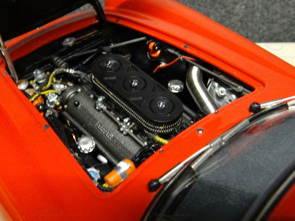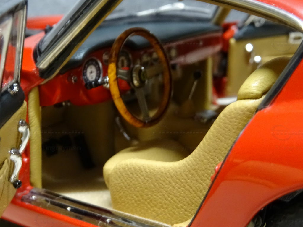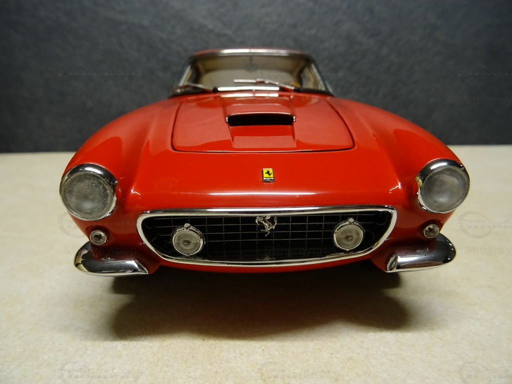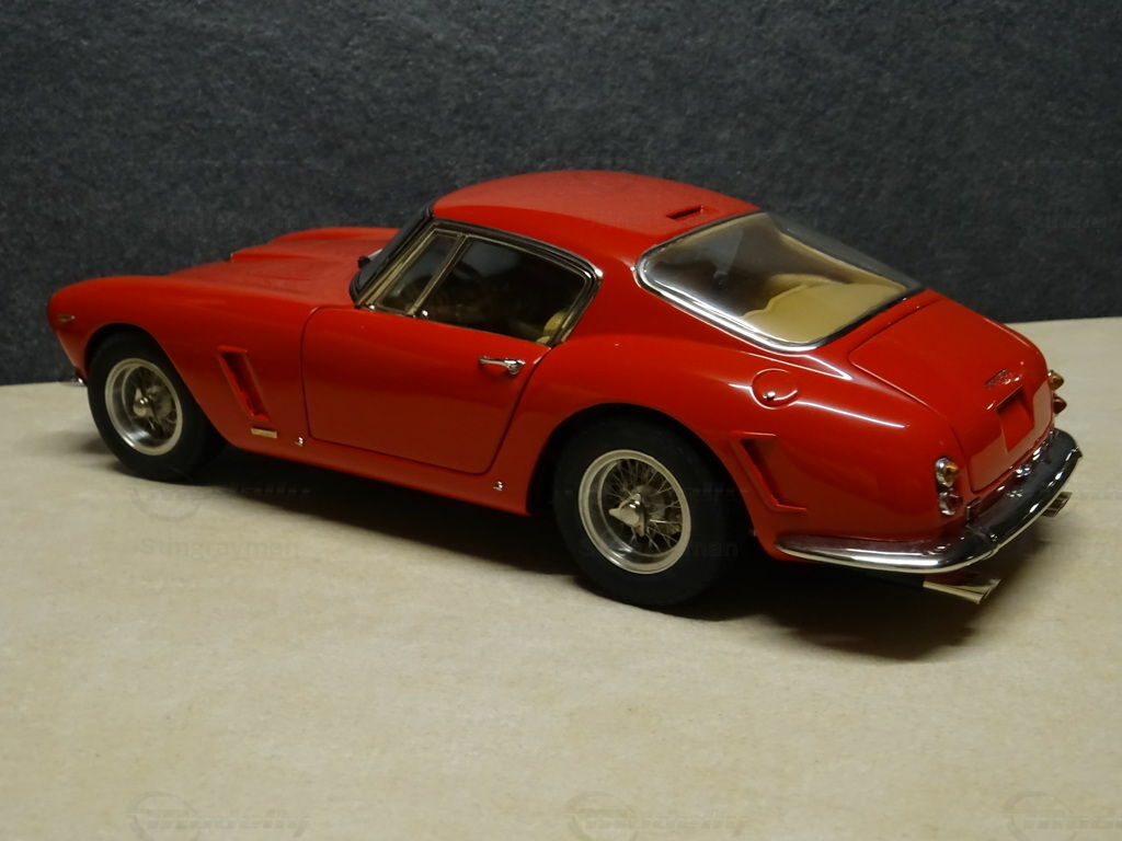 This scale model car, produced by CMC in 1/18 scale, is a precise replica of the iconic Ferrari 250 GT Berlinetta SWB. The attention to detail of this miniature is remarkable. The model is made of die-cast material, known for its high quality and durability. Particularly striking are the precise chrome details on the bumpers and the faithfully reproduced rims. The golden accents on the sides and the excellent replication of the Ferrari logo on the hood are also highlighted features of this model. Modelly member 'Stingrayman' has this detailed miniature in their collection, and the high level of precision and detail makes it a valuable piece for enthusiasts.