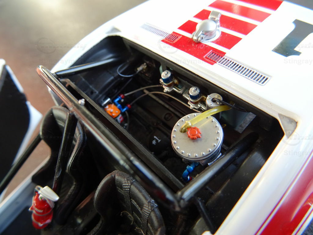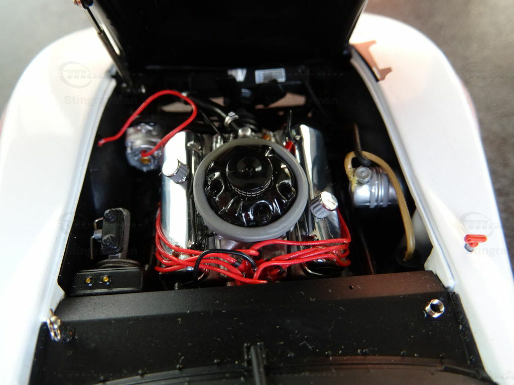The model car of the Chevrolet Corvette C3 427 Owens Corning in 1/24 scale, manufactured by Danburry Mint, is an impressive example of precision and craftsmanship. This miniature, part of Modelly member "Stingrayman's" collection, is made of high-quality die-cast material. Drivers sit in an authentically recreated interior while the exterior paintwork accurately represents the distinctive colors and lines of the original. The red and white color scheme with the characteristic racing stripes and the number "1" is particularly striking. The model builders at Danburry Mint paid great attention to detail, reflected in the carefully crafted headlights, front grille, and side mirrors.