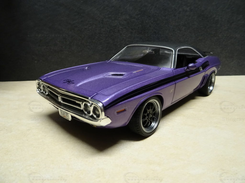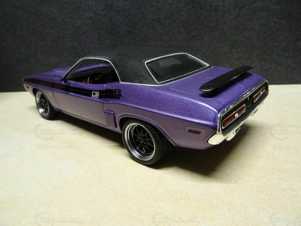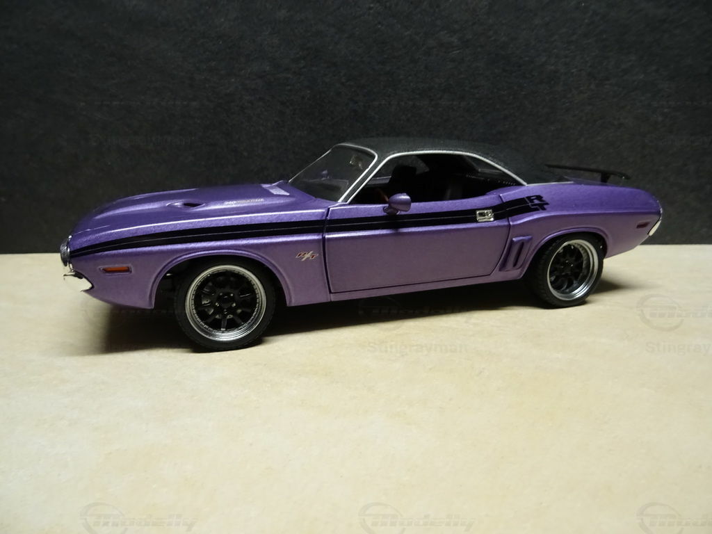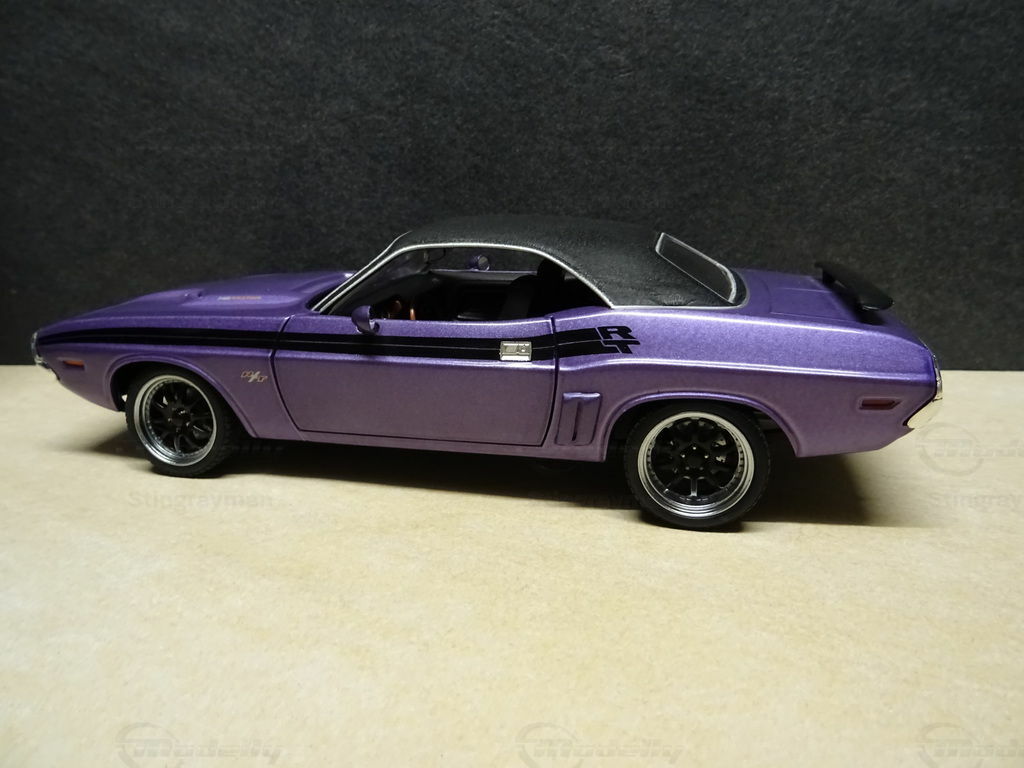 The model car included in the collection of Modelly member "Stingrayman" impresses with a striking paint job in a rich purple shade. This particular color scheme is known as "Plum Crazy Purple," one of Dodge's legendary colors that further accentuates the vehicle's aggressive design. Additionally, black side stripes are visible on the sides of the vehicle, reflecting the sporty design of the original. The model is further characterized by special, non-original wheels that give it a personalized touch. Subtle "R/T" badges can be found on the hood and sides, indicating the high-performance variant. The shiny chrome details on the bumpers, door handles, and grille further enhance the visual appeal of this model.
