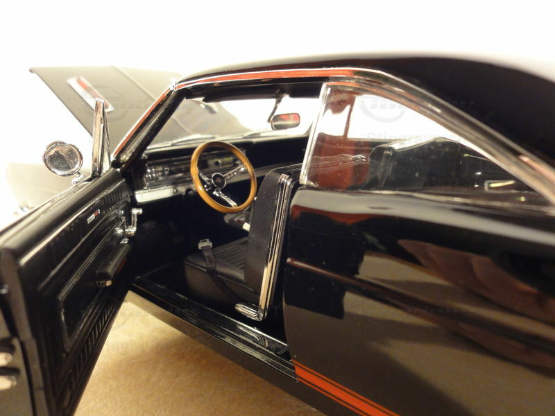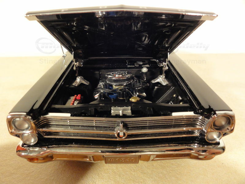 The 1/18 scale model manufactured by GMP replicates the Ford Fairlane GT/A with astonishing precision. The model's paint job is in a deep black color, capturing the classic and elegant look of the original. The attention to detail is evident, with features like the red side stripes and chrome accessories faithfully recreated. The model sports detailed headlights, a clear grille, and finely crafted wheel covers. The engine bay is particularly impressive, filled with many small details and faithful reproductions of the engine.