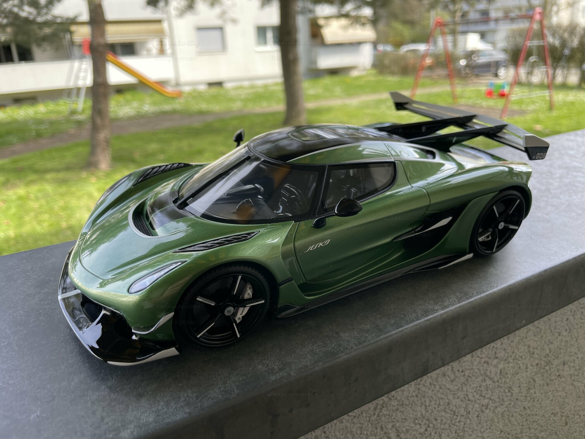 This model car, one of just 1,500 pieces worldwide, is more than just a collectible—it’s a celebration of the engineering and design of the Koenigsegg Jesko. The materials, especially the resin, allow for a high level of detail that captures the uniqueness of the original. For collectors and enthusiasts of GT Spirit models, this car is a must-have. The special color in metallic green with contrasting black and silver makes this model a real eye-catcher, especially due to its aerodynamic silhouette and the intricate carbon look of the wings.