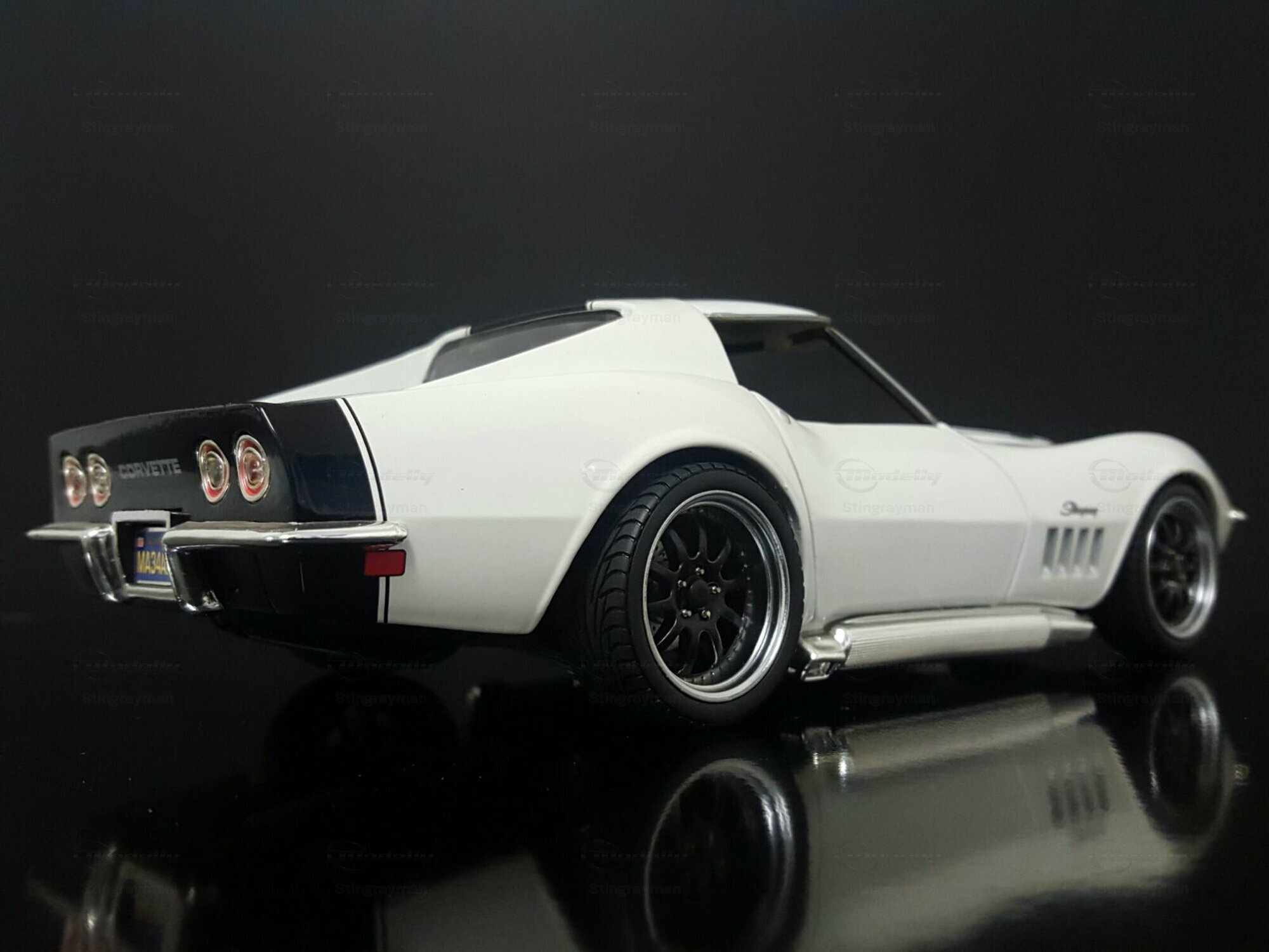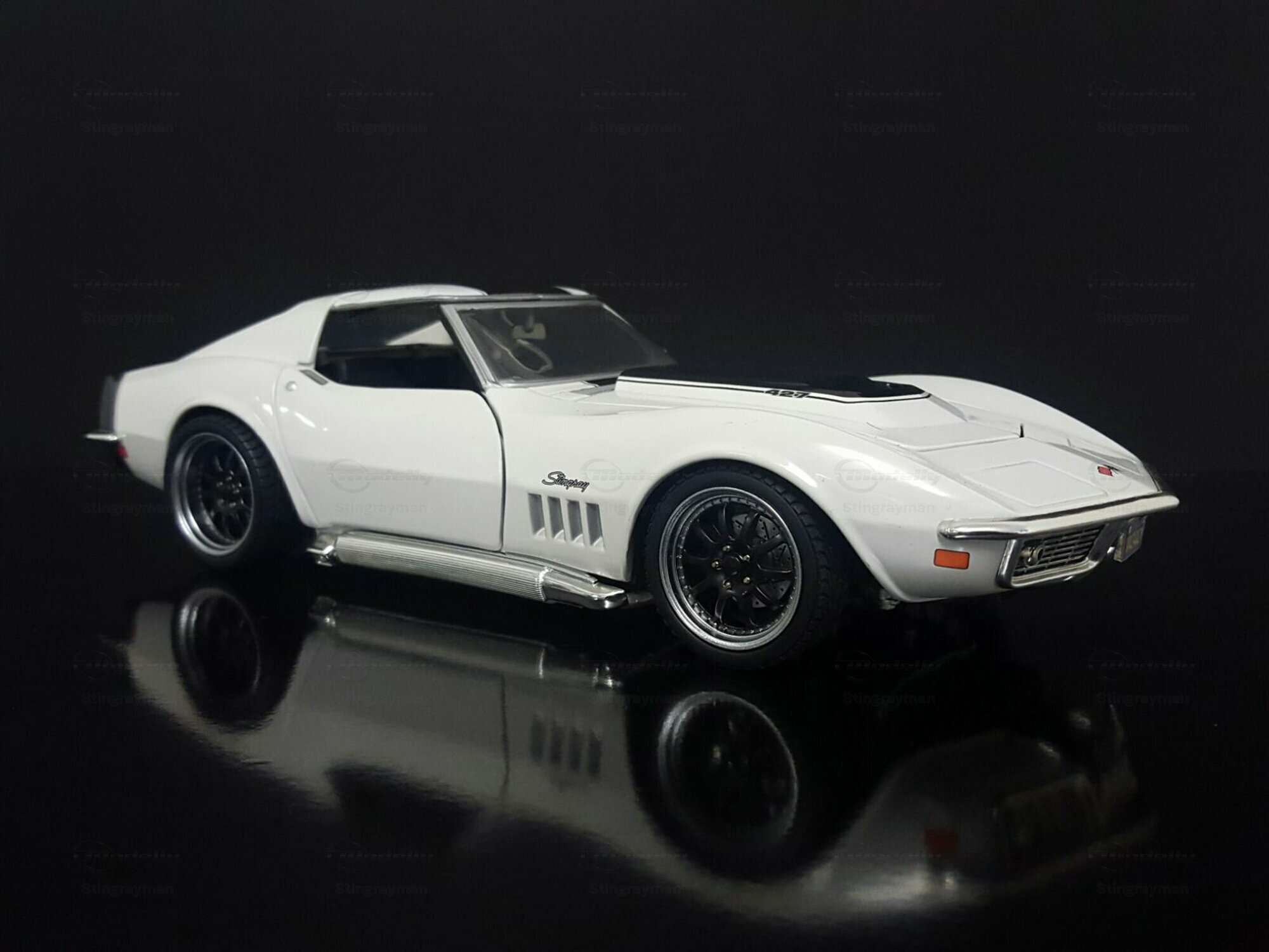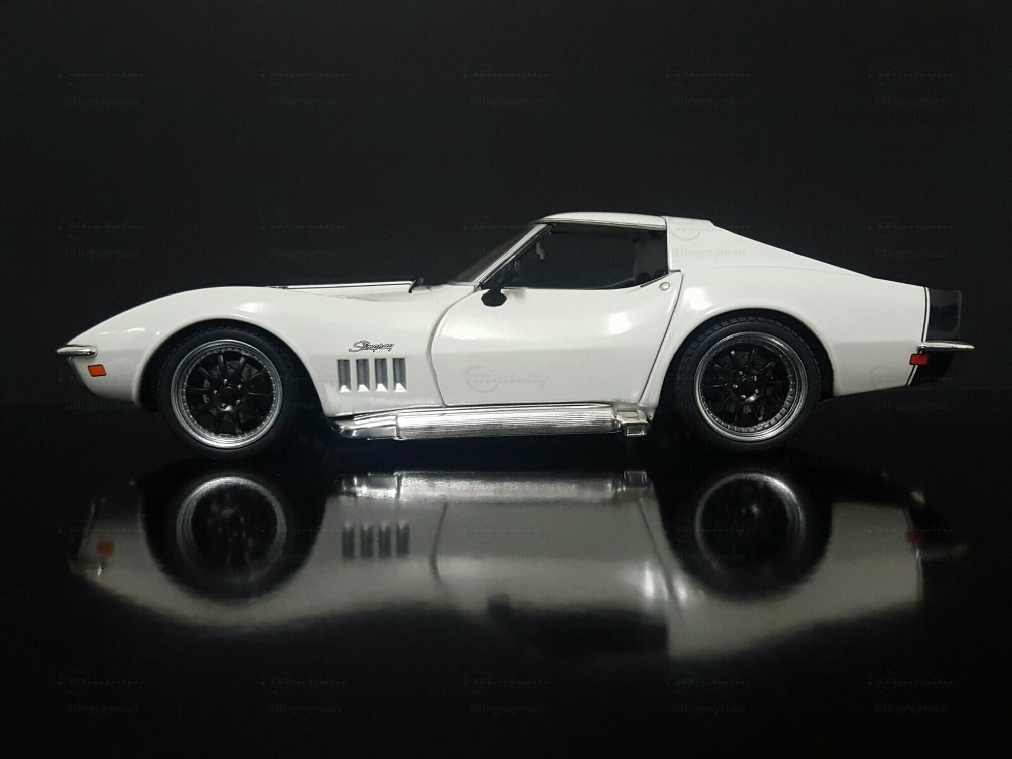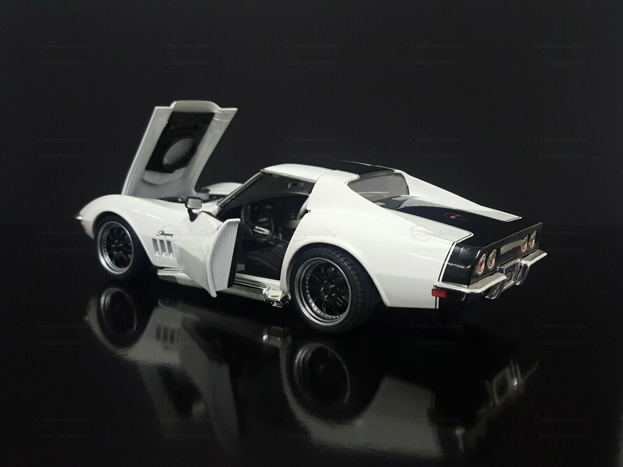 Important note for collectors: the piece shown here is a modified one-off and is not the factory product from Hot Wheels. The base is a 1/18 diecast model. It’s in the collection of the Modelly member “Stingrayman.” From the photos you can see the white paint with a subtle black hood insert and a blacked-out rear section. The side pipes are silver and follow the lower sill line. The wheels have been swapped for black multi-spoke, multi-piece rims with a polished outer lip; the exact wheel maker can’t be identified from the pictures, but the wheels look larger than stock. That gives the car a tighter stance and lower ride height. The “Stingray” script sits correctly behind the front wheel arches, and the three gill openings are there. Up front the model has the narrow bumper horns; at the rear you can see the four round taillights and the molded bumper. The interior is all black, with the T‑top separator and a classic two-spoke steering wheel. The headlight covers are shown closed. The Hot Wheels 1/18 diecast gives a solid feel and crisp panel lines on the hood, doors and seams. Because of the owner’s changes — especially wheels and rear styling — the look differs from the stock release.