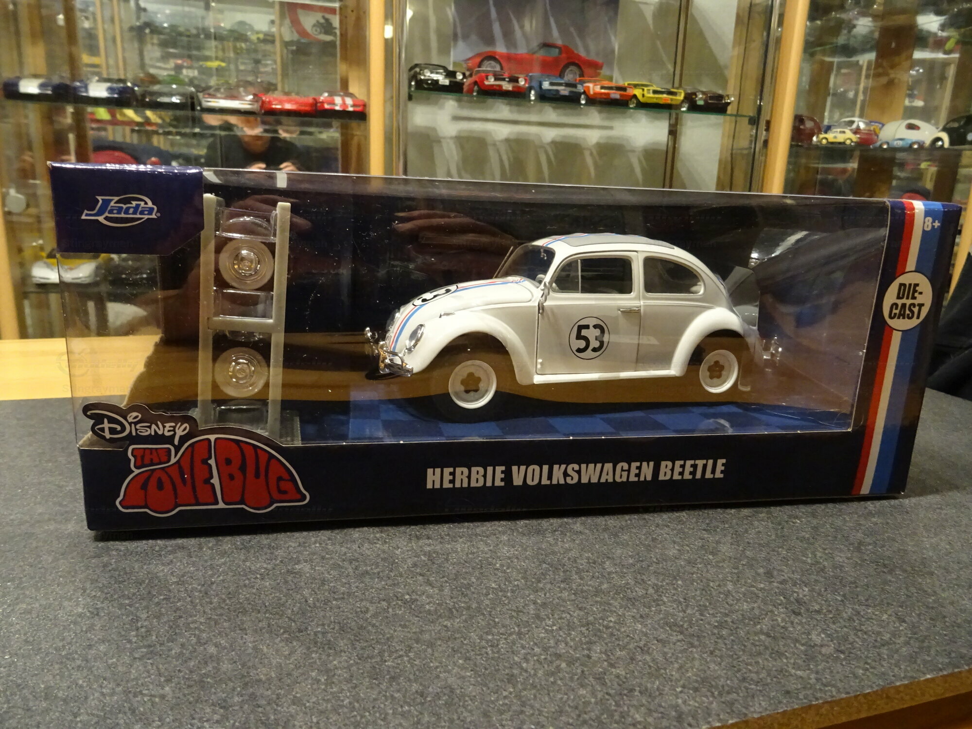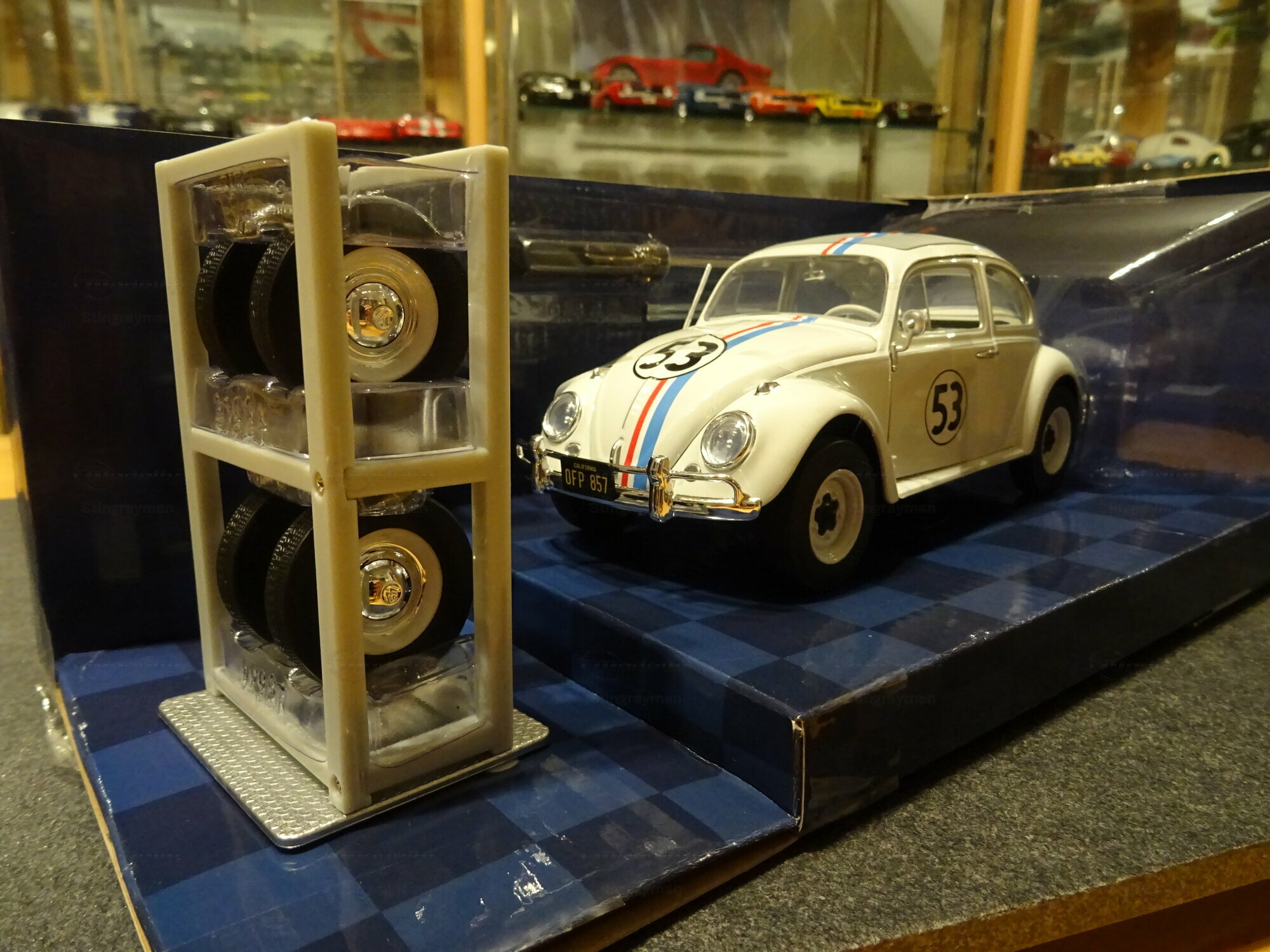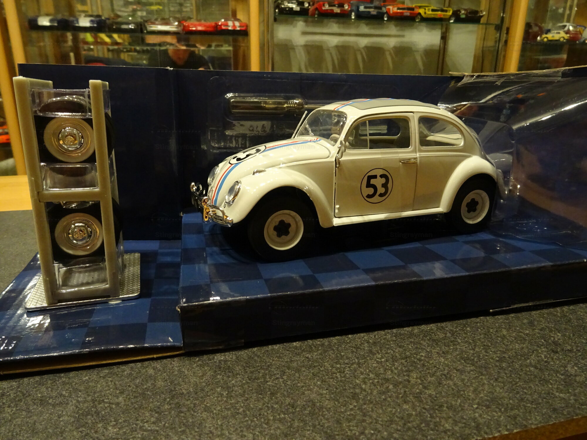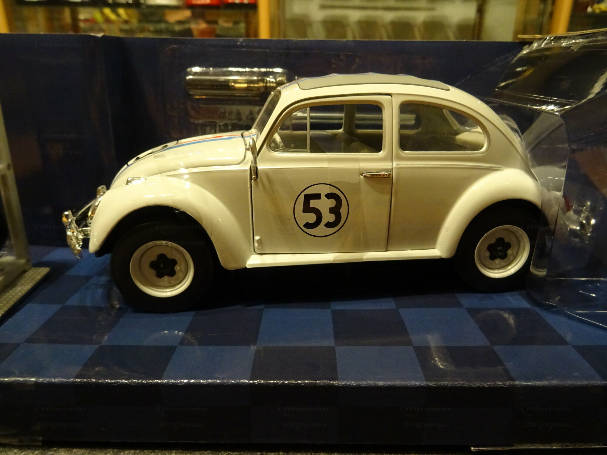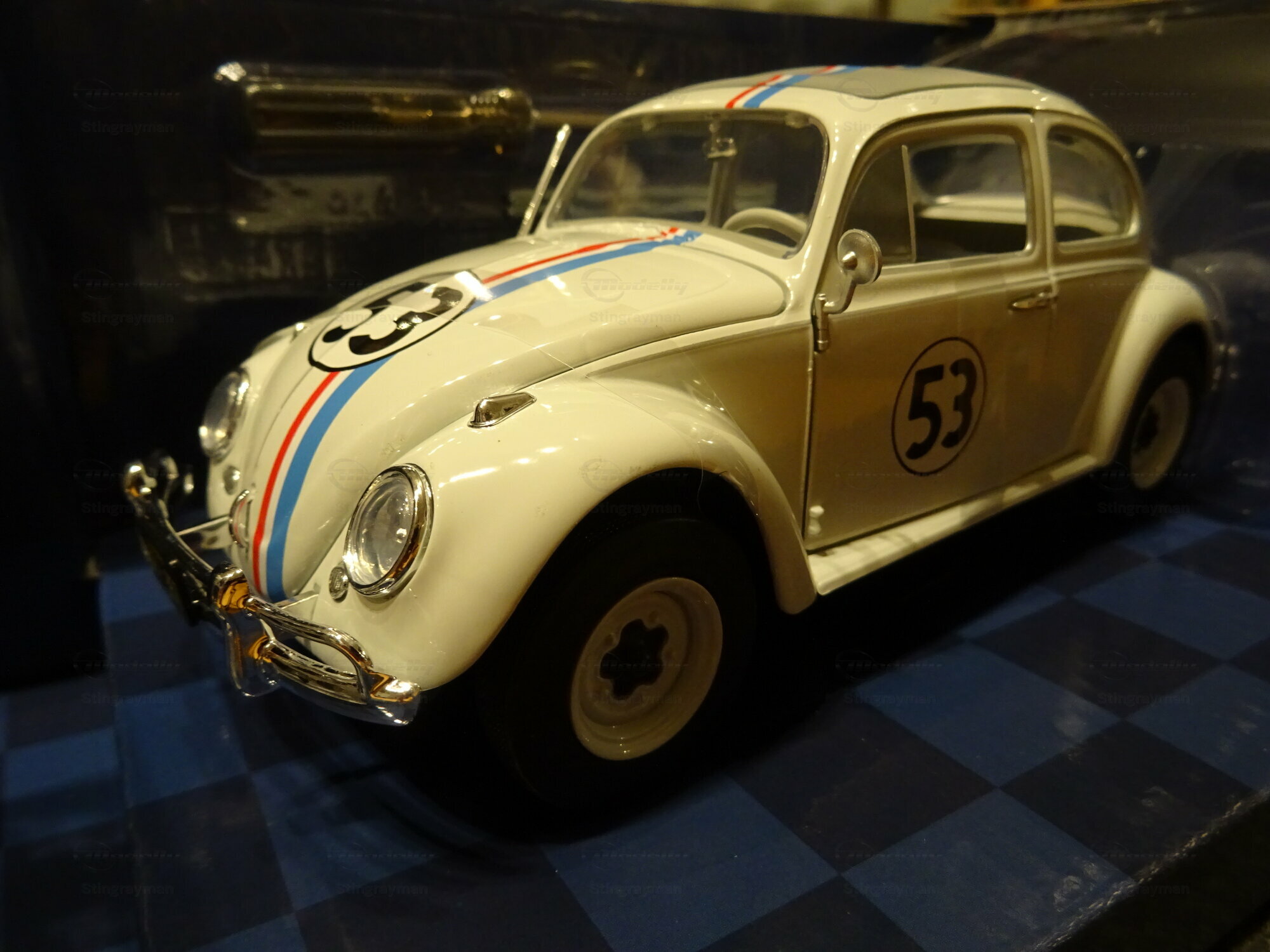 The paint scheme follows the familiar appearance of the film-related Volkswagen Beetle. The base color is white. On top of that, thin blue and red stripes run down the center, starting on the hood, continuing across the roof, and carried on to the rear. The doors each carry the black number 53 inside a white circle with a black outline; the front also shows the 53. This graphic design is practical, easy to read, and closely tied to the Herbie identity. The model also has a clean separation between body color, window frames, and chrome parts. From a model collector’s point of view, the appeal of this piece comes mainly from the famous silhouette, the clearly visible movie graphics, and the included accessories. The Beetle’s shape comes across well at this scale: curved roof, round side windows, pronounced wheel arches, and compact dimensions. Especially in the packaging shown, the model looks neatly presented, and details like the extra headlights, wheel inserts, and decal lines make the Herbie connection immediately obvious. For a collection focused on movie cars, Volkswagen models, or pop culture, this miniature from “Stingrayman’s” display case is a clearly identifiable piece with an easy-to-understand theme.