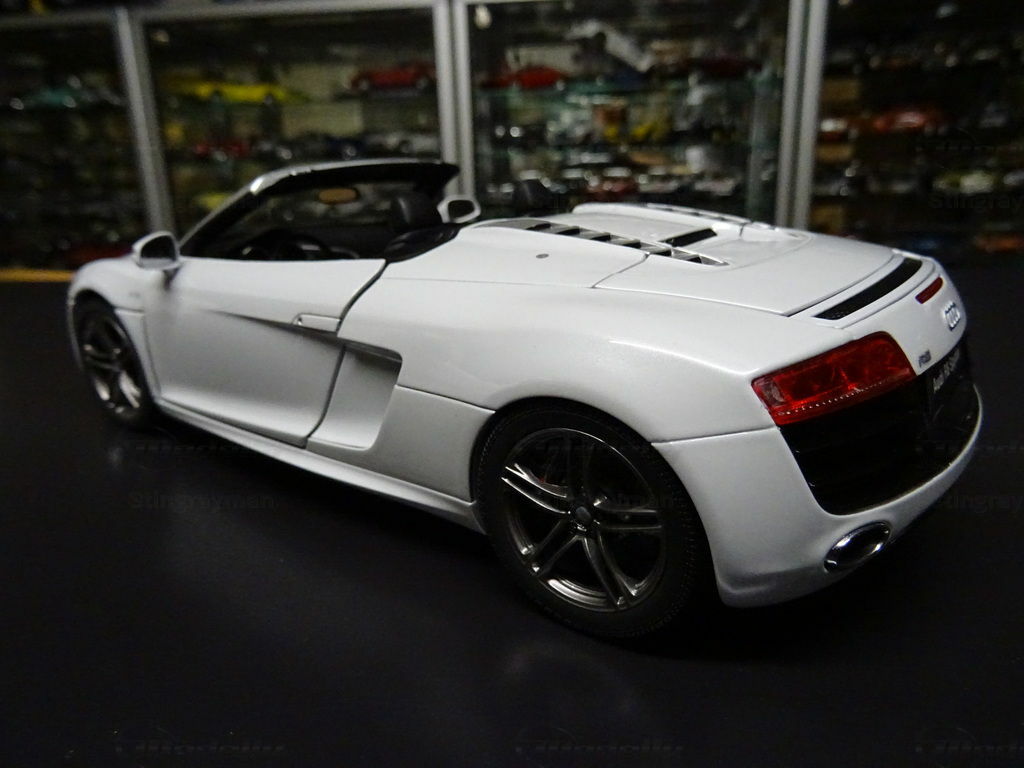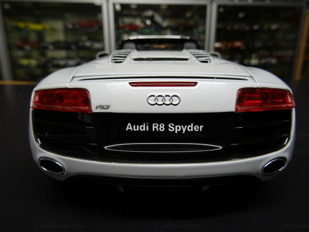 The model car in 1/18 scale presented here was manufactured by Kyosho and is an impressive replica of the Audi R8 Spyder V10 5.2. Model car collectors from around the world appreciate the accuracy and quality of craftsmanship that Kyosho demonstrates in this miniature. The model car is made of die-cast material, known for its durability and longevity. Kyosho models are renowned for their precision and attention to detail, which is evident in this model. The body is painted in an elegant white, and the true-to-life wheels and tires blend seamlessly into the overall look. Every detail, from the headlights to the mirrors, has been carefully replicated to capture the look and feel of the real vehicle as accurately as possible.