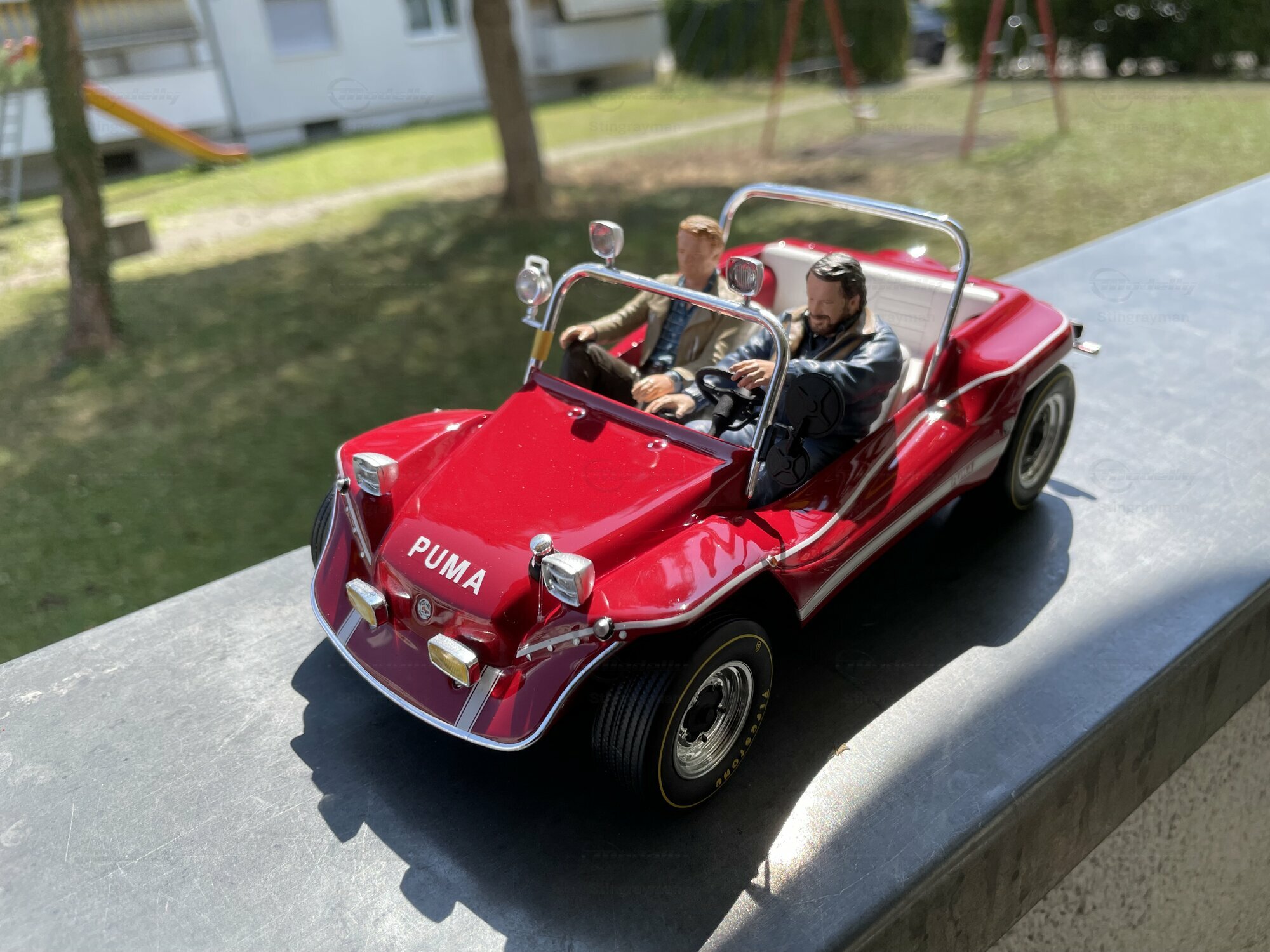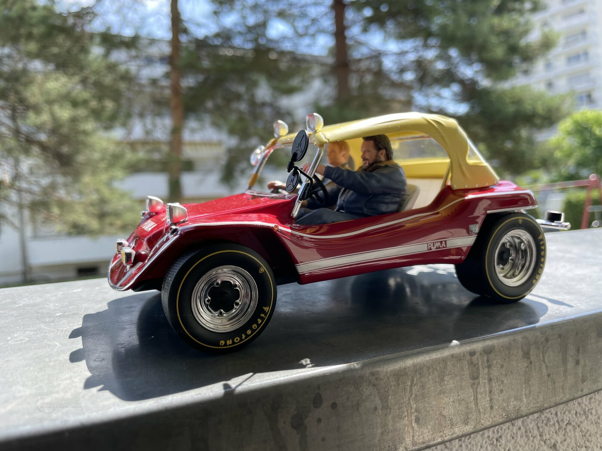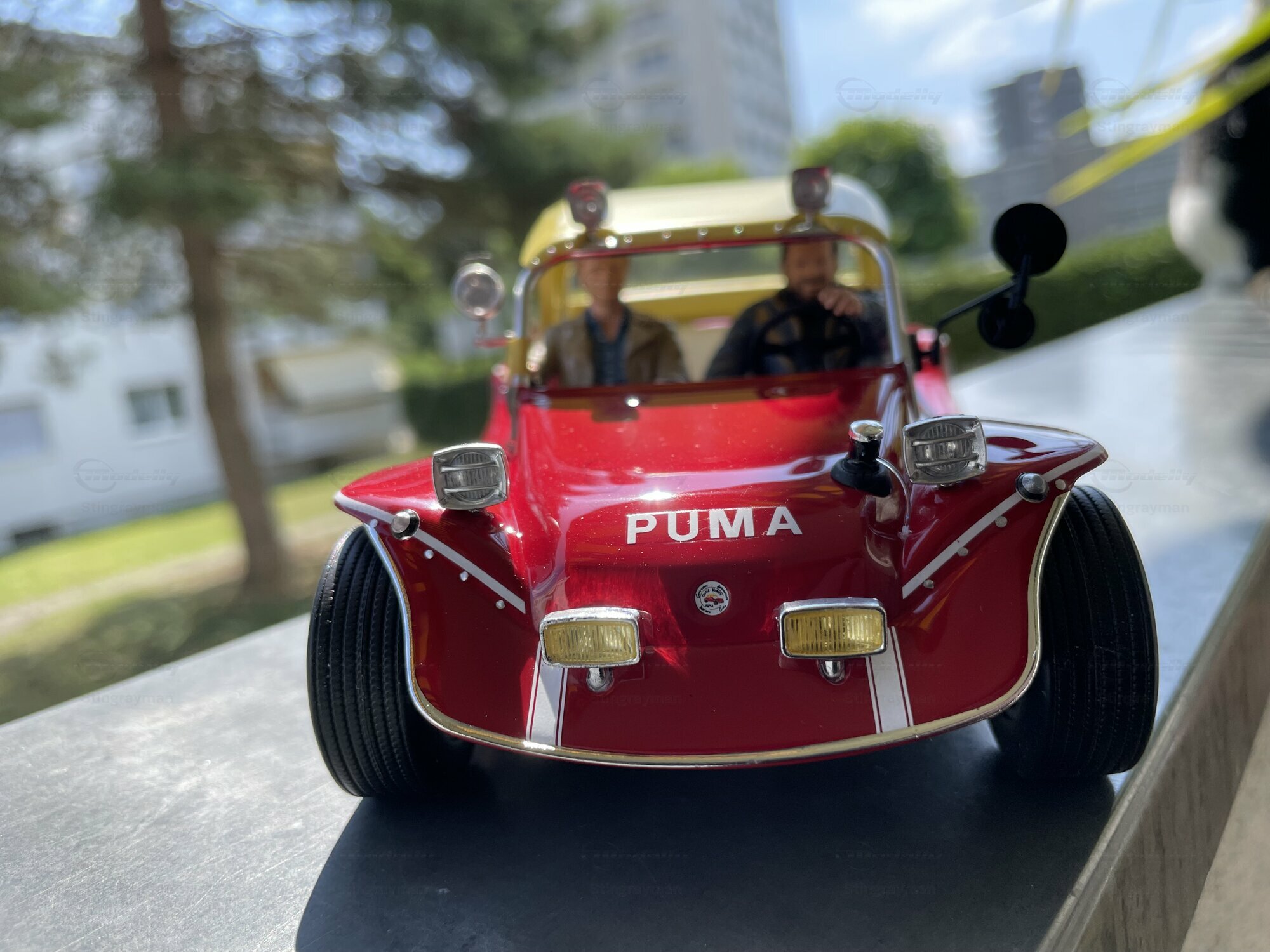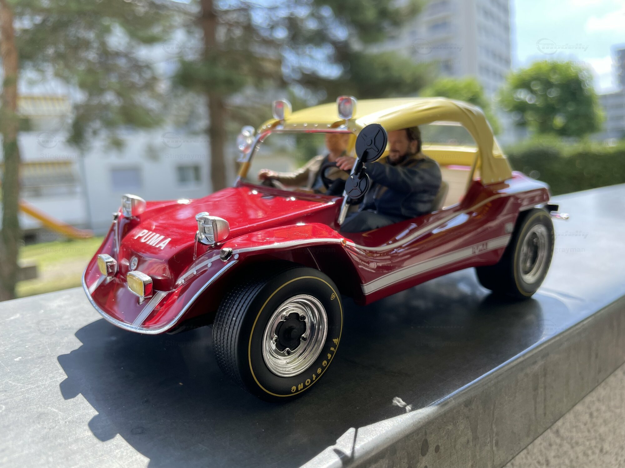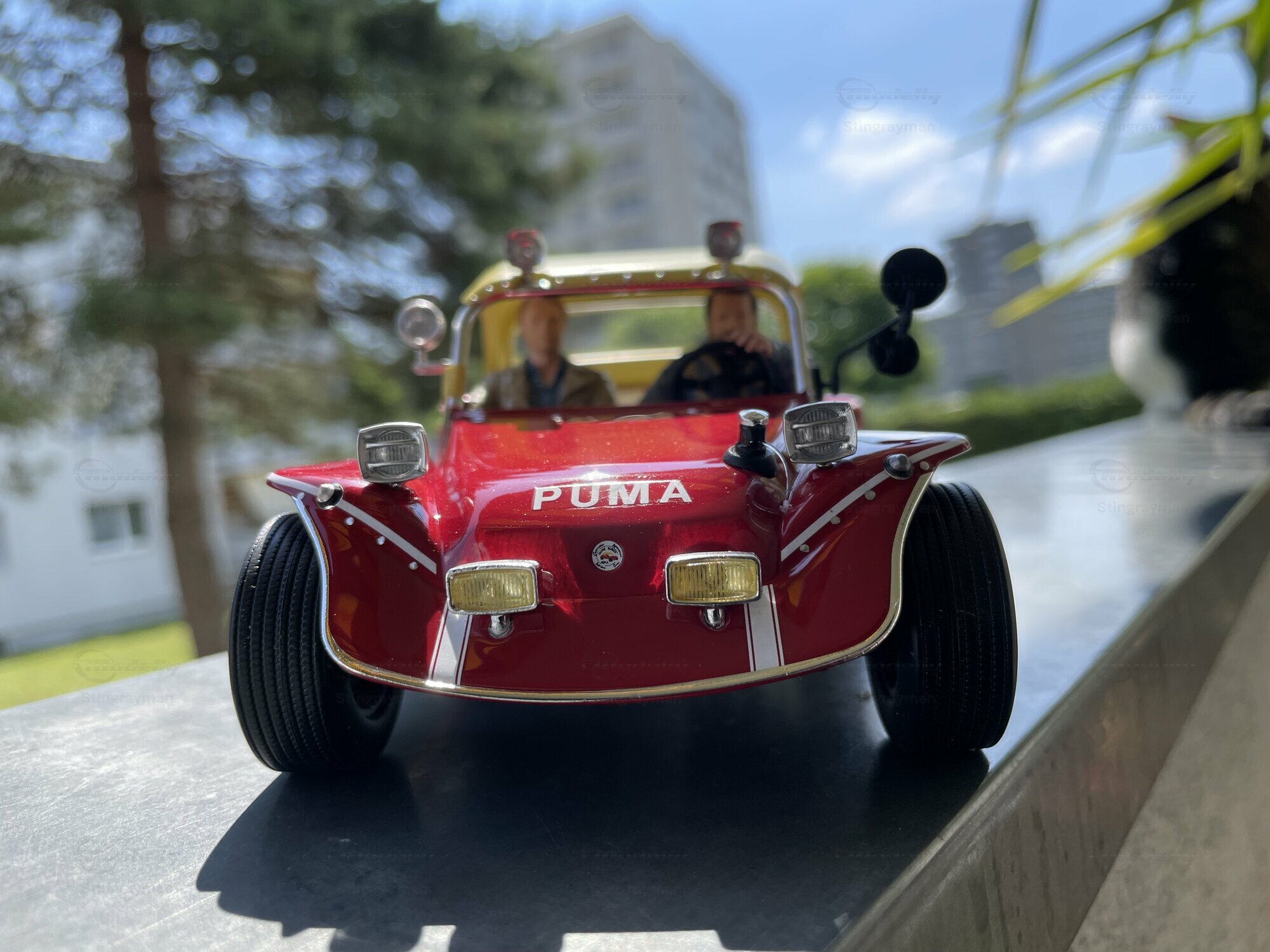 This 1/18 Scale model car showcases impressive details, such as the accurately replicated headlights, the slightly curved windshield, and the typical Firestone tires that were also used in the original vehicle. In the photo, clear lines and precise proportions are visible, as well as the labeling and logo of the model proudly displaying the "PUMA" name on the front. It's interesting to note that the original Puma Dune Buggy had an air-cooled 1,600-cm³ (97.6 cubic inches) engine and a fiberglass chassis construction, giving it its characteristic lightness.