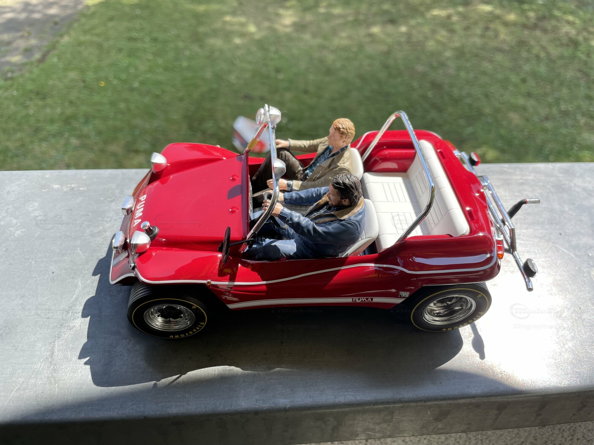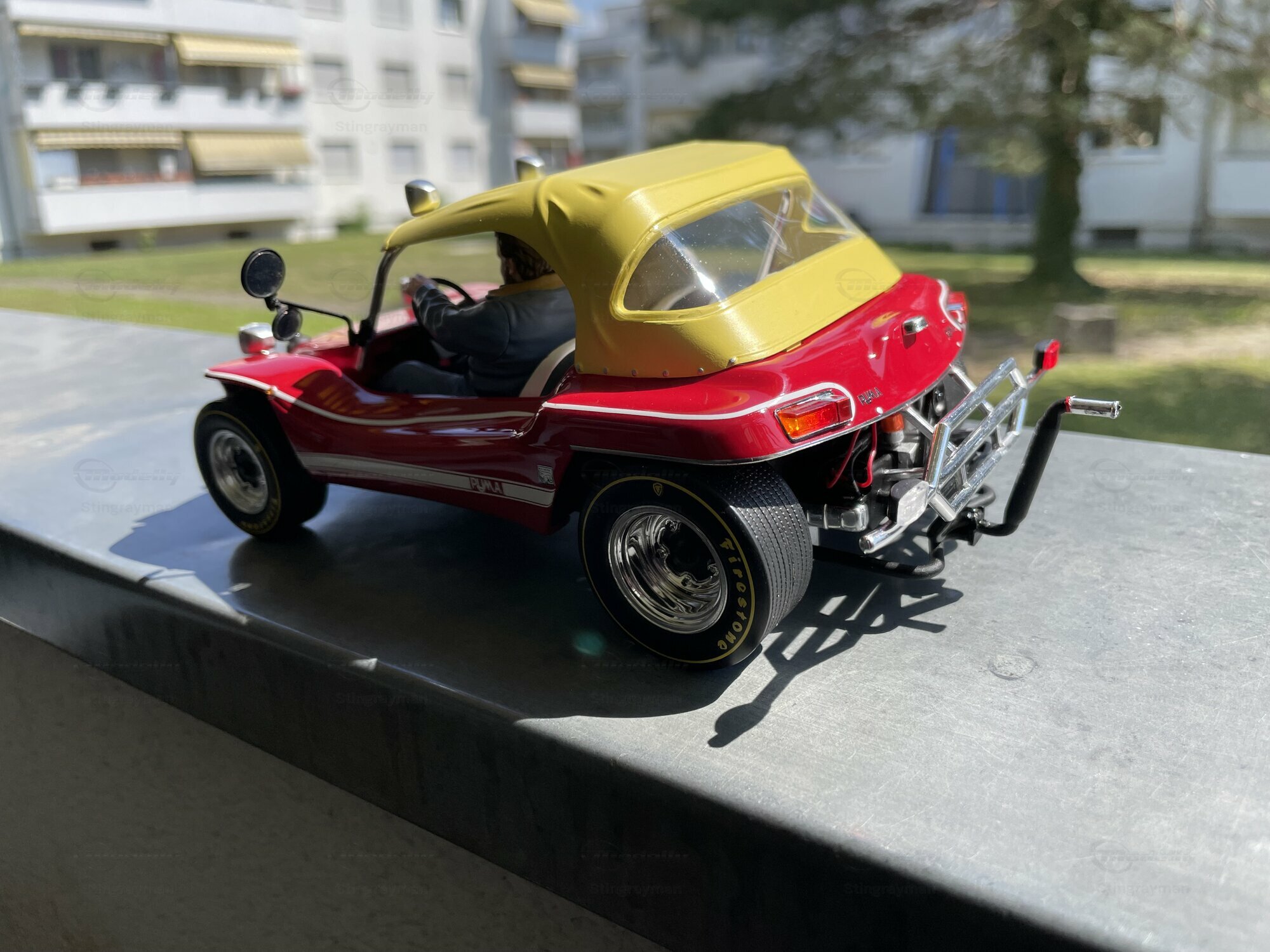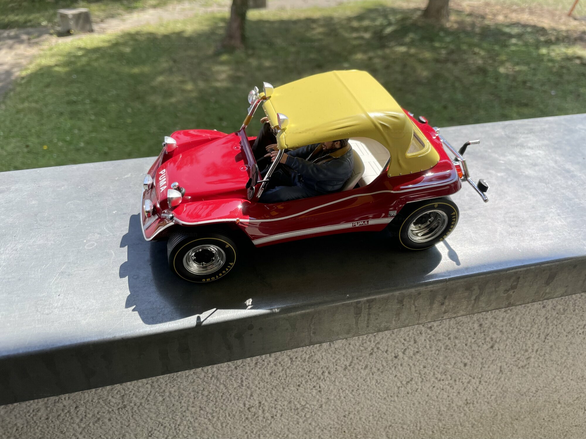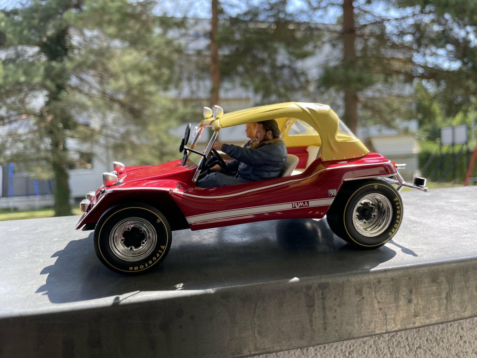 The model car shown in the 1/18 scale was crafted by LaudoRacing, showcasing meticulous craftsmanship and detailed accuracy. This is a fascinating piece for collectors, depicting the elegant lines and robust construction of the original in miniature form. The model maker LaudoRacing used high-quality materials, especially resin, giving the model its fine details and durability. This miniature, belonging to the collection of Modelly member "Stingrayman," displays the classic red color and yellow cover that make the original Puma Dune Buggy so distinctive.