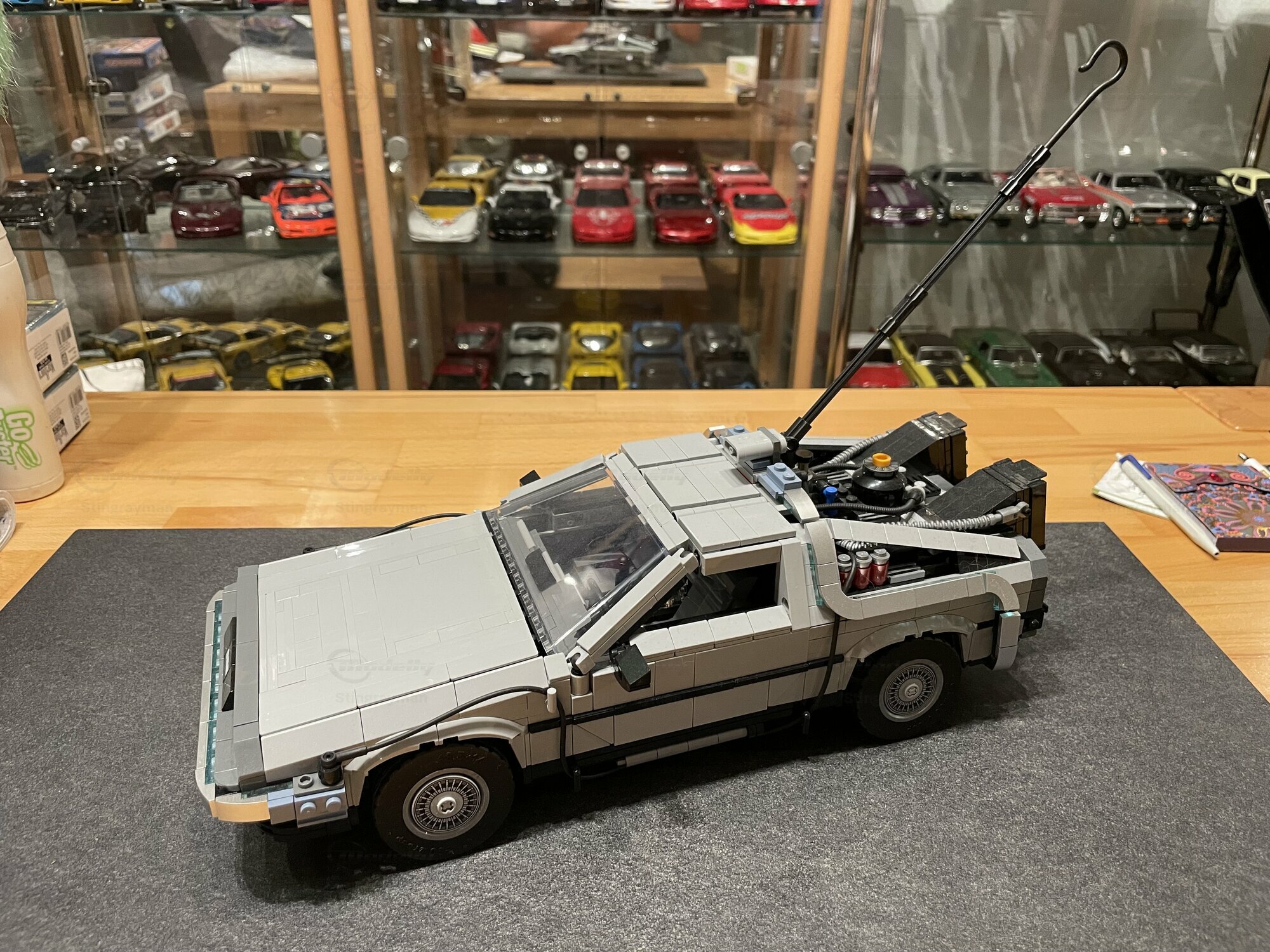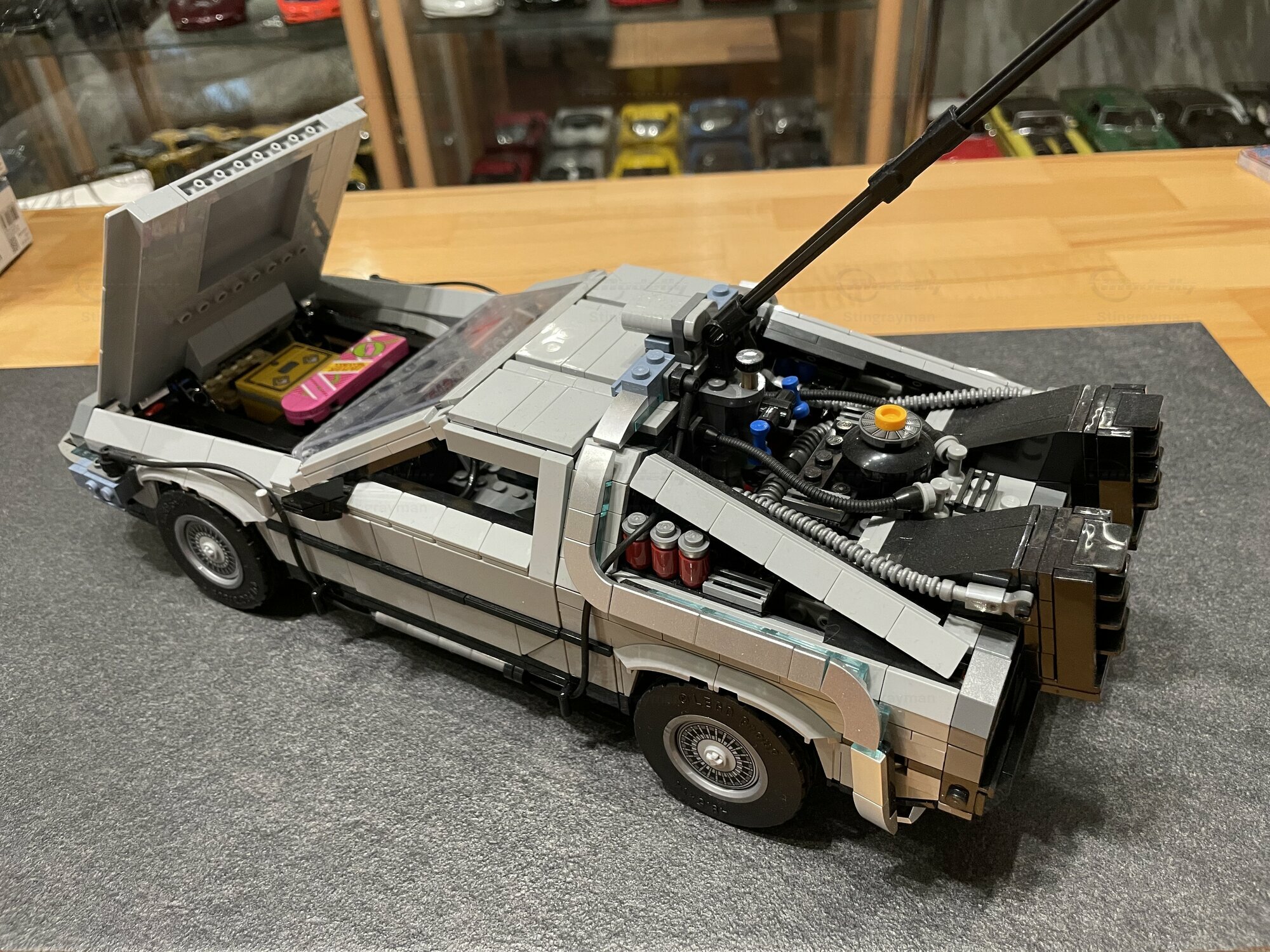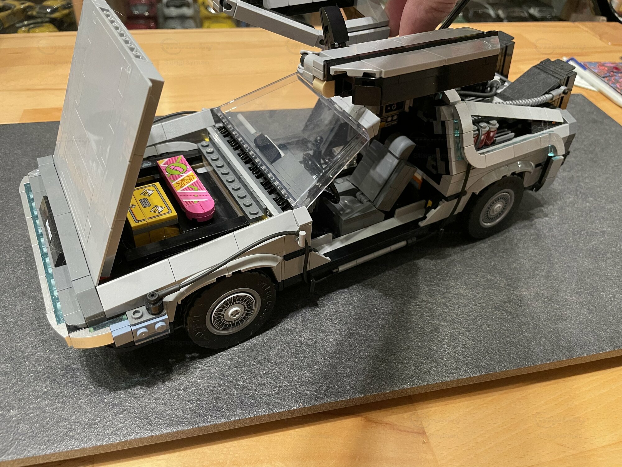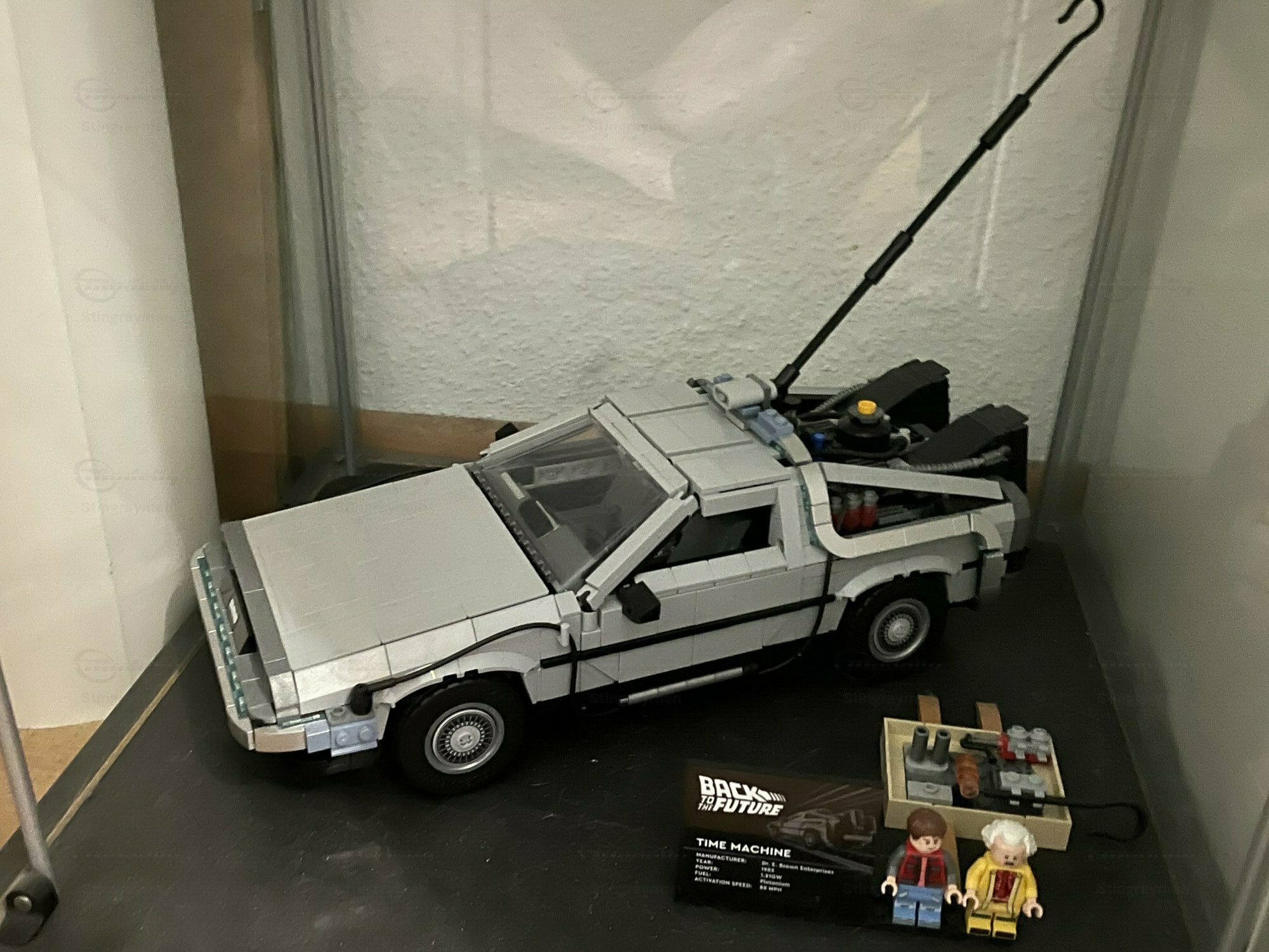 The pictured miniature is from collector “Stingrayman” and shows the DeLorean DMC-12 Time Machine as a LEGO model at about 1/10 scale. The kit is made from plastic — typically ABS in LEGO sets — and evokes the stainless look of the real car with grey elements and crisp lines. From the photos you can see several working features: the gullwing doors open, the front trunk is accessible and contains accessories like the yellow plutonium case and a pink hoverboard. On the roof there’s the tall rod with a hook that references the famous lightning scene. The rear shows the movie‑style fins, hoses and add‑on units; wiring runs along the sides to the big reactor assembly at the back. The interior has two seats, a center console and dashboard; with the doors open you can clearly see the seat layout. The windows are made from transparent pieces while the wheels have detailed hubcaps. The color scheme is dominated by a neutral grey with black accents along the bumpers; you can also spot the straight front edges and the slightly dropped nose that match the real DeLorean DMC-12. As a 1/10 LEGO model it’s big enough to look impressive in person and shows the movie tech in a believable way. It reads right, even without paint — which fits the original car that was unpainted anyway.