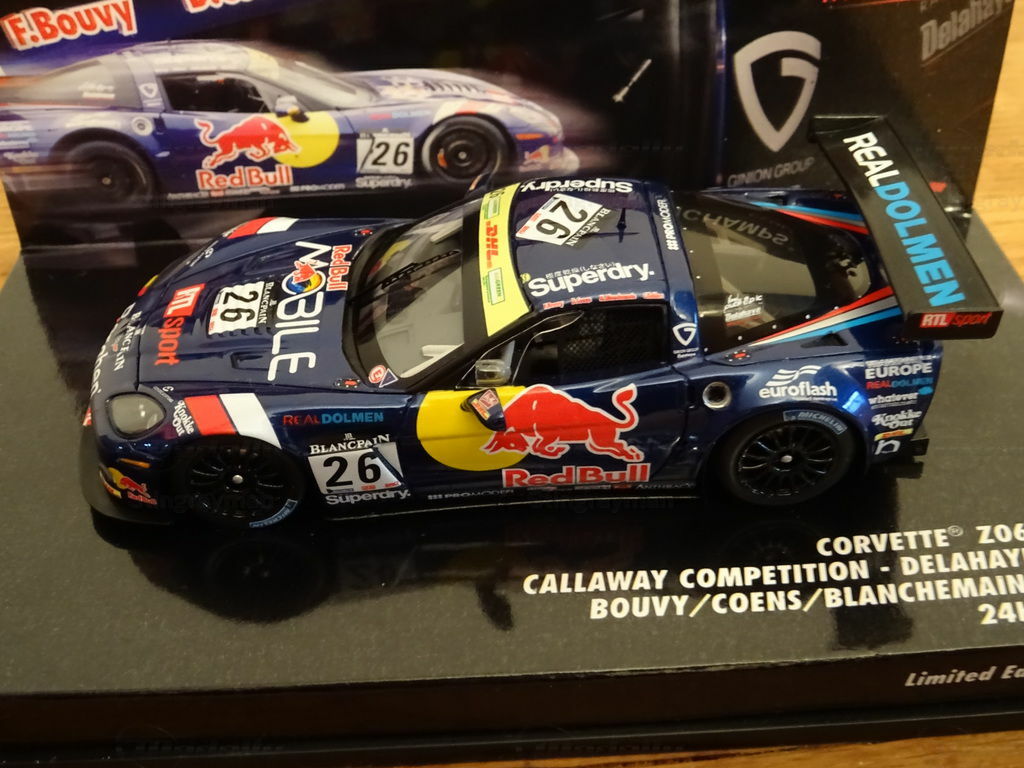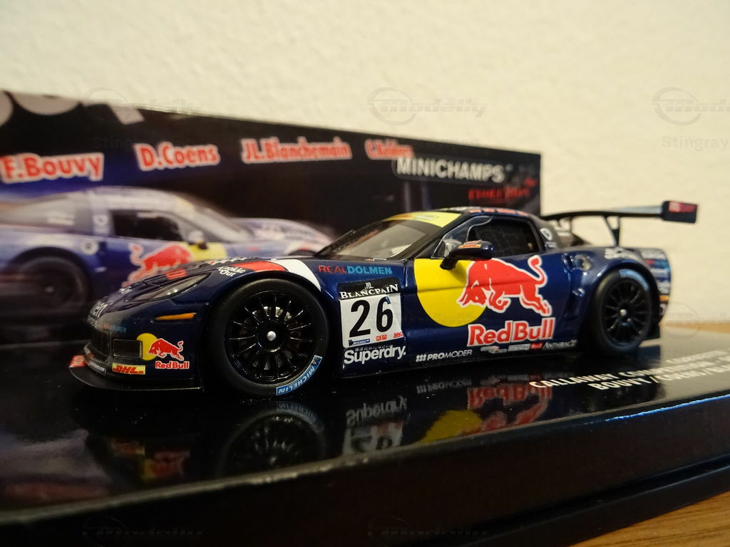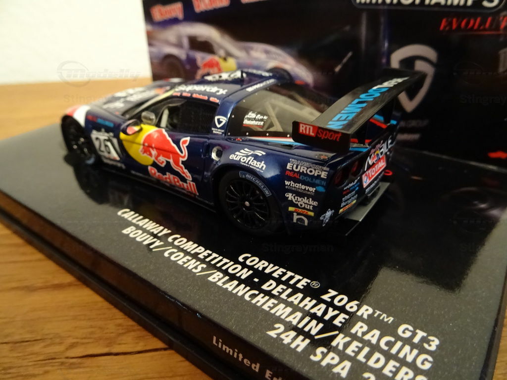 The pictured scale model version produced by Minichamps Evolution in a scale of 1/43 showcases the Chevrolet Corvette Z06R GT3 Callaway Competition with a striking livery. The predominantly dark blue color with the prominent red bull on the sides is unmistakable. This bull symbolizes the main sponsor Red Bull. Additionally, logos of other sponsors like Superdry, Blancpain, DHL, and Real Dolmen can be seen on the vehicle. This attention to detail highlights the connection between sponsorship and motorsport, setting this model apart from others.