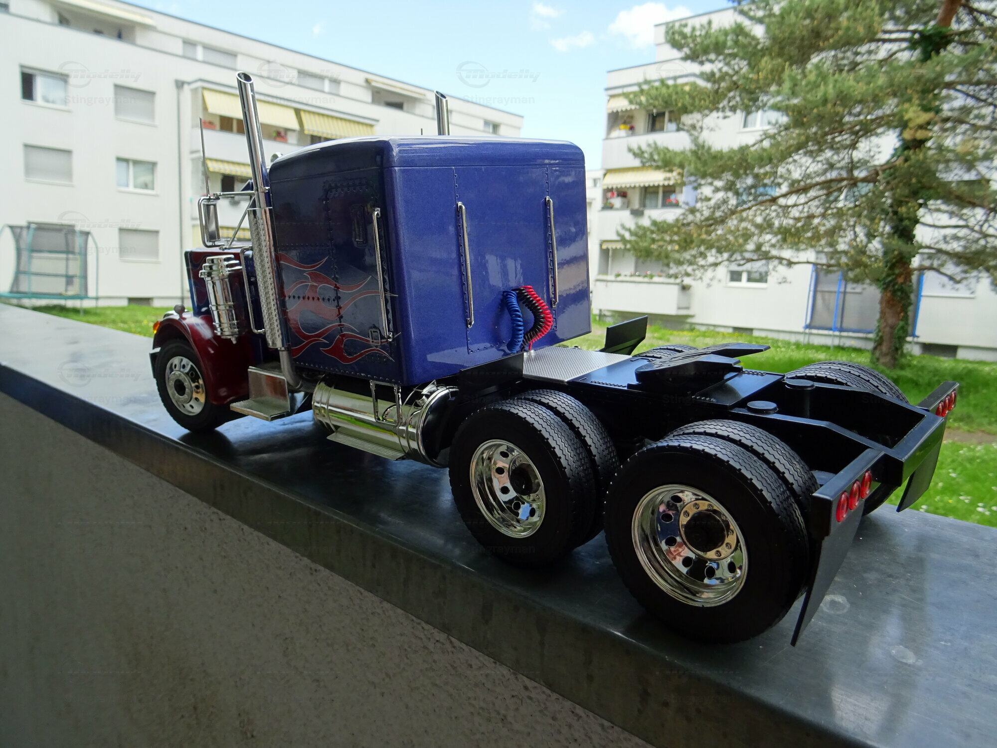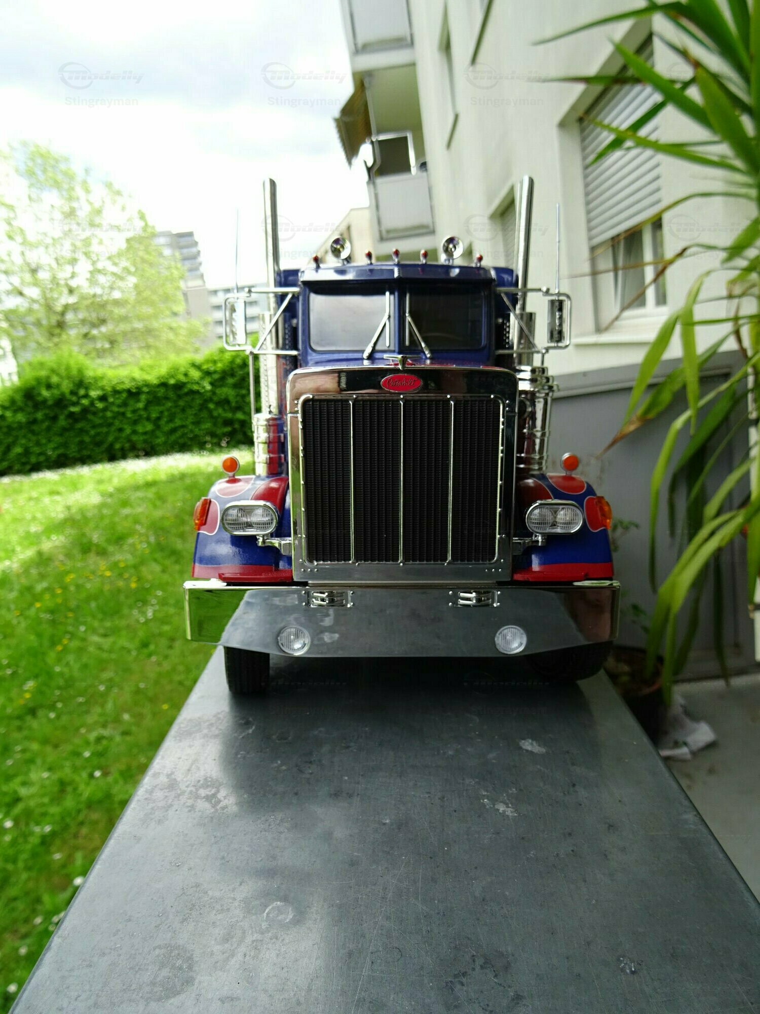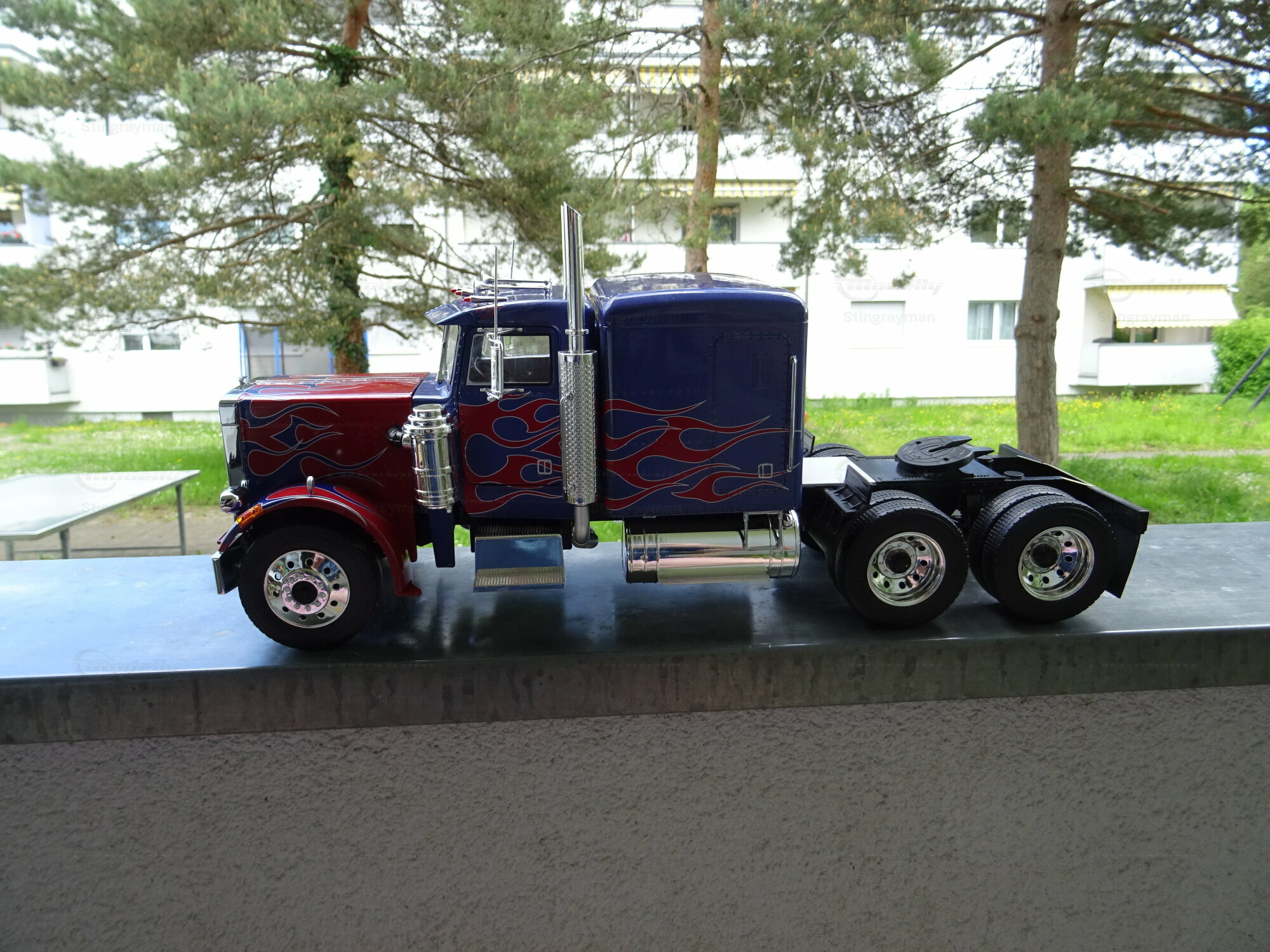 The miniature of the Peterbilt 359 depicted here in a 1/18 scale by Road Kings is an exquisite example of the attention to detail and craftsmanship that goes into model-making. Crafted from die-cast material, the model impresses with its stability and precise manufacturing. With a length of about 30 centimeters (11.8 inches) and a detailed replica of the original, this miniature is suitable for collectors and commercial vehicle enthusiasts alike. In the photos provided by Modelly member "Stingrayman," you can clearly see the care taken in placing the markings and emblems, with the distinctive Peterbilt badges visible on the front and sides for authenticity.