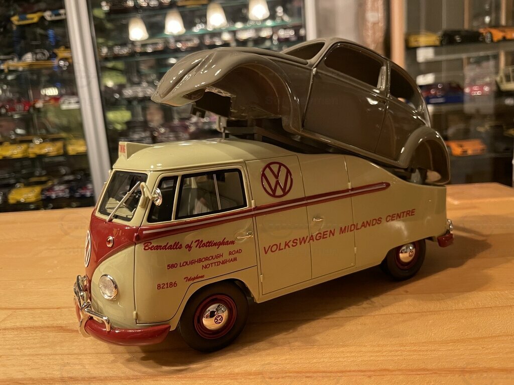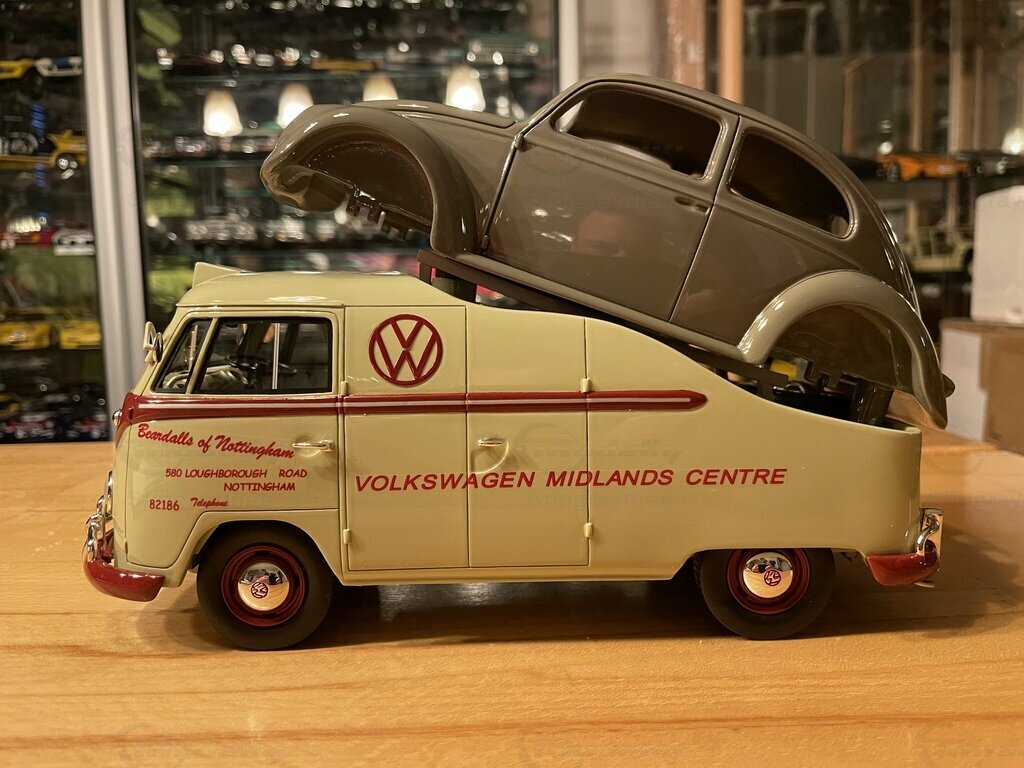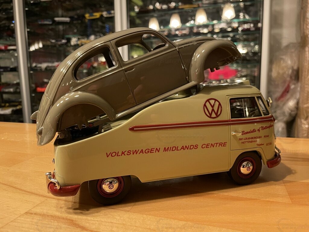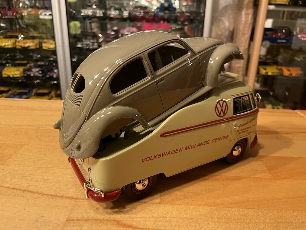 The model car from Schuco Pro.R roadcars in scale 1/18 is a detailed replica of the historical VW T1a Midlands Centre Bully with Brezelkäfer body. It is a high-quality reproduction made of resin, a material known for its fine detailing and durability. This model was specifically designed for model train and car enthusiasts and is part of the collection of Modelly member "Stingrayman". The attention to detail is immediately apparent: the "Brezelkäfer" on the top of the transporter stands out with its characteristic rear hatch and authentic shapes.