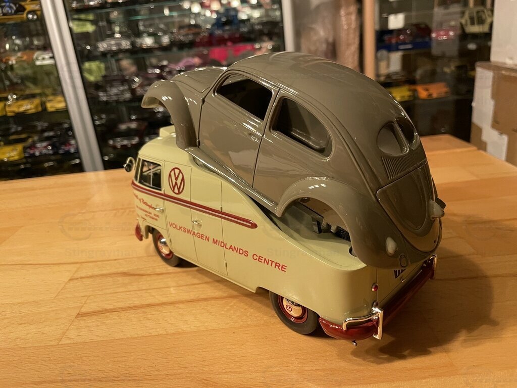 A unique feature of this model car is the transport construction, which gives the T1a a distinctive look. The upper part is specially adapted to securely transport another vehicle, in this case a "Brezelkäfer". This double-decker construction was actually used in the past to efficiently deliver new vehicles to dealers. Furthermore, the front headlights are carefully replicated, and the placement of emblems and badges has been faithfully reproduced. Modelly member "Stingrayman" owns this model, which provides insights into a bygone era of automobile transport. Readers and potential collectors will surely find this model from Schuco Pro.R roadcars in scale 1/18 fascinating, not only for its historical significance but also for its remarkable build quality and detailing.