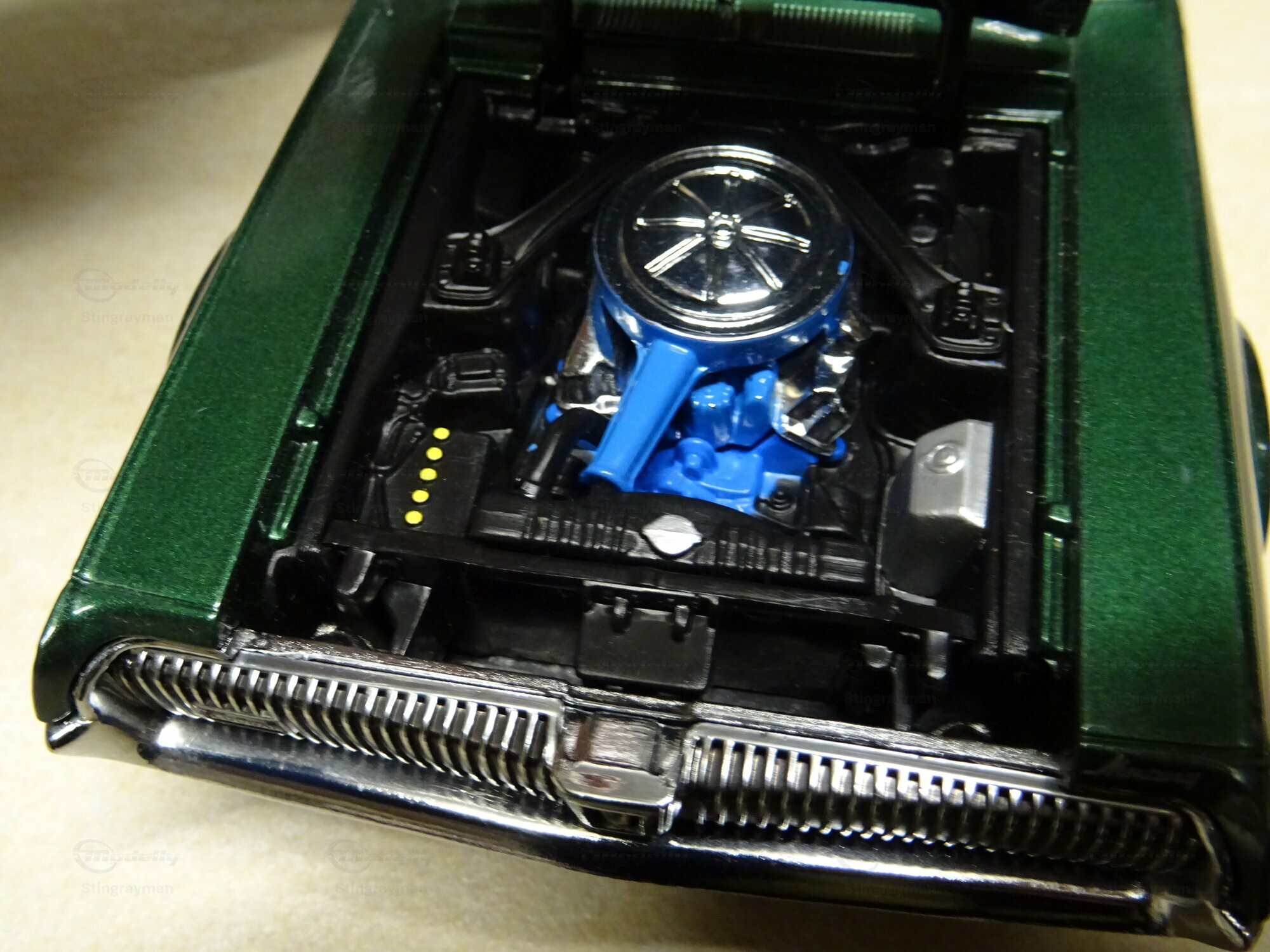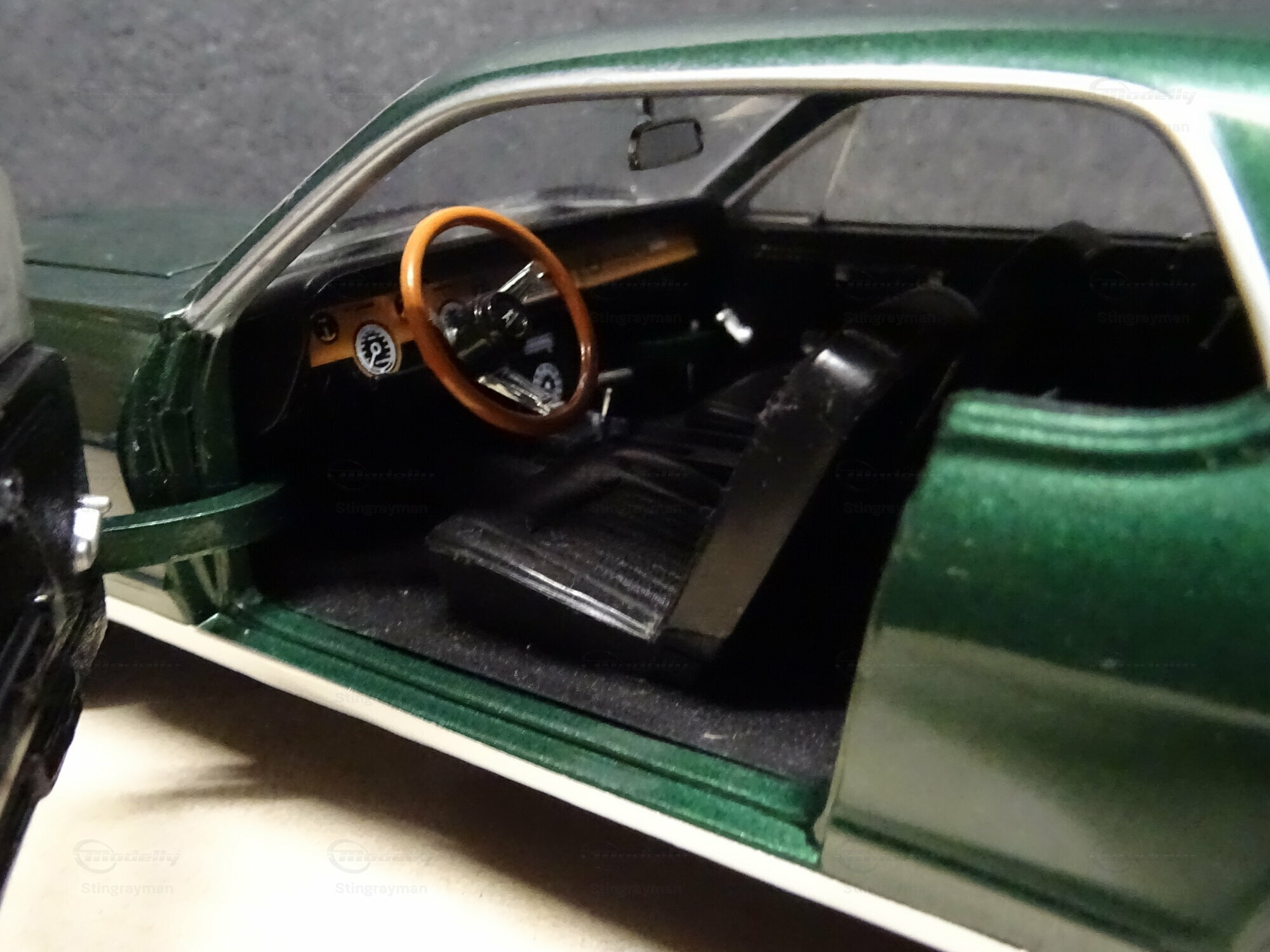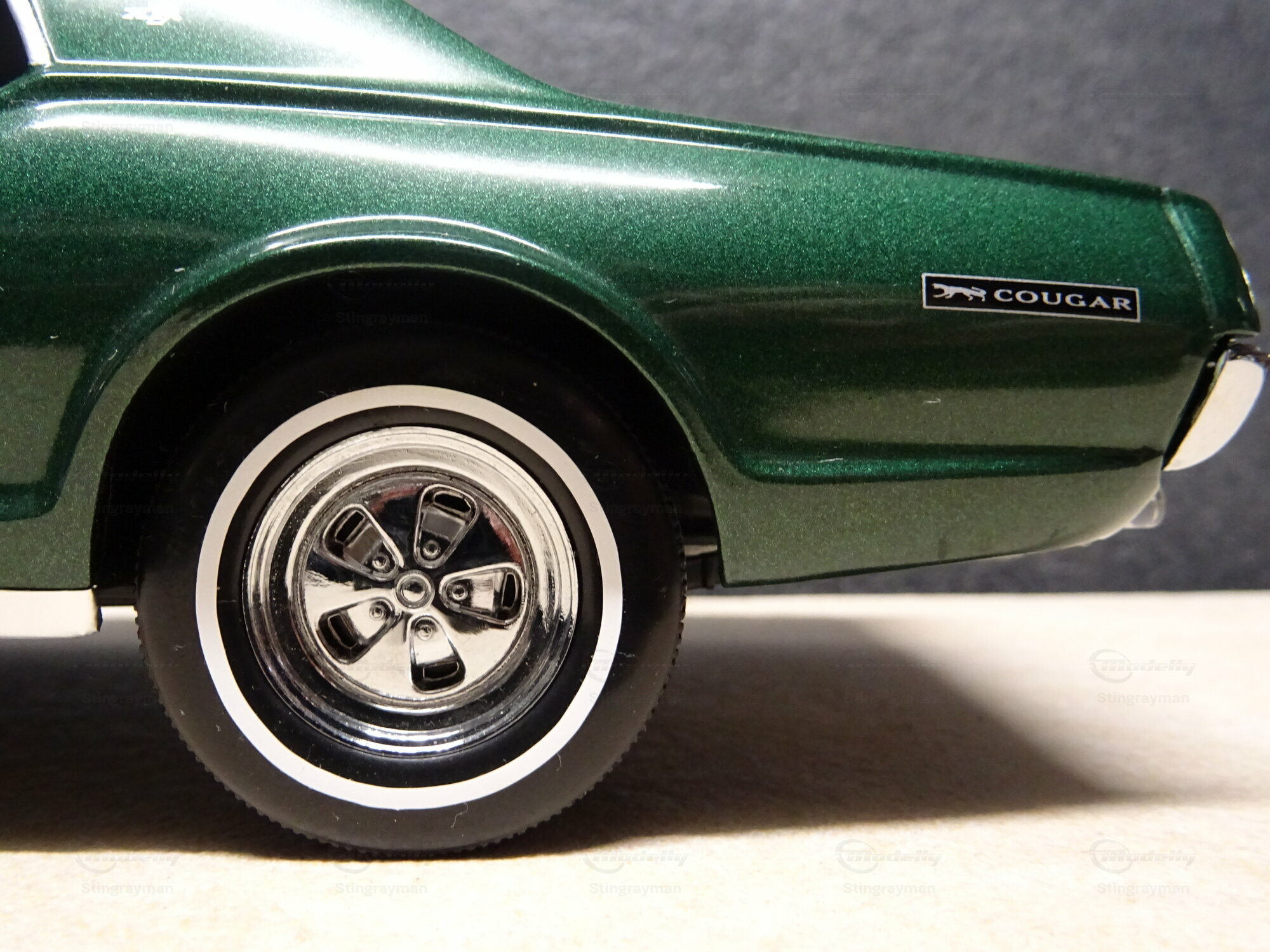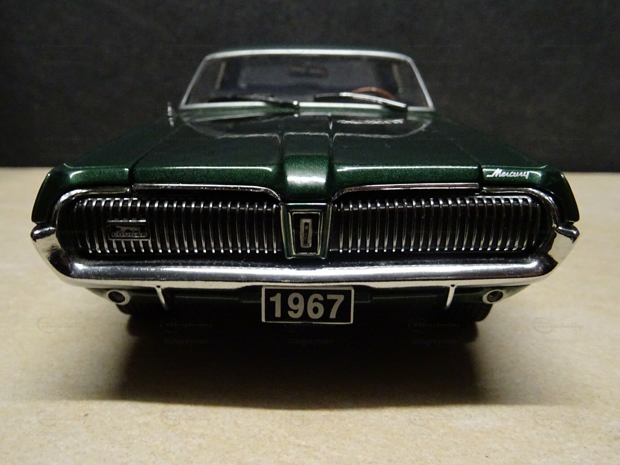 The 1/18 scale model car presented here was crafted by Sun Star and belongs to the collection of a Modelly member, "Stingrayman." This replica is made of die-cast material and excellently reflects the details of the original. The Mercury Cougar XR-7 is painted in a deep green color, giving the model an appealing and authentic look. The color scheme is complemented by the chrome bumpers and side accent stripes, further accentuating the model. Another highlight of this model is the realistically depicted rims with white sidewall tires, perfectly capturing the classic style of the 60s. Such details are crucial for collectors who value historical accuracy and attention to detail.
