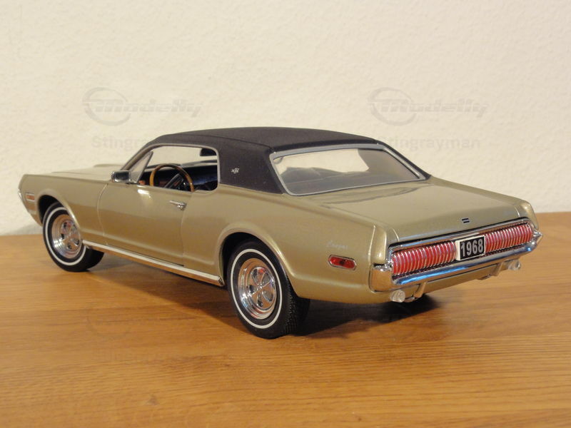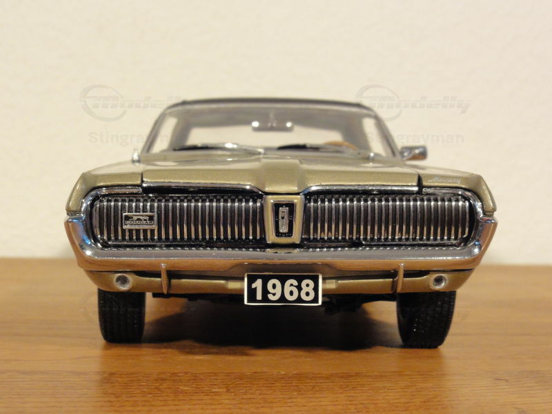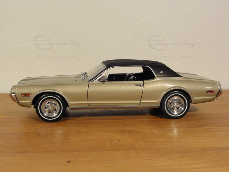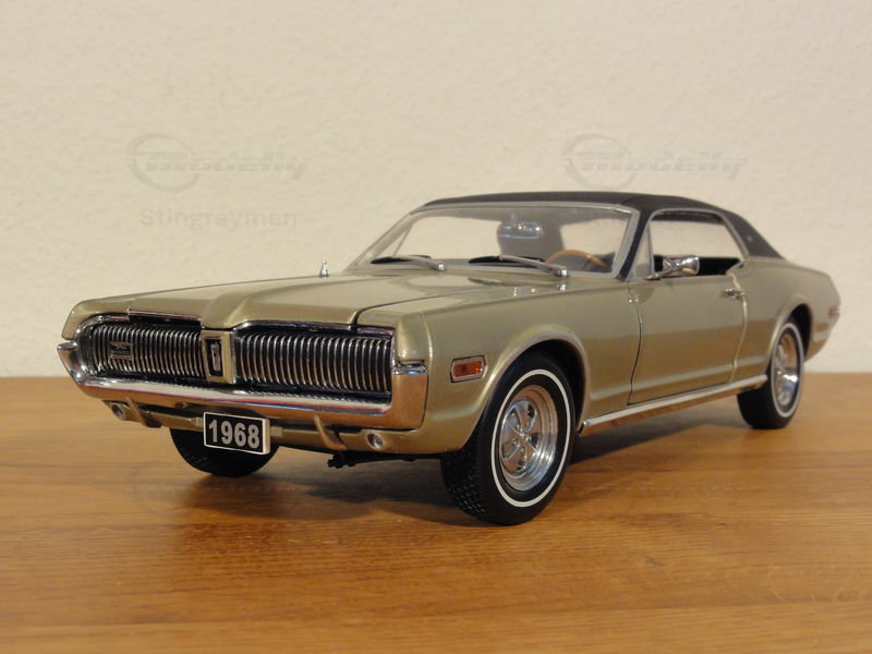 The model car shown in 1/18 scale by Sunstar is a detailed replica part of the collection owned by Modelly member "Stingrayman". The grille with the vertical slats and the license plate showing the year 1968 are just like the original. The metallic gold paint and the black vinyl top match the actual vehicle's design. The model's tires and wheels are also true to the original, with silver rims featuring a chrome finish giving the model its authentic look.