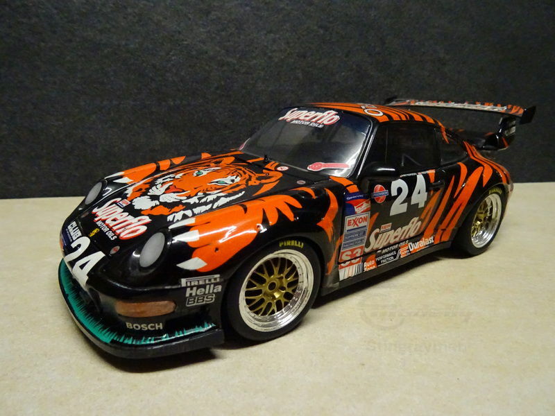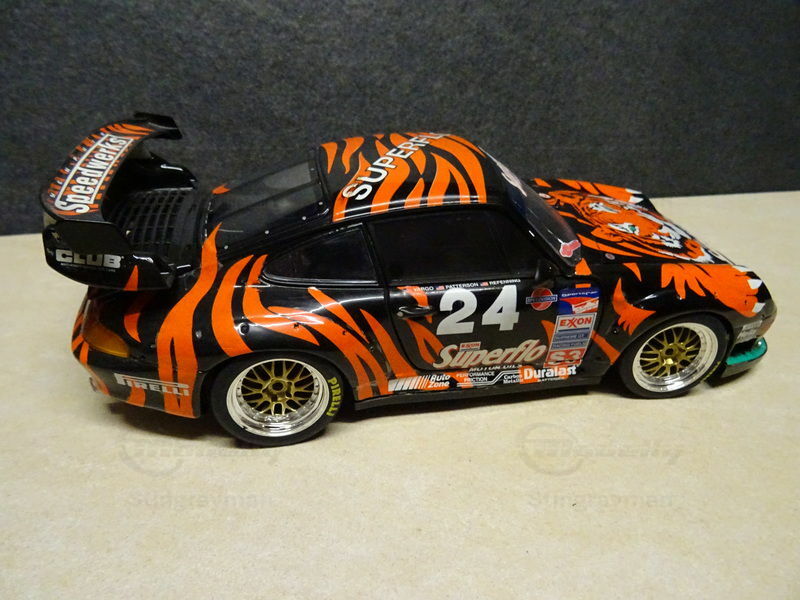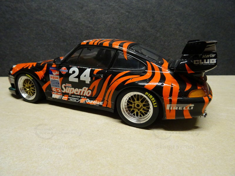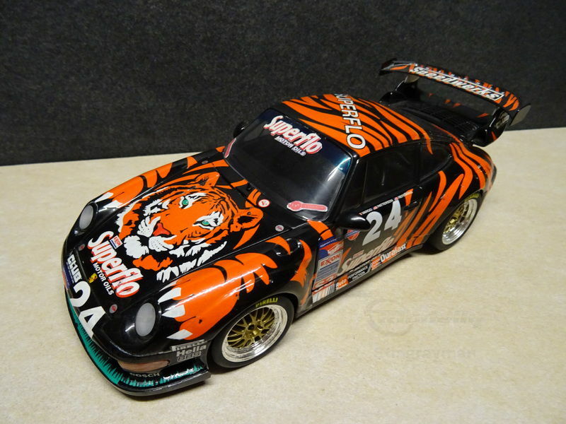 The visual impression of this 1/18-scale model from UTmodels Racing Collection is impressive. With its precise details and striking livery, the model represents the powerful and dynamic character of the original Porsche 911 (993) GT2 Evo. The distinctive tiger stripes and contrasting color scheme make this model a standout in any collection. The sponsor logos, detailed wheels, and accurately reproduced aerodynamic components contribute to the authentic overall impression. As a modified model, it significantly stands out from the stock versions and its uniqueness and handcrafted adjustments make it a one-of-a-kind collector's piece. This model is a must-have for any serious car collector and Porsche 911 enthusiasts.