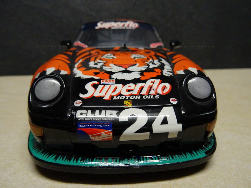 One of the most striking features of the Porsche 911 (993) GT2 Evo is its eye-catching livery. The model showcased in the photos exhibits a vibrant design highlighted by its orange-black color scheme and tiger motif on the hood and side panels. This design elevates the car to a real showstopper on the racetrack, reflecting its dynamism and power. The body features prominent sponsor logos such as Superflo, Exxon, and Hella, emphasizing the strong connection of the vehicle to professional racing. These sponsors contribute to the authenticity and historical value of the car.