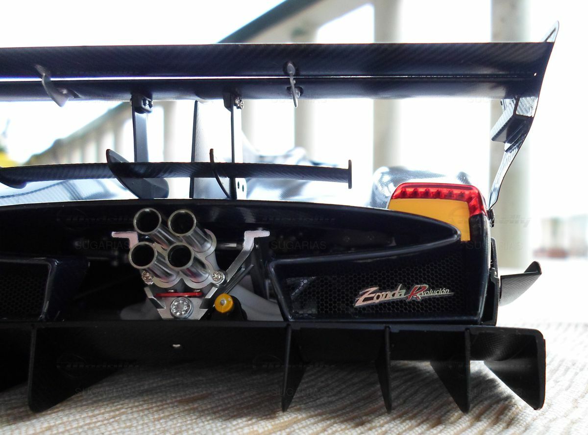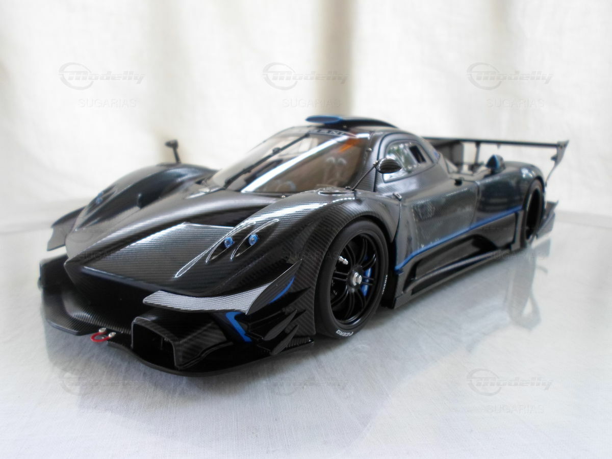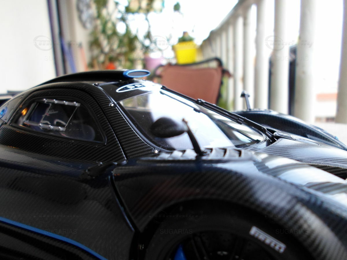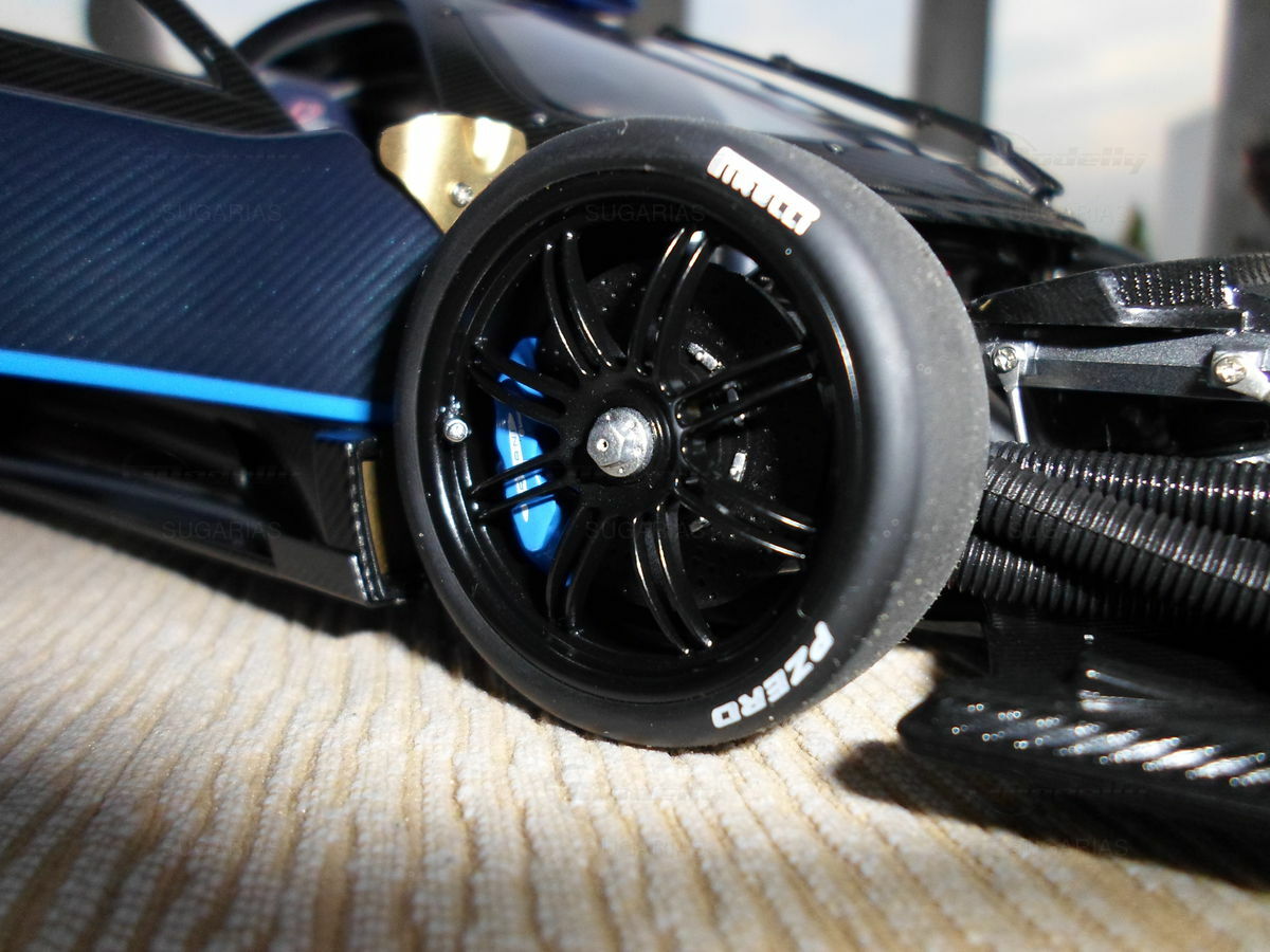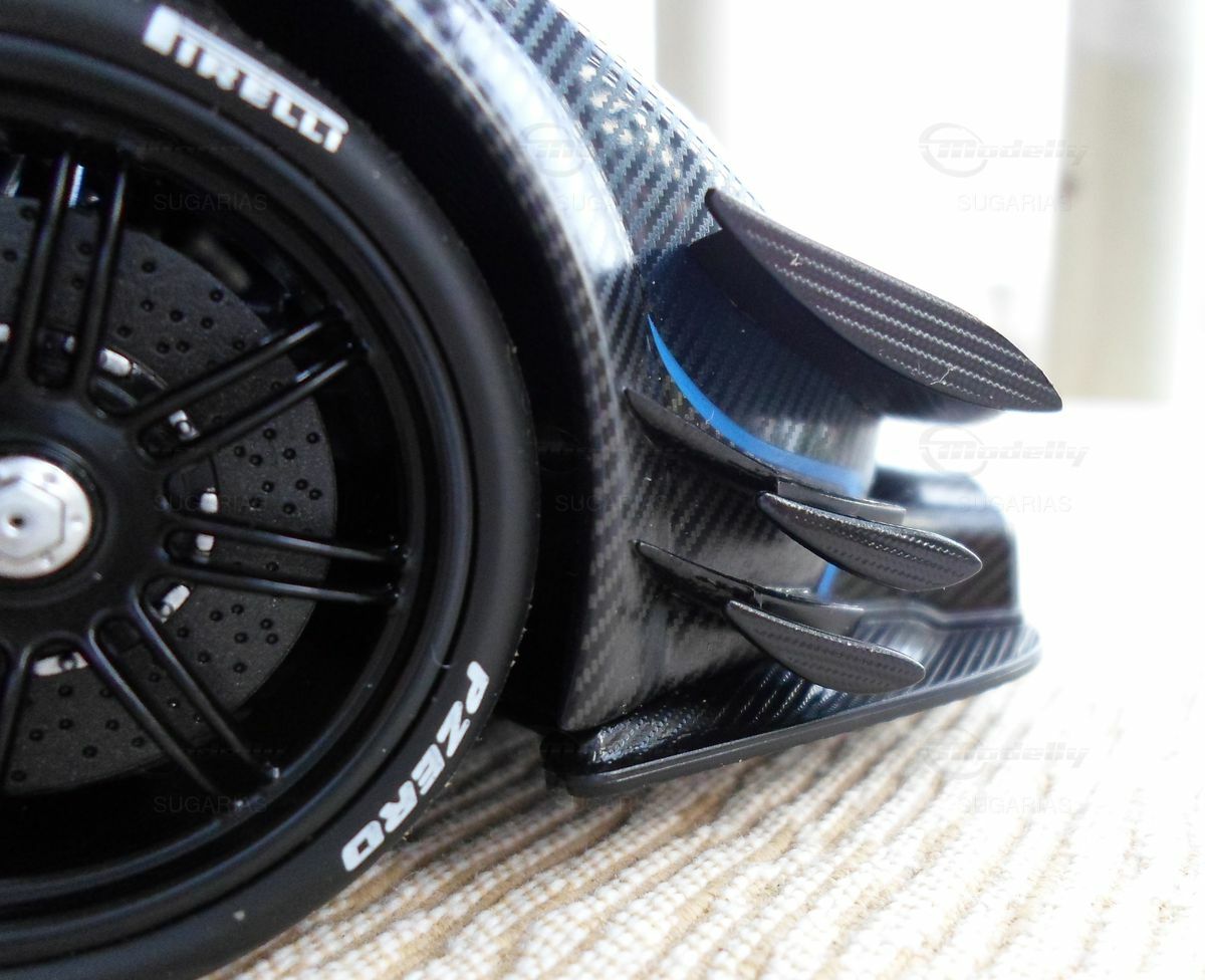 The 1/18 scale model of the Pagani Zonda Revolucion is a precise miniature crafted by AUTOart using high-quality die-cast material. This model, part of the collection of Modelly member "SUGARIAS," showcases incredible attention to detail. The body is black with blue accents, featuring visible carbon patterns, detailed headlights and mirrors, and a delicate rear spoiler, illustrating the meticulous craftsmanship. Sponsor logos such as those of Pirelli and Brembo are also present on this miniature, enhancing the authenticity of the model. These features make the model a valuable collector's item.