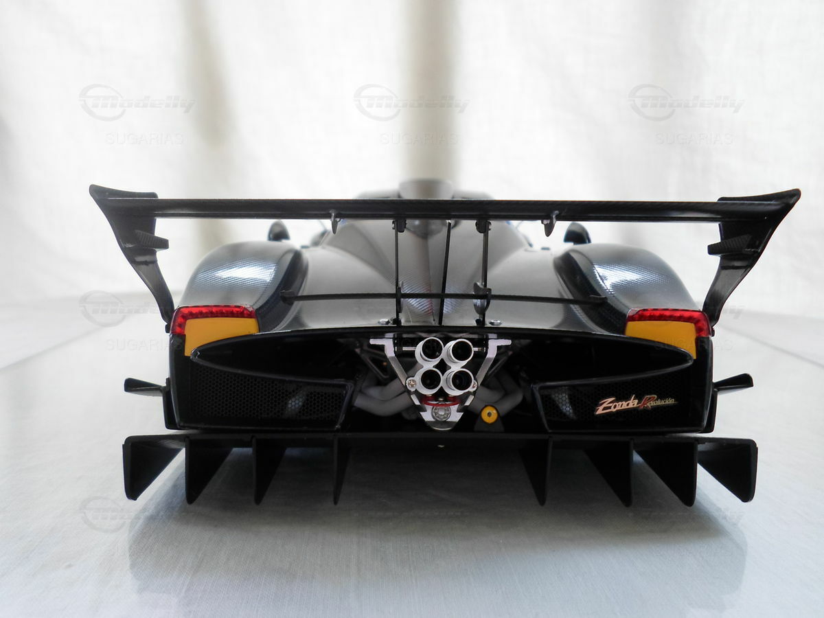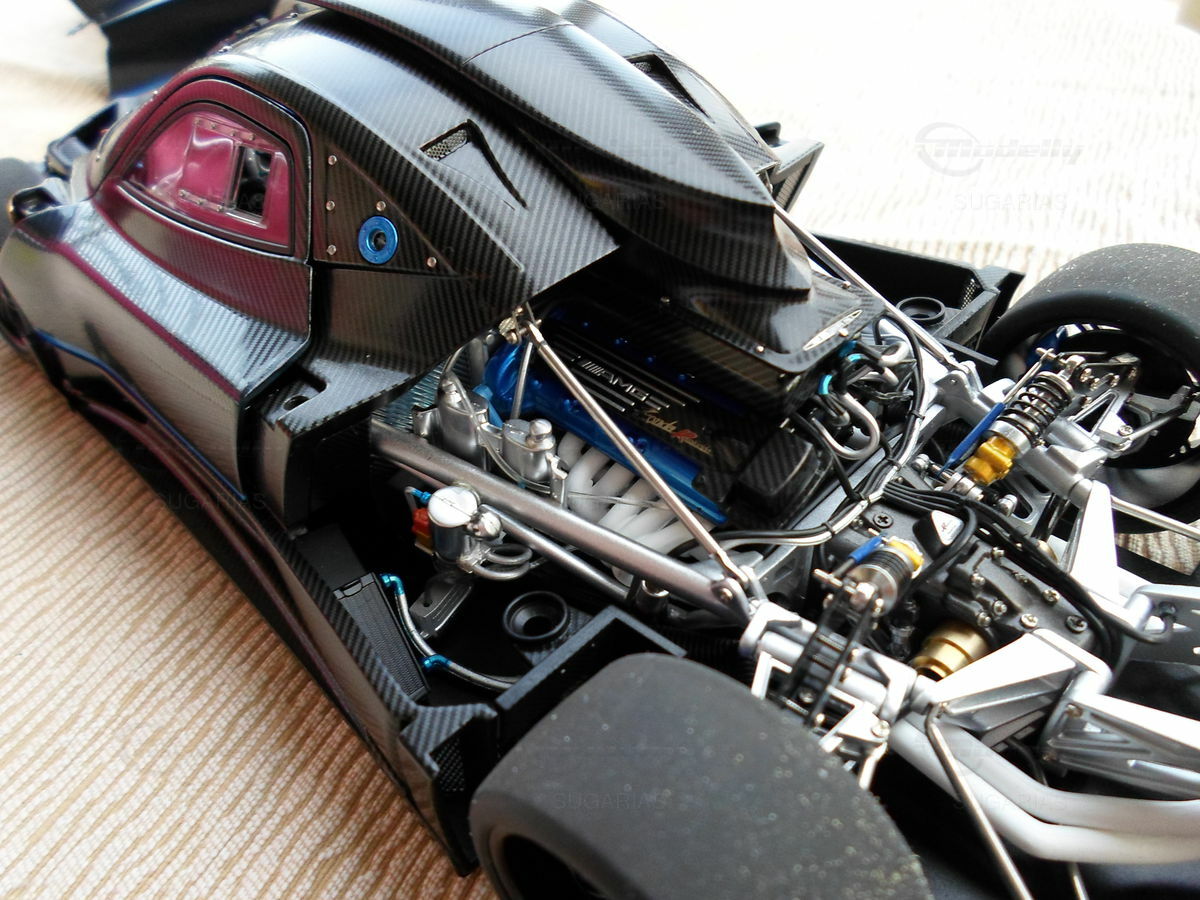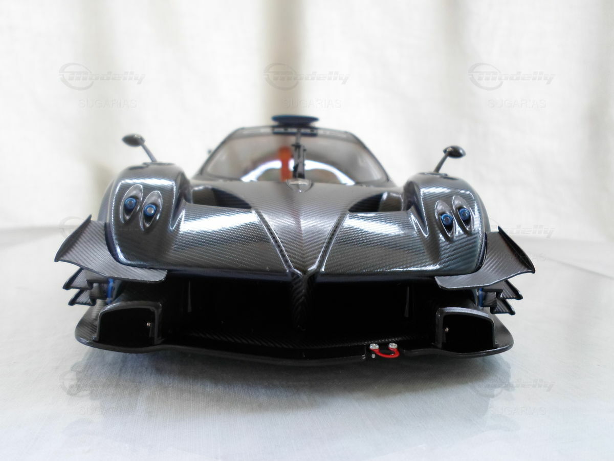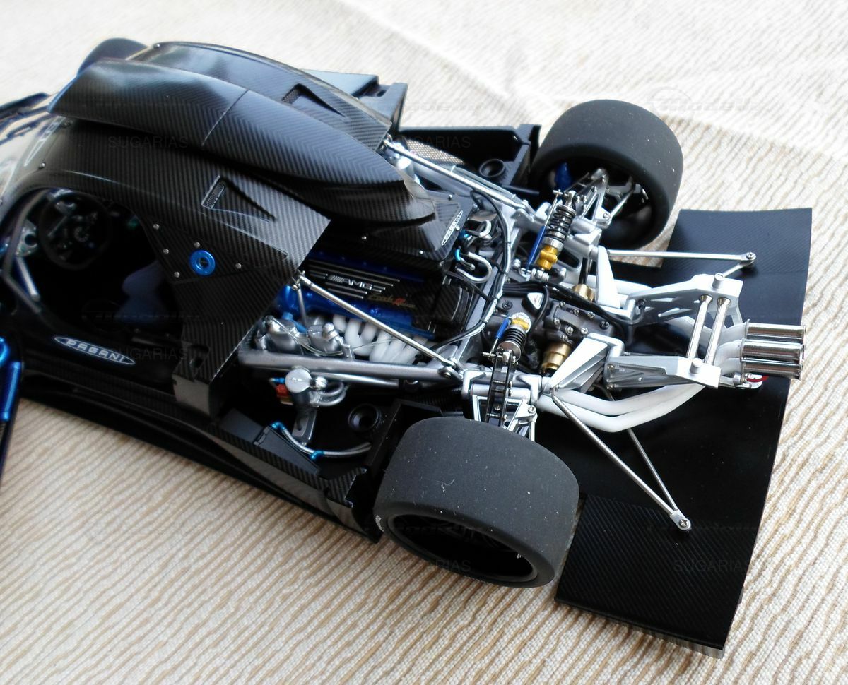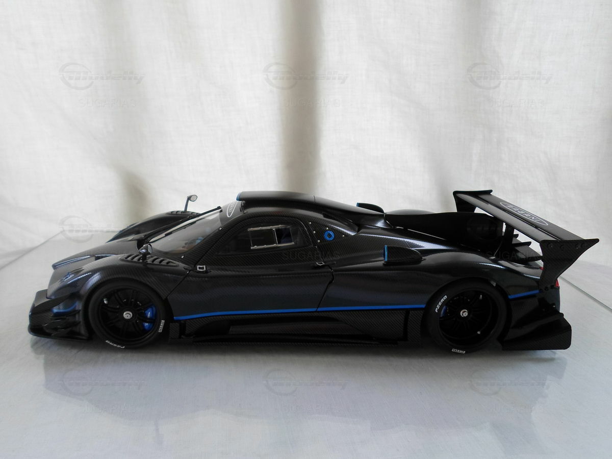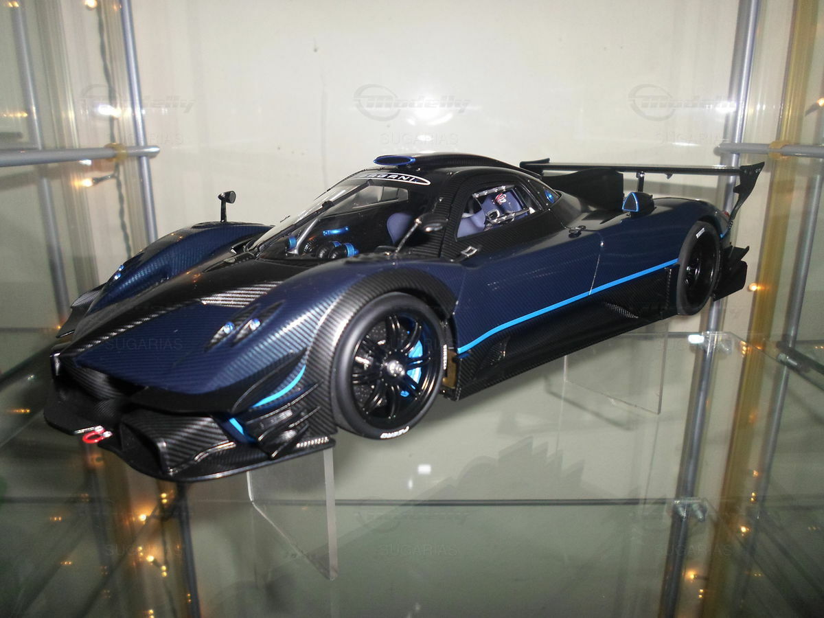 The 1/18 scale model of the Pagani Zonda Revolucion is a precise miniature crafted by AUTOart using high-quality die-cast material. This model, part of the collection of Modelly member "SUGARIAS," showcases incredible attention to detail. The body is black with blue accents, featuring visible carbon patterns, detailed headlights and mirrors, and a delicate rear spoiler, illustrating the meticulous craftsmanship. Sponsor logos such as those of Pirelli and Brembo are also present on this miniature, enhancing the authenticity of the model. These features make the model a valuable collector's item.