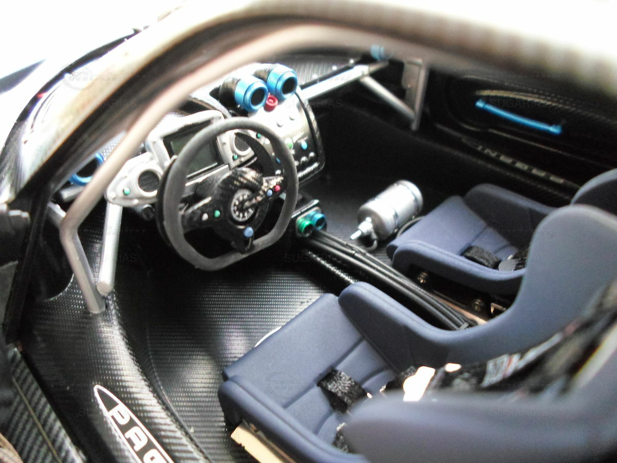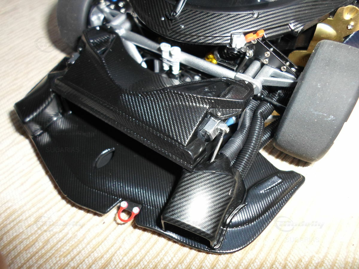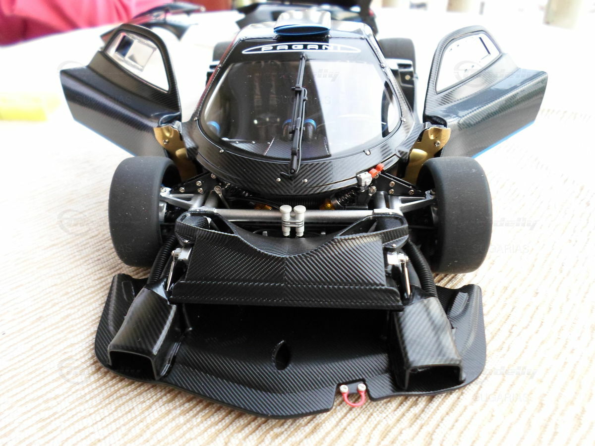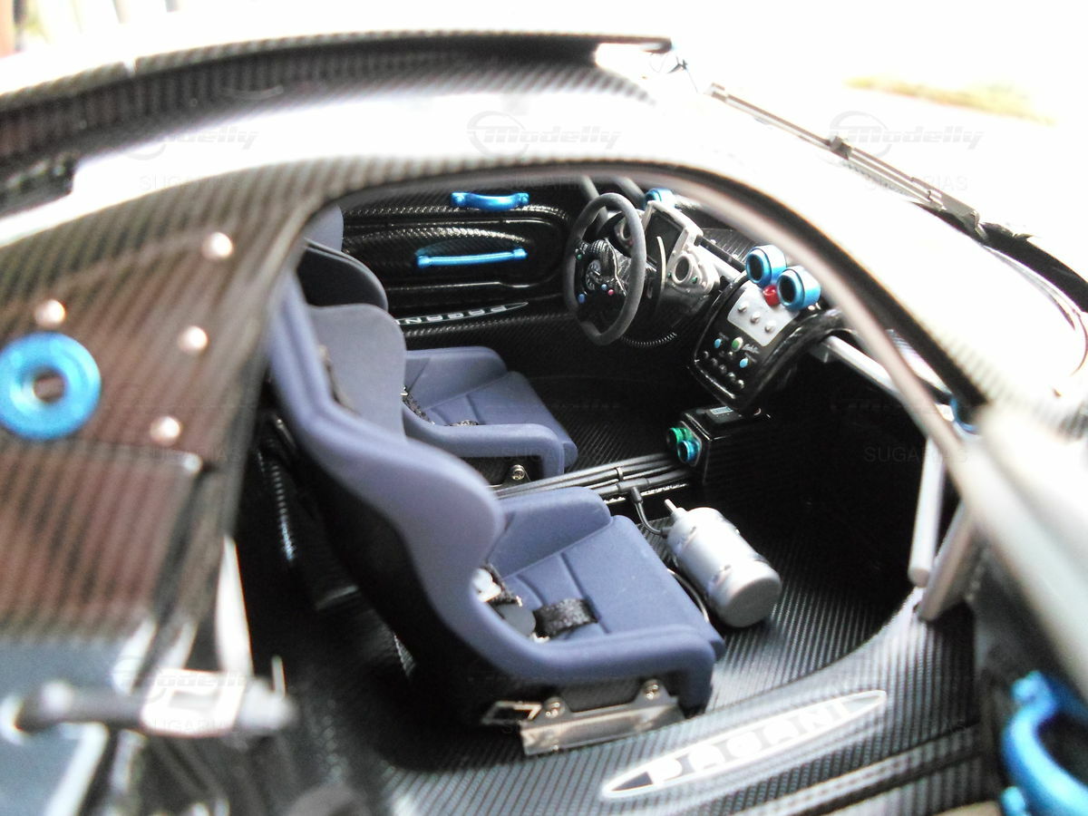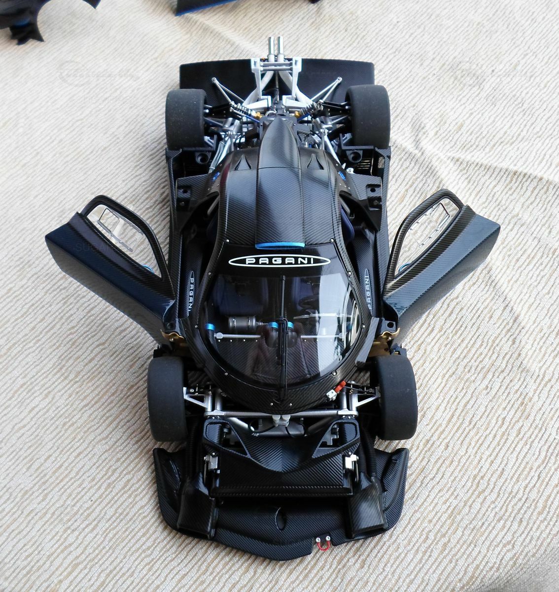 The 1/18 scale model of the Pagani Zonda Revolucion is a precise miniature crafted by AUTOart using high-quality die-cast material. This model, part of the collection of Modelly member "SUGARIAS," showcases incredible attention to detail. The body is black with blue accents, featuring visible carbon patterns, detailed headlights and mirrors, and a delicate rear spoiler, illustrating the meticulous craftsmanship. Sponsor logos such as those of Pirelli and Brembo are also present on this miniature, enhancing the authenticity of the model. These features make the model a valuable collector's item.