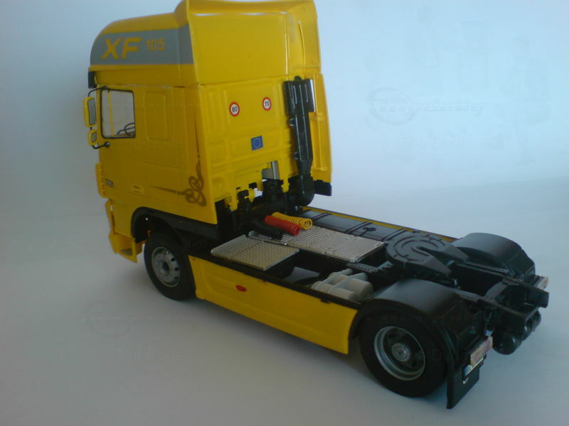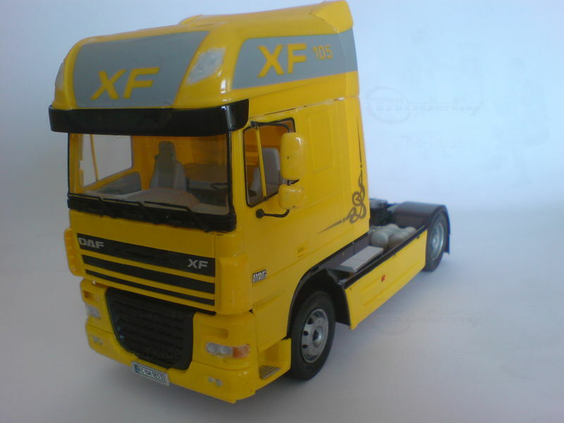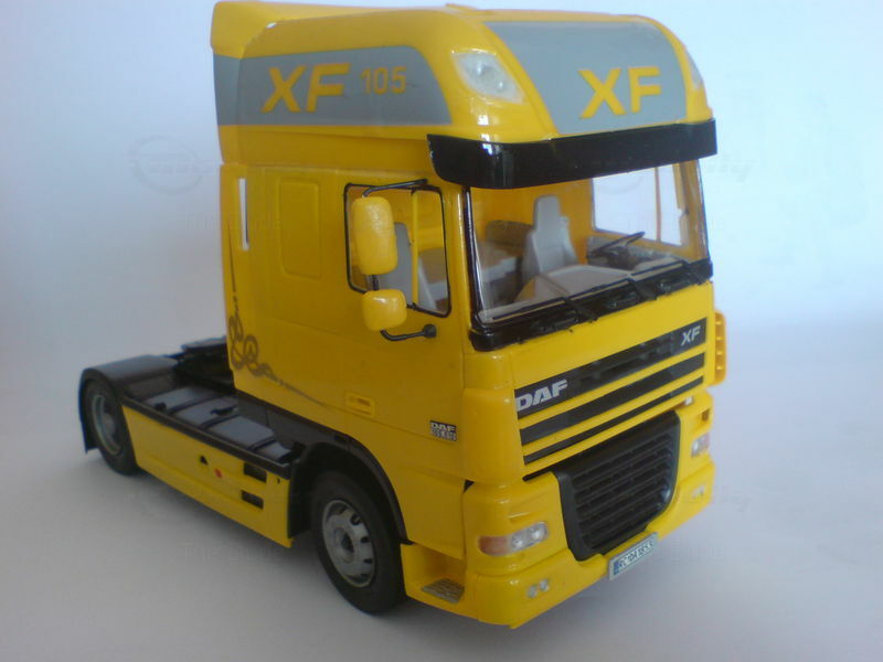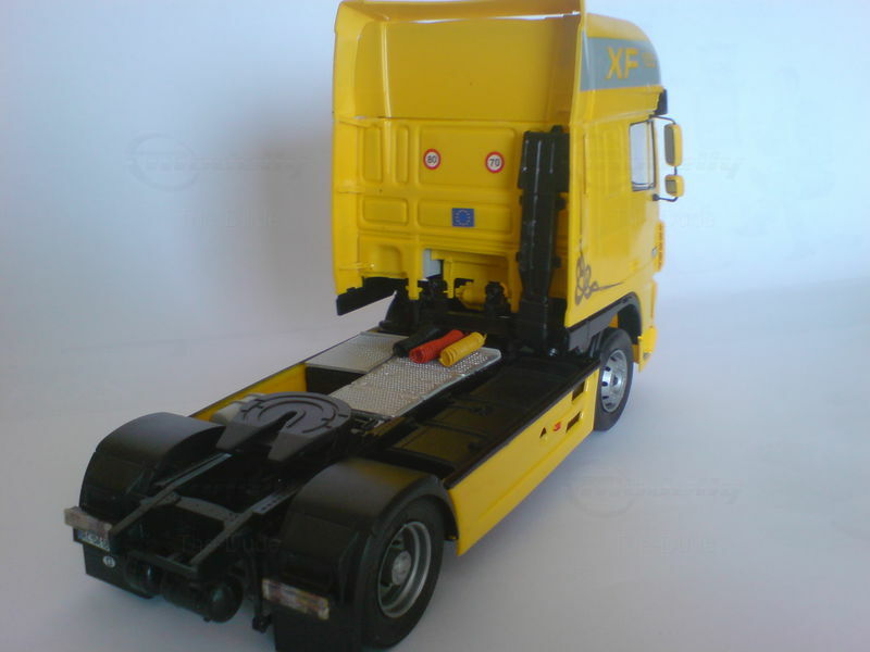 The model truck of the DAF XF 105, manufactured by Italeri in 1/24 scale, is a precise miniature that excellently reflects the details and features of the original. This model is part of the collection of Modelly member "The-Dude" and stands out with its detailed reproduction. The yellow cab paintwork with gray and black accents gives the model a striking look. Special attention is drawn to the "XF 105" lettering on both sides of the cab and the DAF logo on the front. The windows are clear, offering a view of the detailed interior replicating the seats and dashboard of the original. The model truck also showcases the chrome parts and headlights matching the original.