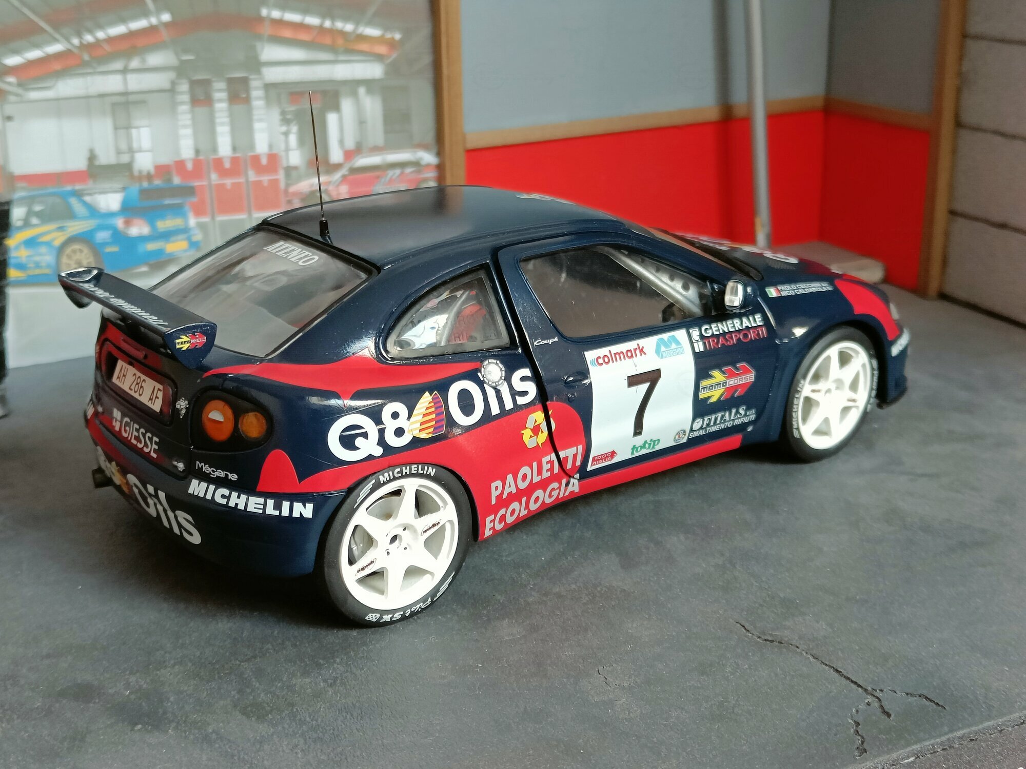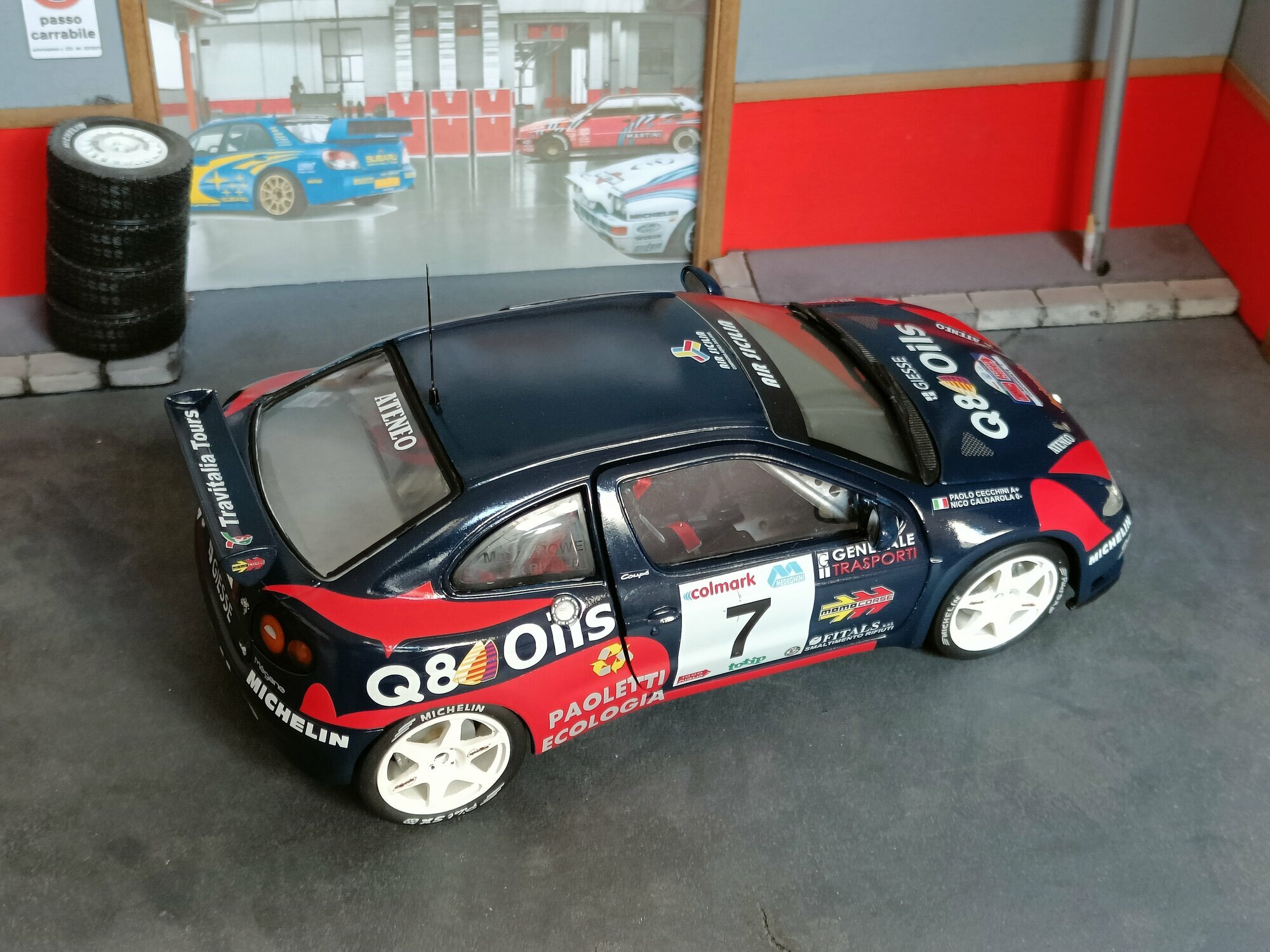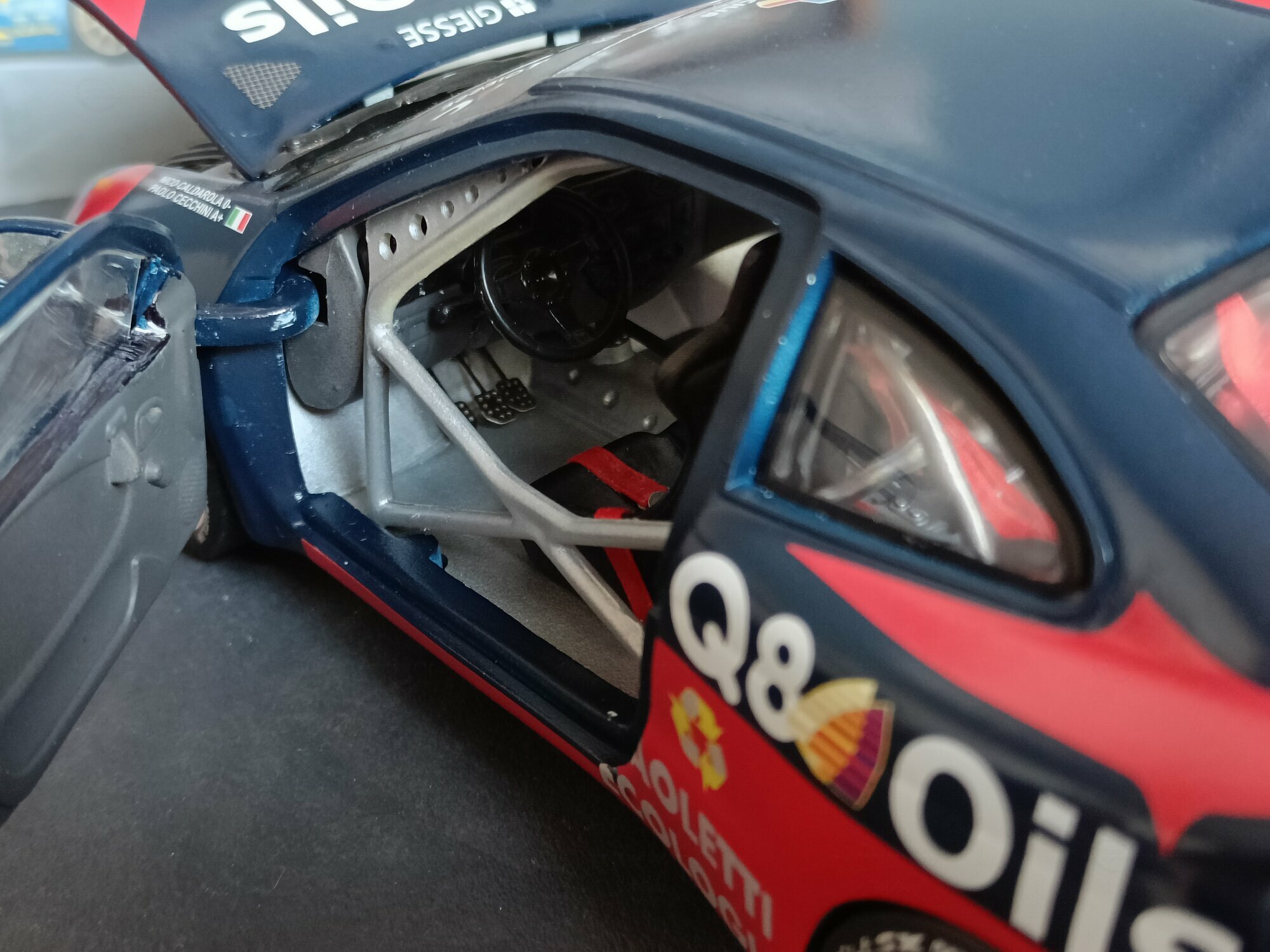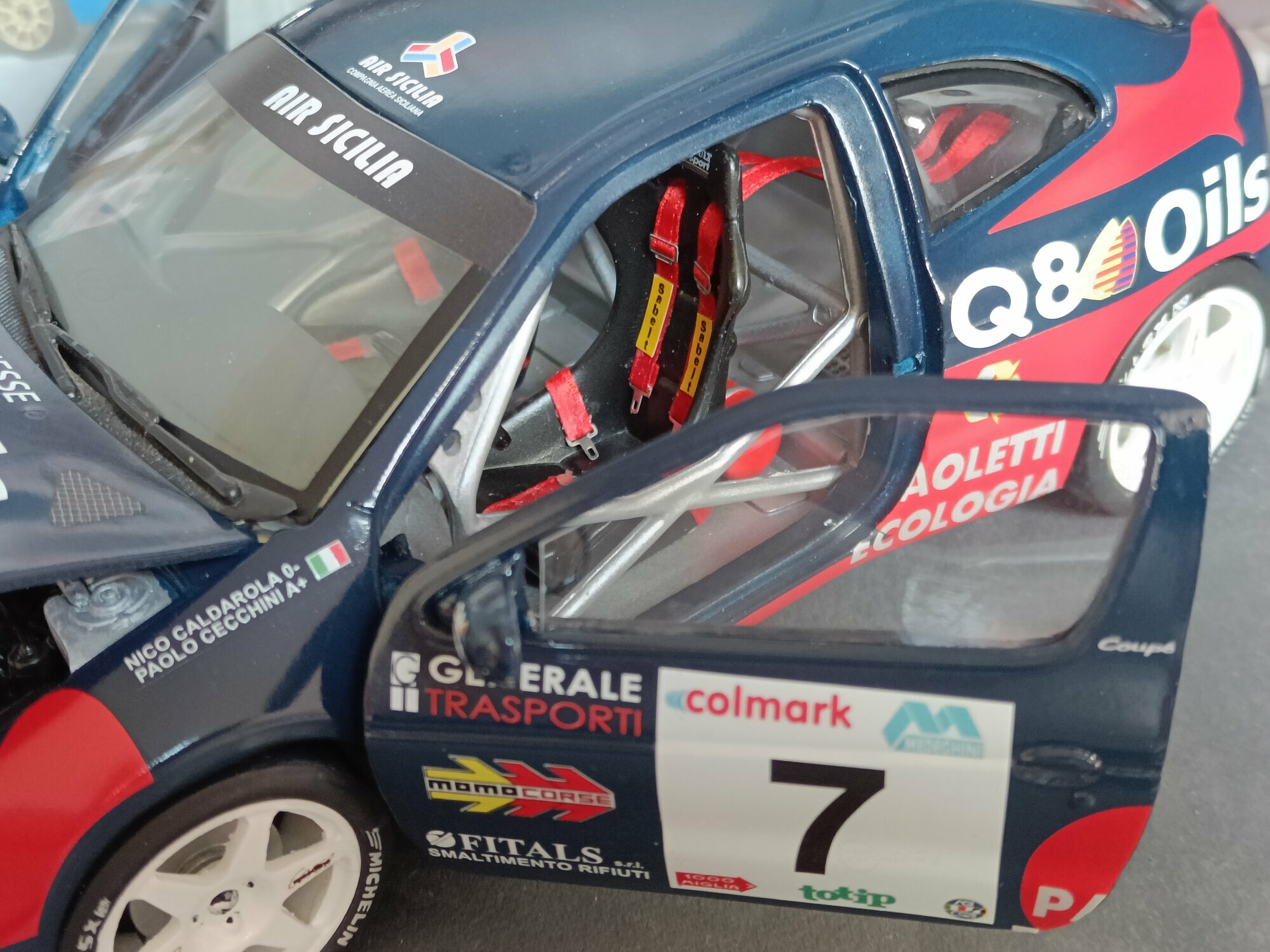 Particularly striking is the paint job of the model. It displays the sponsorship logos of Q8 Oils, Michelin, and Paoletti Ecologia, which are prominently featured on the vehicle. The base color is a deep blue with red and white accents that emphasize the sporty and aggressive lines of the vehicle. Every detail, from the rims to the rear spoiler, has been carefully replicated to reflect the aesthetic and functional characteristics of the original.