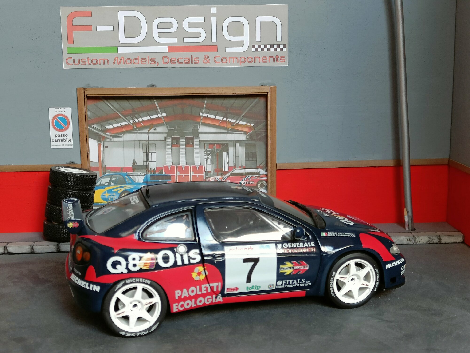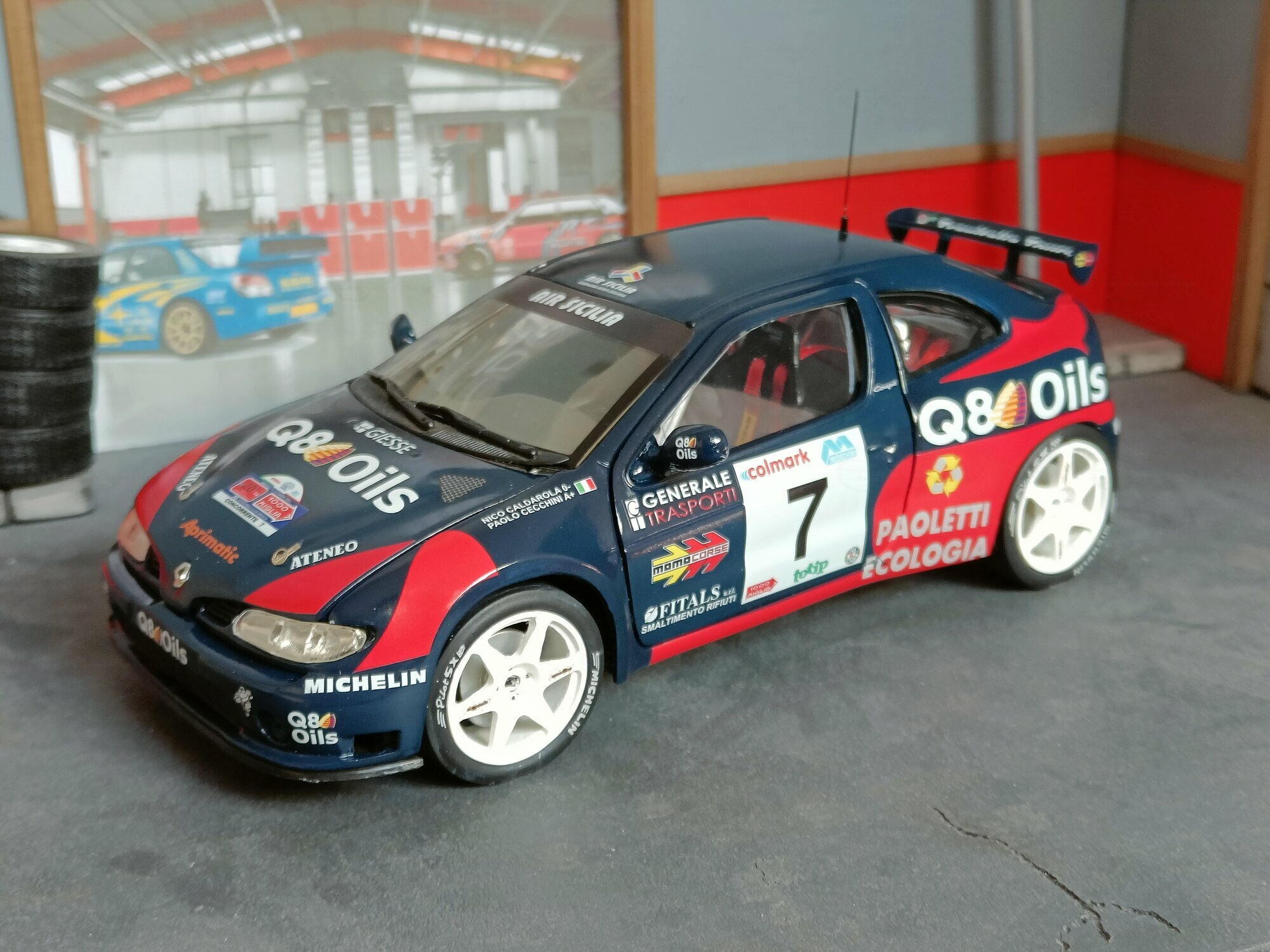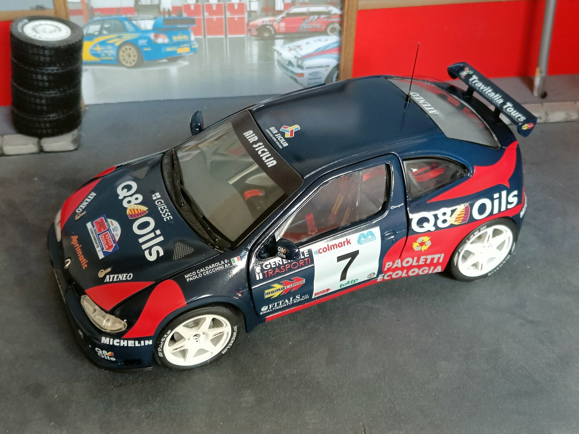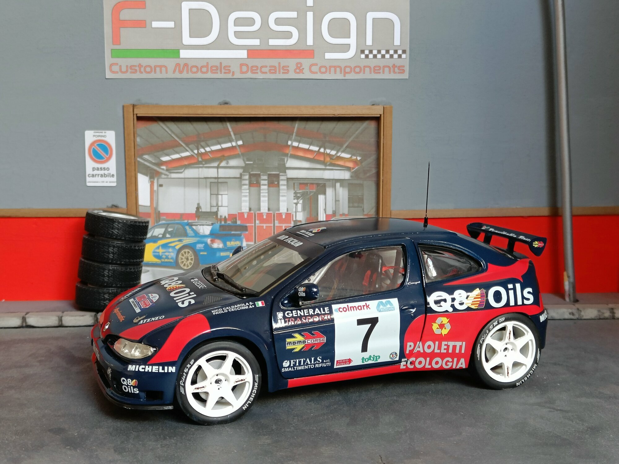 Particularly striking is the paint job of the model. It displays the sponsorship logos of Q8 Oils, Michelin, and Paoletti Ecologia, which are prominently featured on the vehicle. The base color is a deep blue with red and white accents that emphasize the sporty and aggressive lines of the vehicle. Every detail, from the rims to the rear spoiler, has been carefully replicated to reflect the aesthetic and functional characteristics of the original.