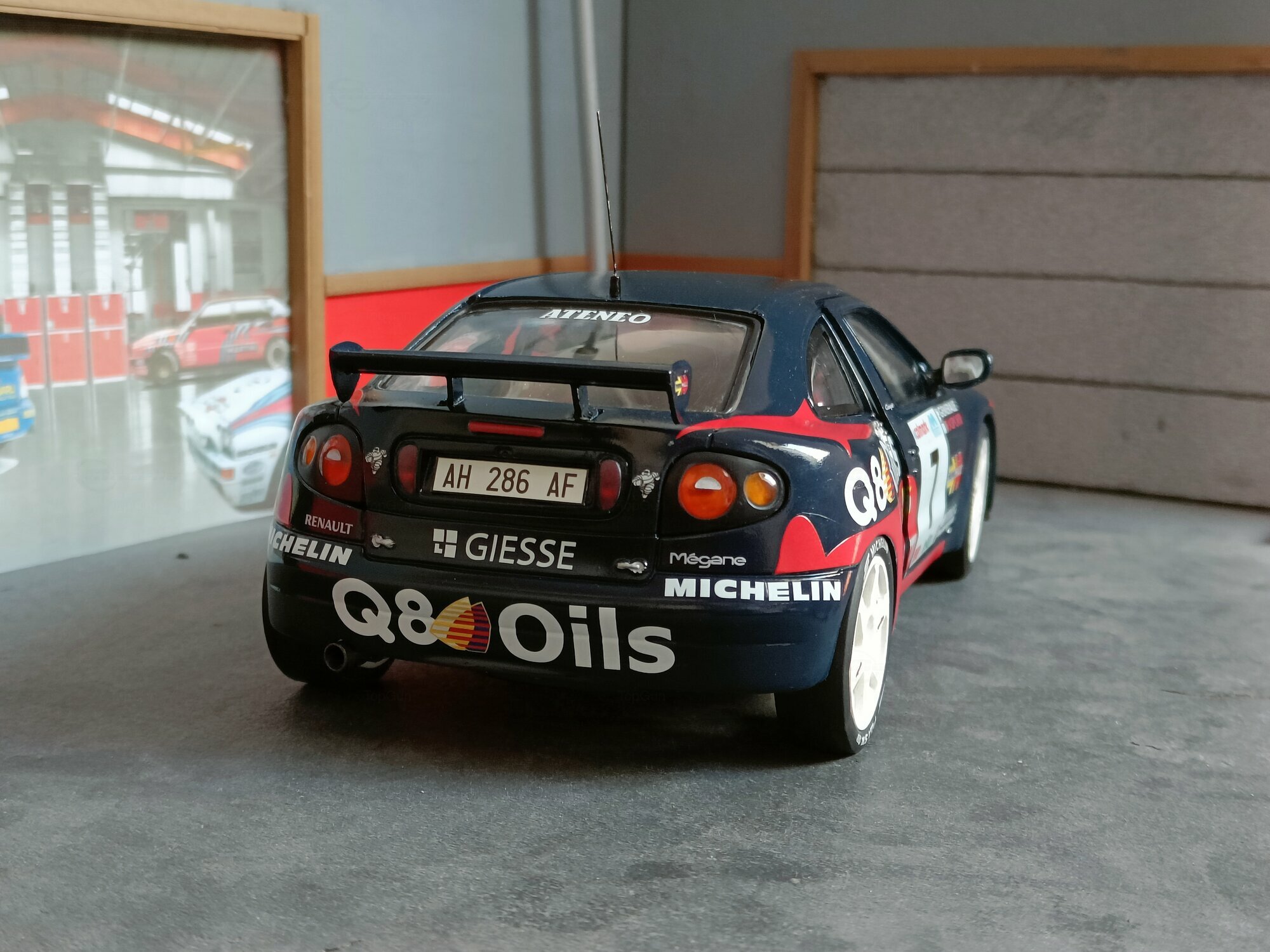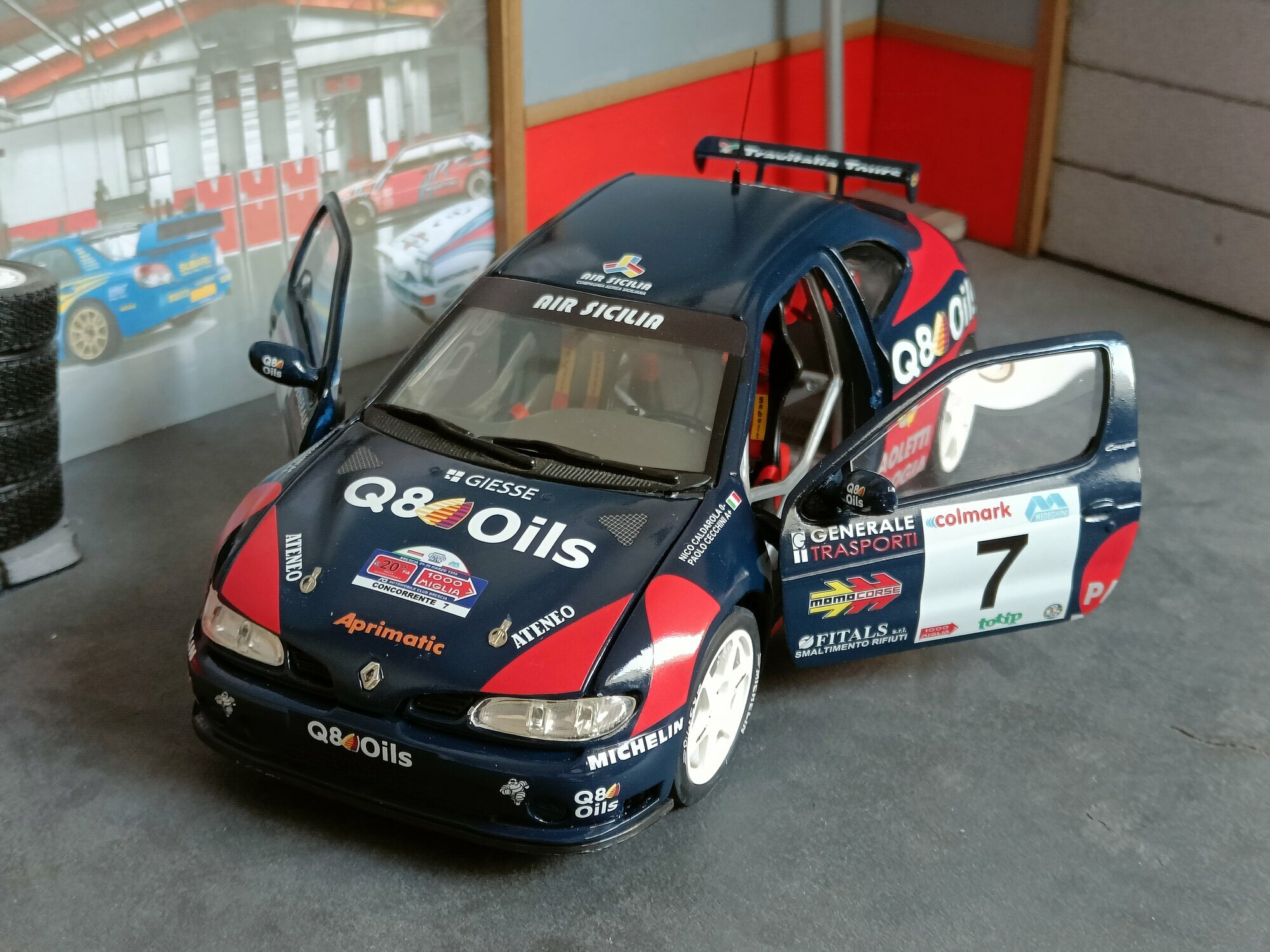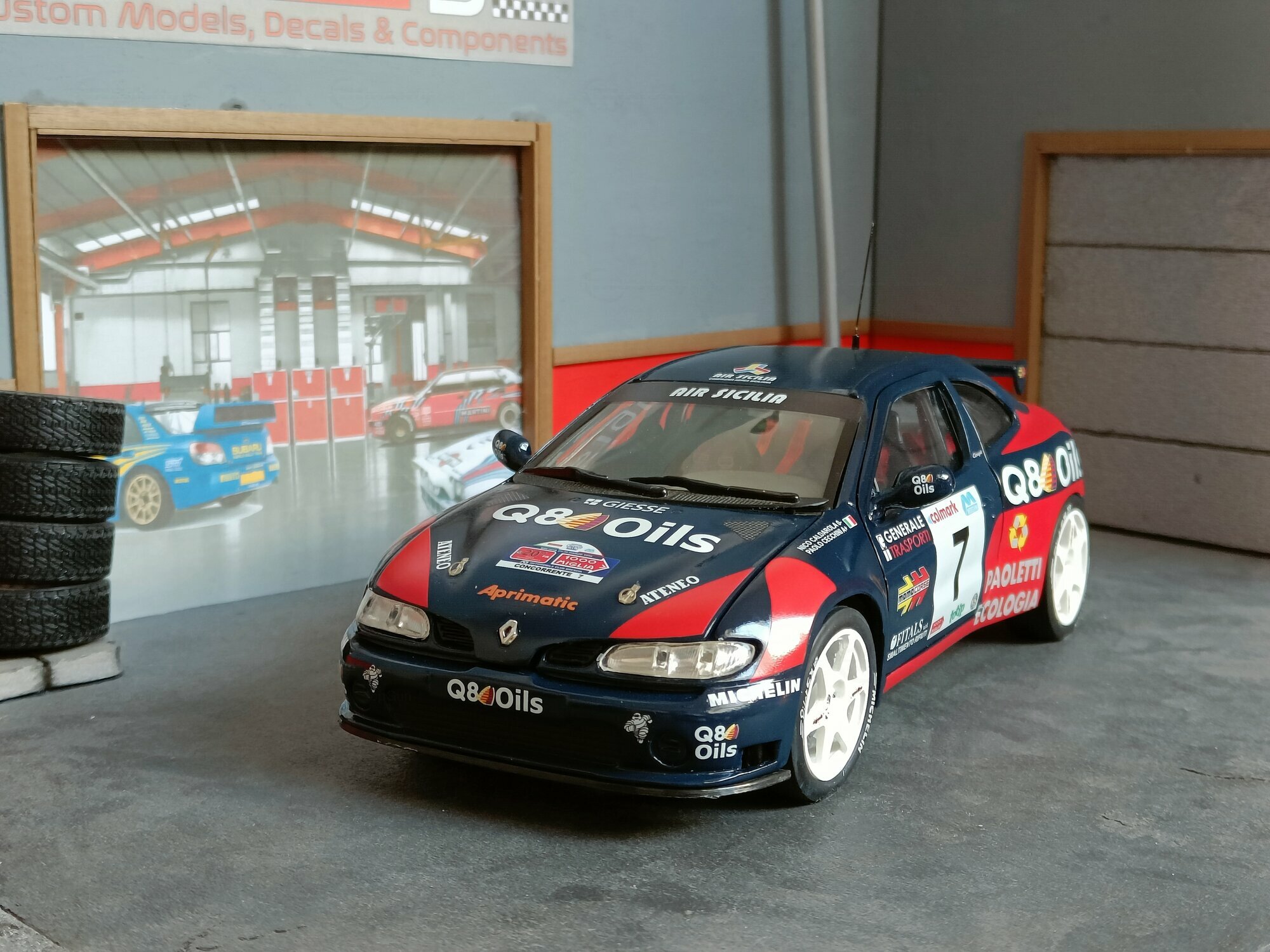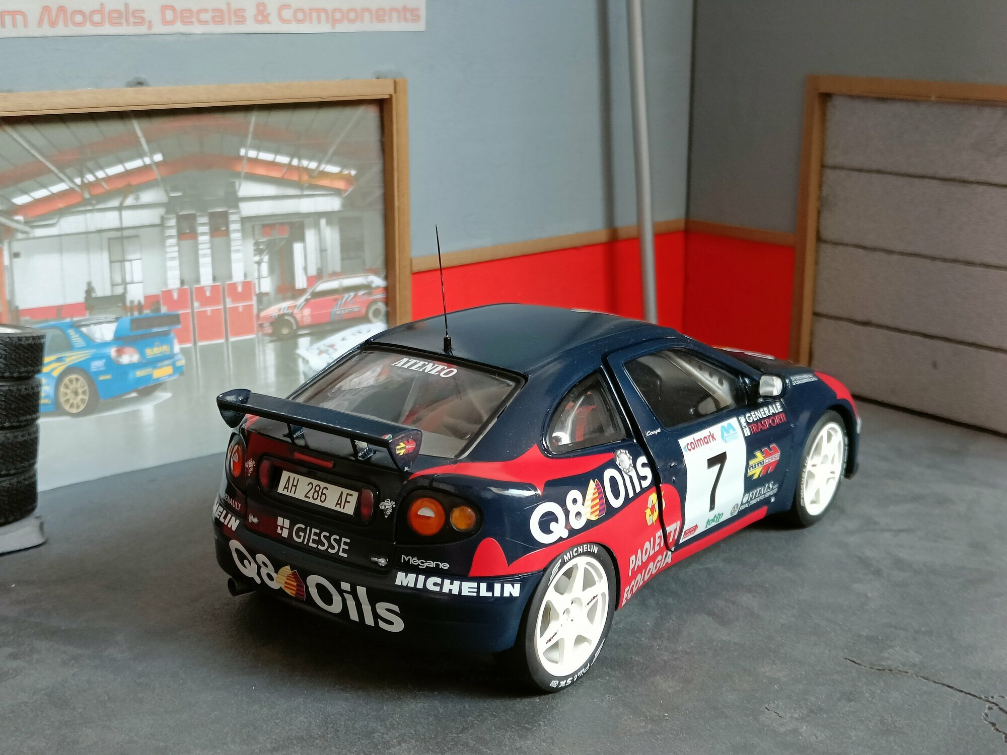 Particularly striking is the paint job of the model. It displays the sponsorship logos of Q8 Oils, Michelin, and Paoletti Ecologia, which are prominently featured on the vehicle. The base color is a deep blue with red and white accents that emphasize the sporty and aggressive lines of the vehicle. Every detail, from the rims to the rear spoiler, has been carefully replicated to reflect the aesthetic and functional characteristics of the original.
