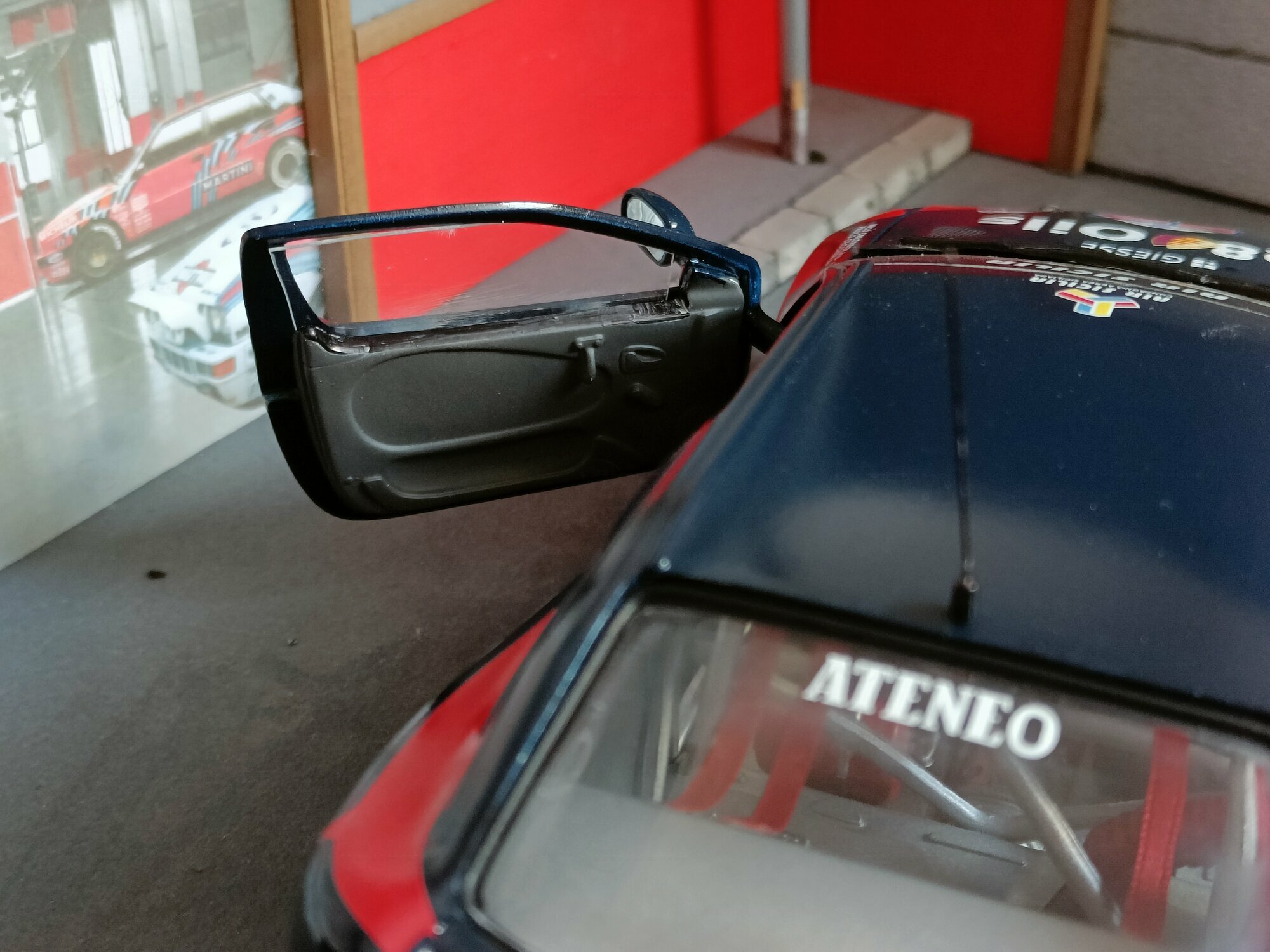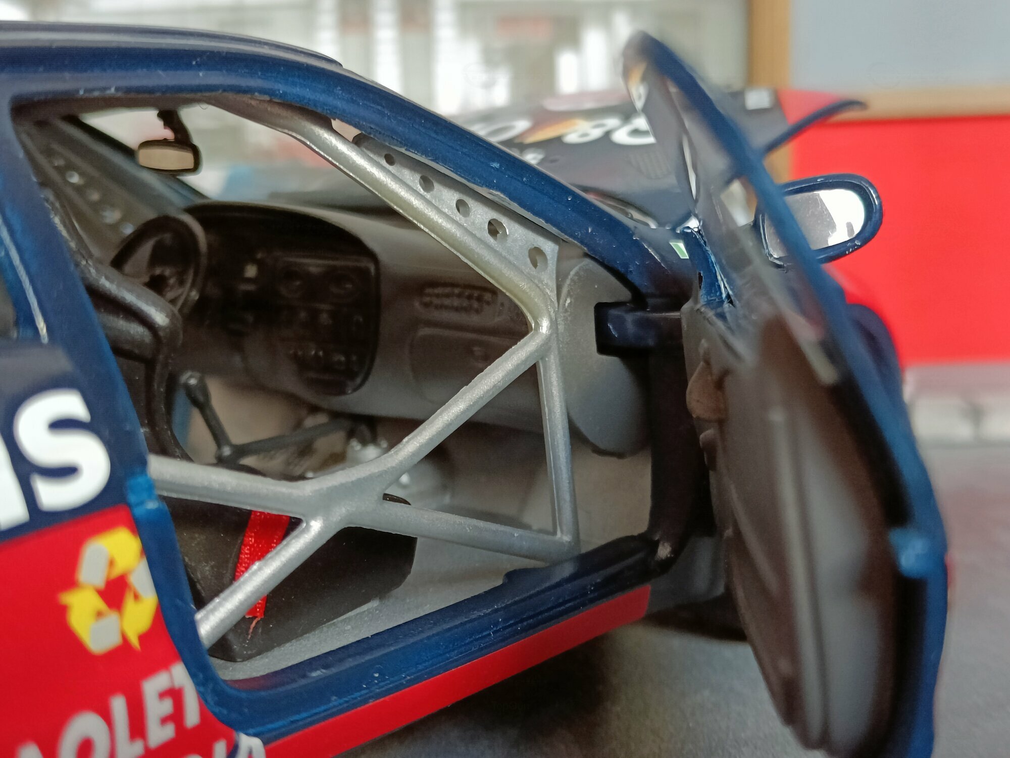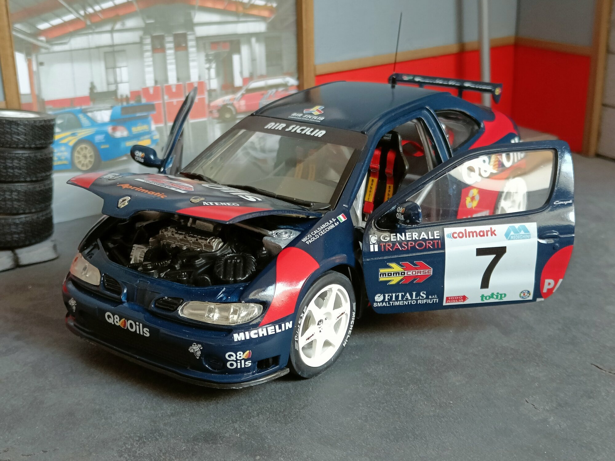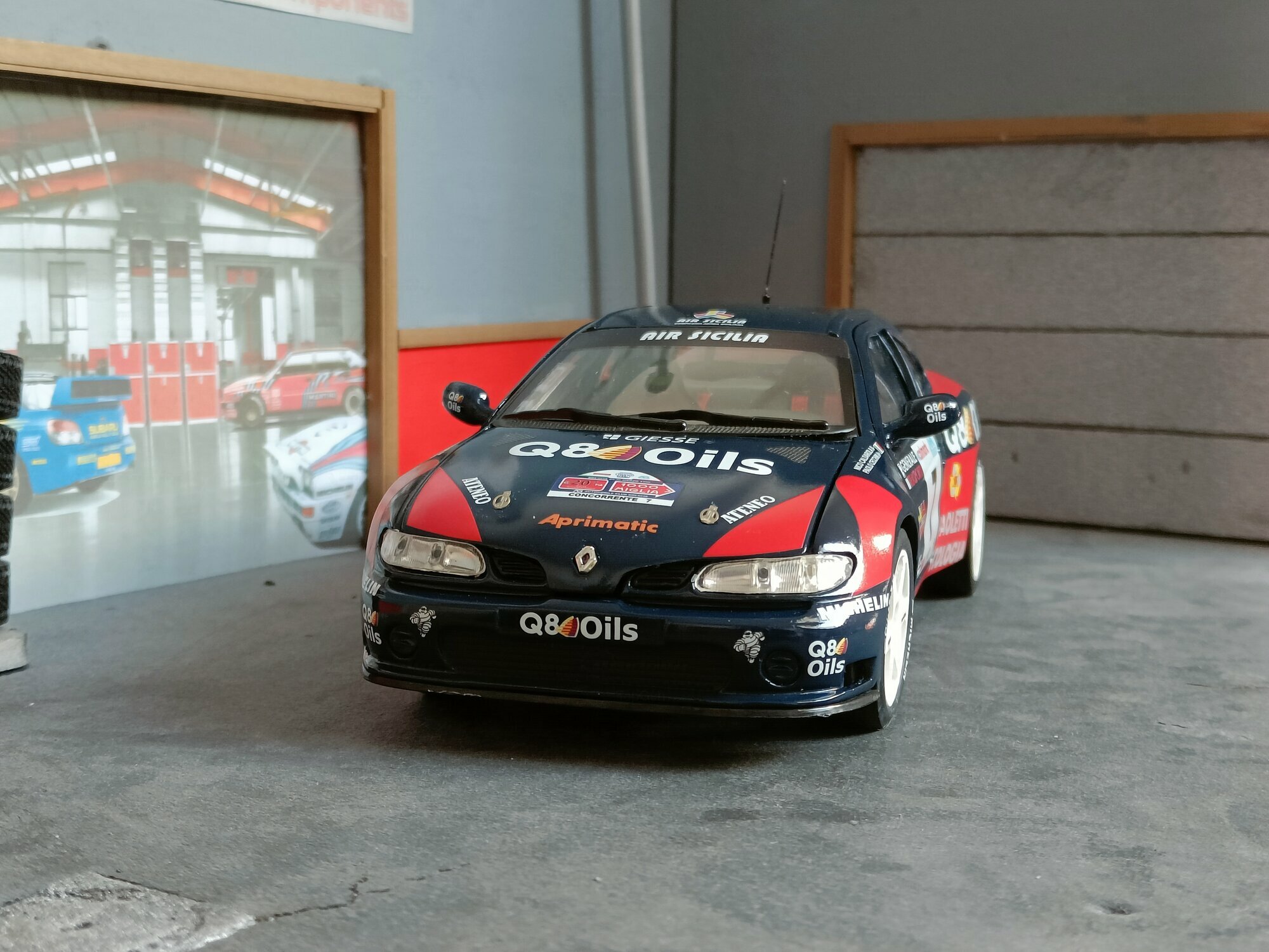 Particularly striking is the paint job of the model. It displays the sponsorship logos of Q8 Oils, Michelin, and Paoletti Ecologia, which are prominently featured on the vehicle. The base color is a deep blue with red and white accents that emphasize the sporty and aggressive lines of the vehicle. Every detail, from the rims to the rear spoiler, has been carefully replicated to reflect the aesthetic and functional characteristics of the original.