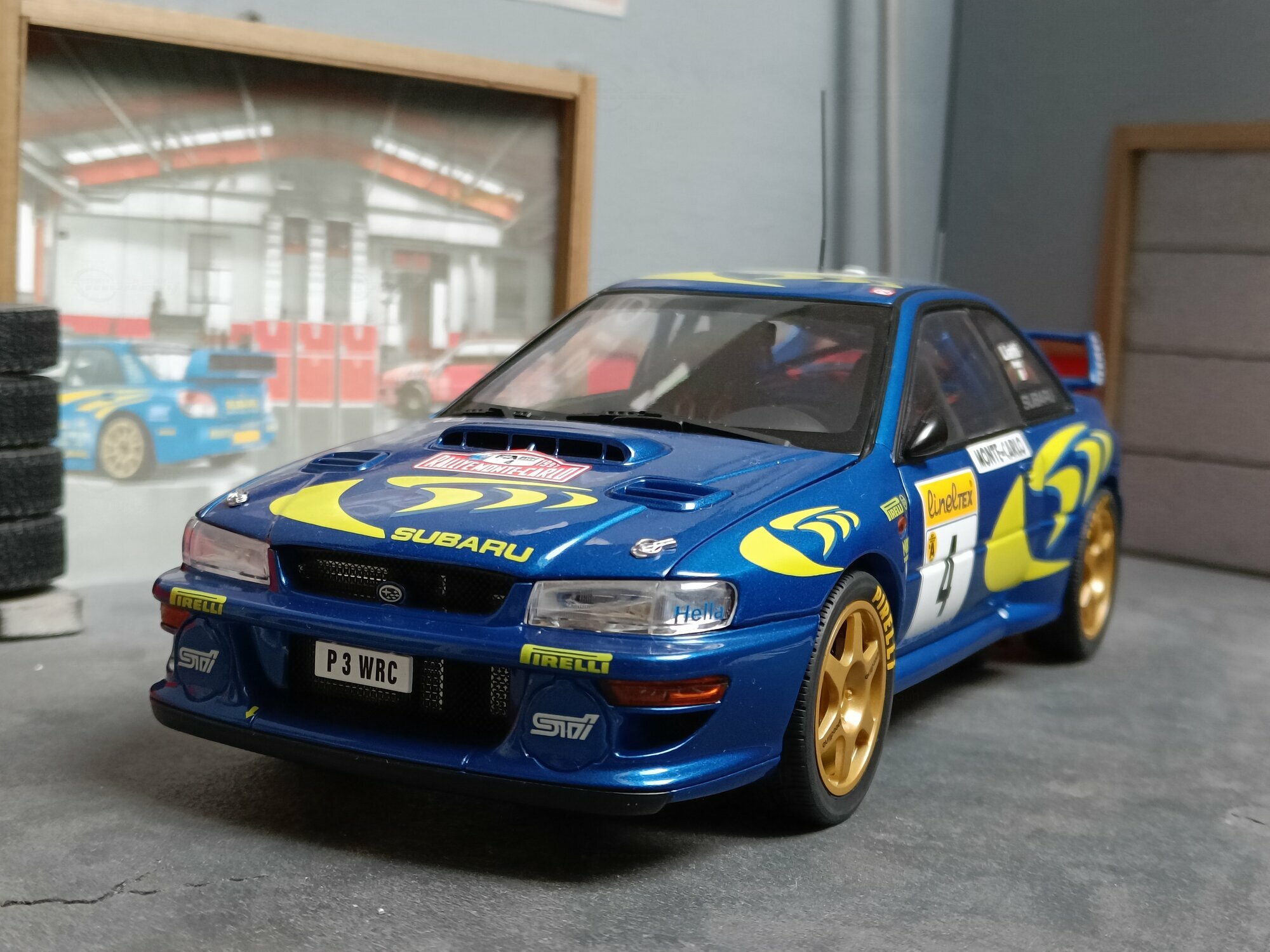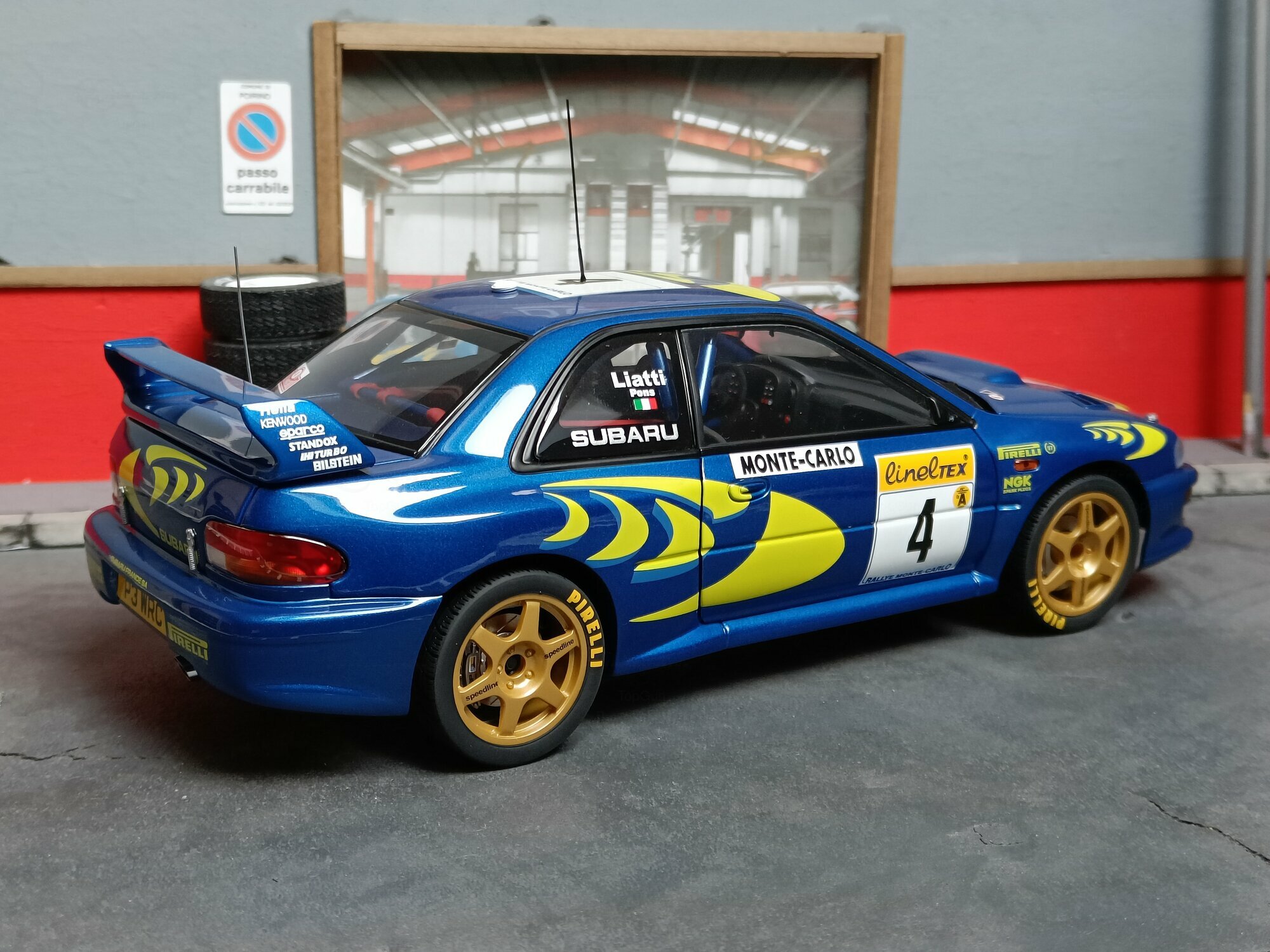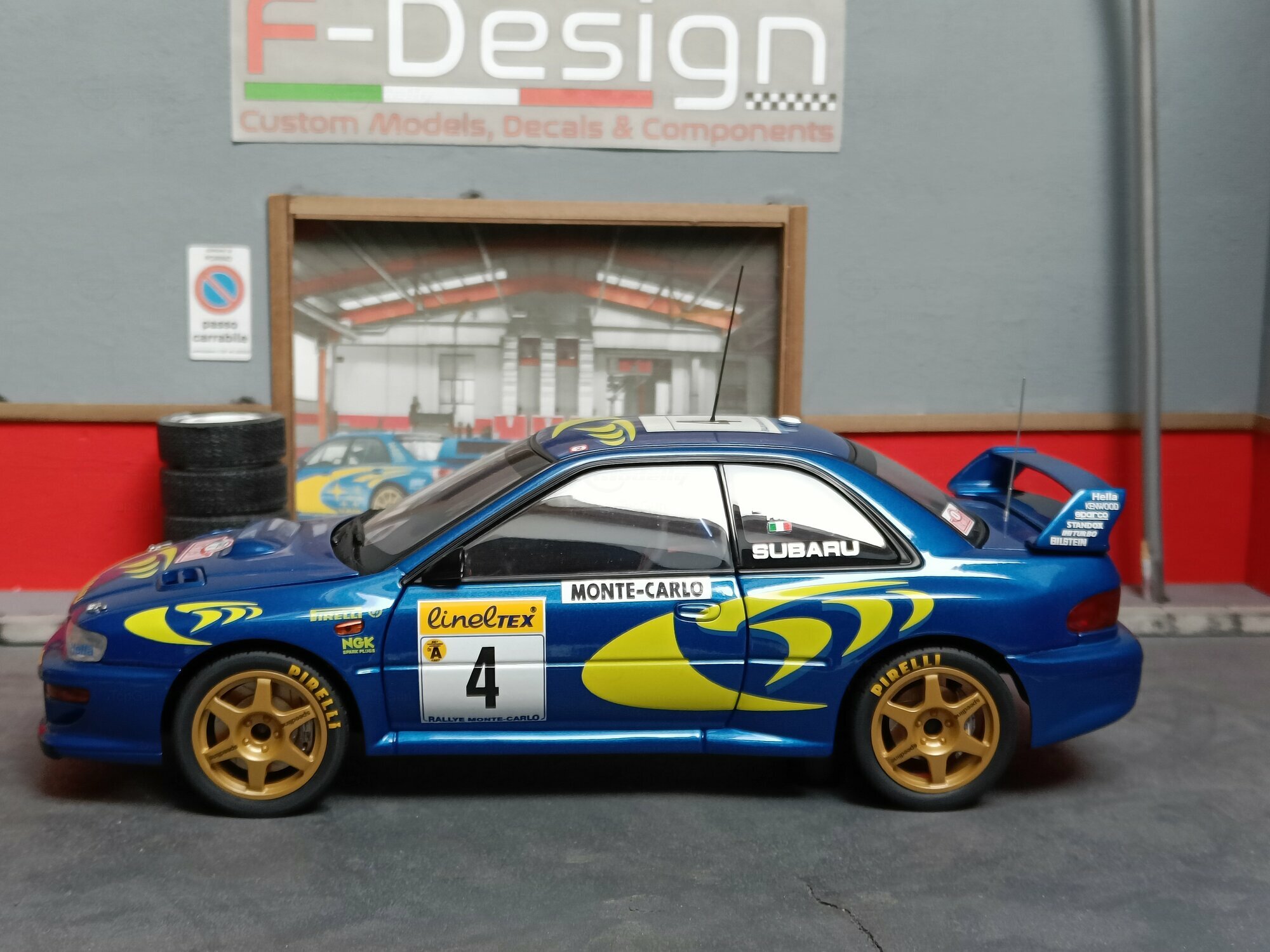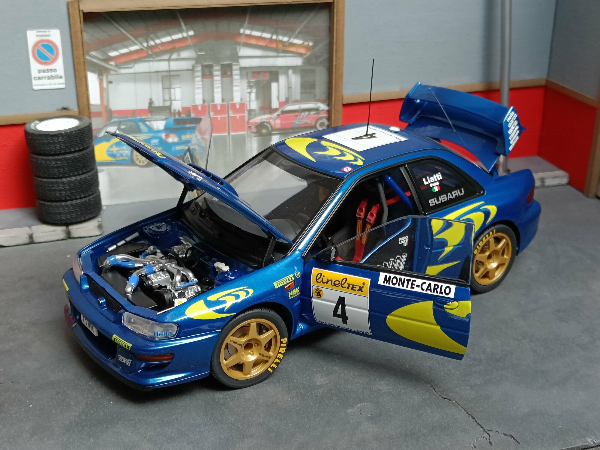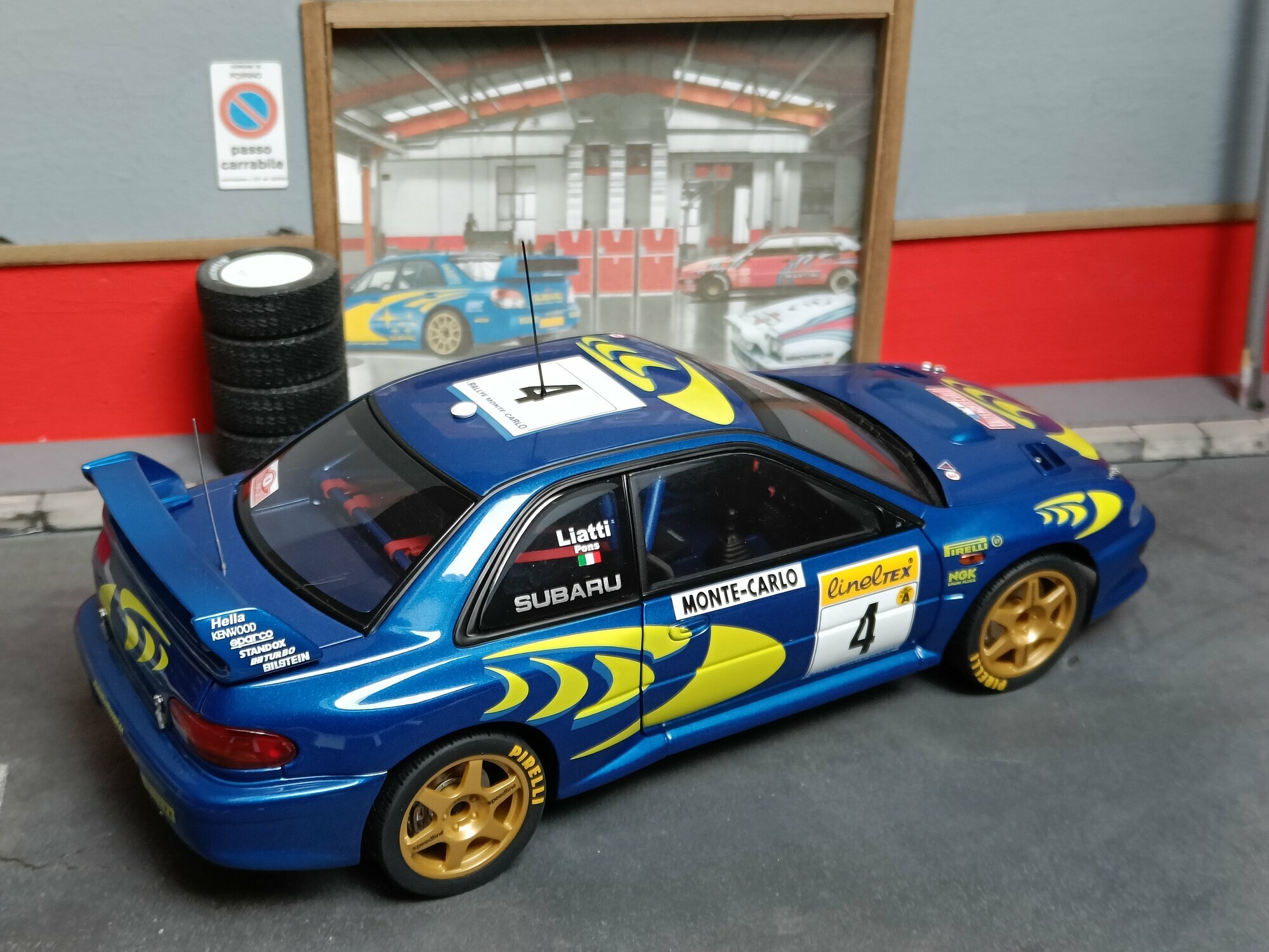 This 1/18-sized model car was created by AUTOart with incredible attention to detail and is based on the rally vehicle from Monte Carlo. It’s made from diecast material, which gives it a solid yet precise finish. This model is part of the collection of the Modelly user "TopGun." One standout feature is the intricate blue paint job with those iconic yellow stripes that symbolize the Subaru World Rally Team. The gold rally wheels, along with the matching sponsor decals from brands like NGK, Pirelli, and Hella, really enhance the dynamic look of the model and capture the authenticity of the original superbly.