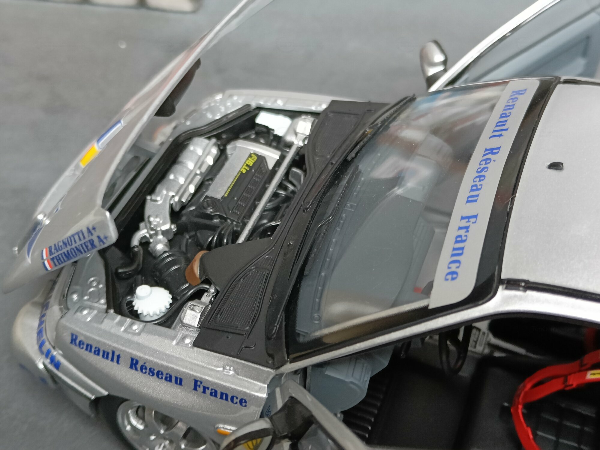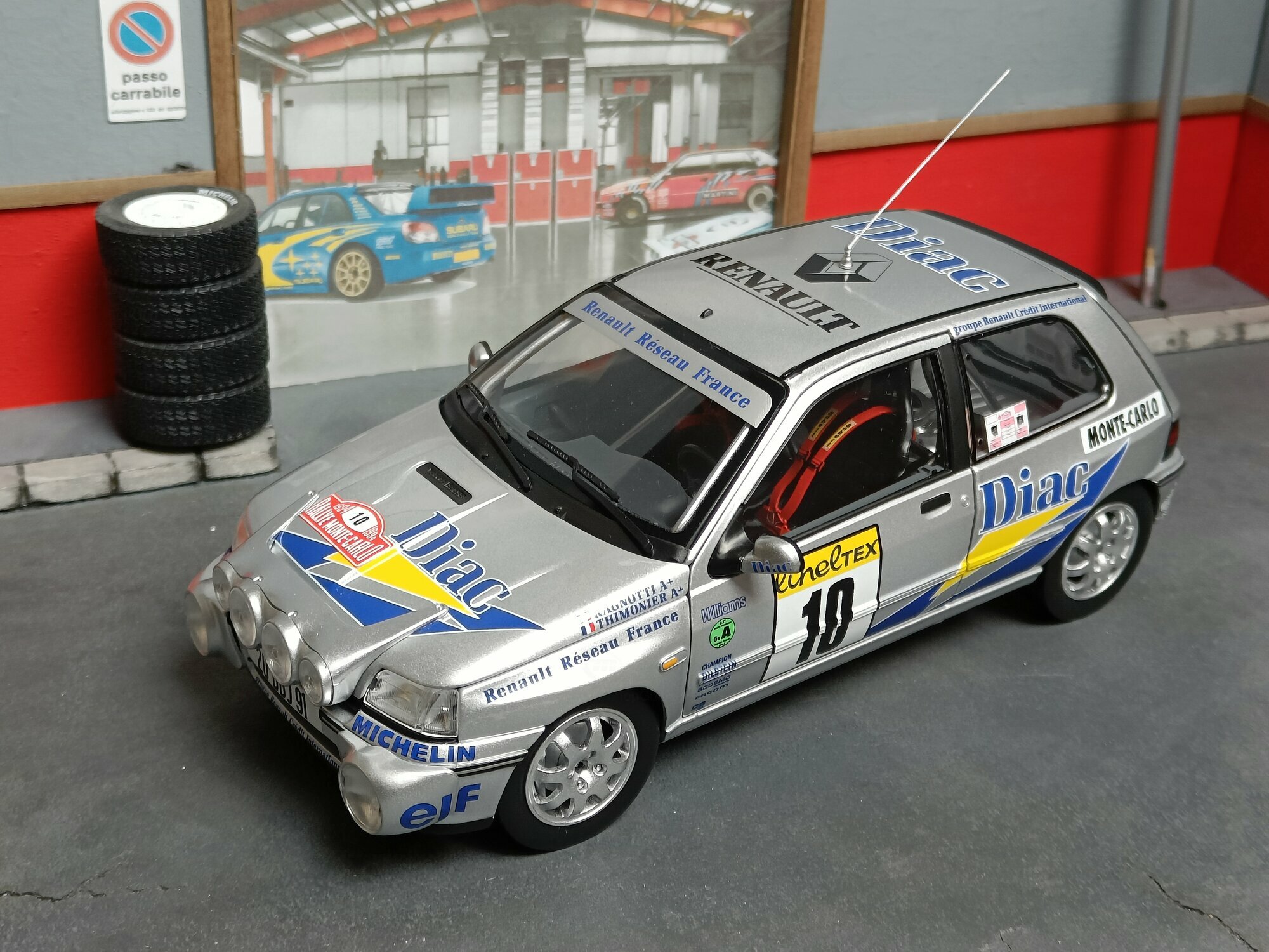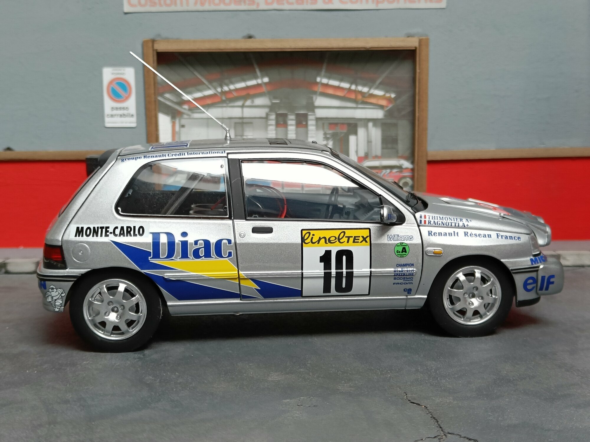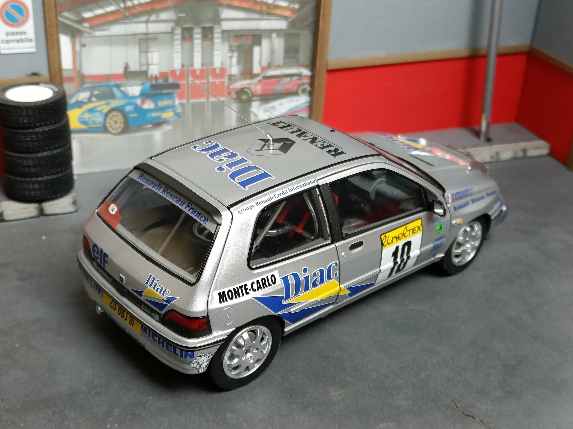 The original Renault Clio Williams stands out with its striking "Sport Blue" paint job with golden accents. The distinctive Williams logos and yellow decorations emphasize the sporty heritage of this vehicle.When it comes to the 1/18 scale model by Norev, the paint job is a standout feature: the detailed reproduction of sponsor logos, including Diac, Michelin, and Elf, on the model showcases a passion for precision. The silver paint job of the model is faithfully done to highlight the classic and sporty aesthetic of the original rally car. Furthermore, the yellow-blue accents and the well-reproduced sponsor decals are remarkable details captured even in the model car.