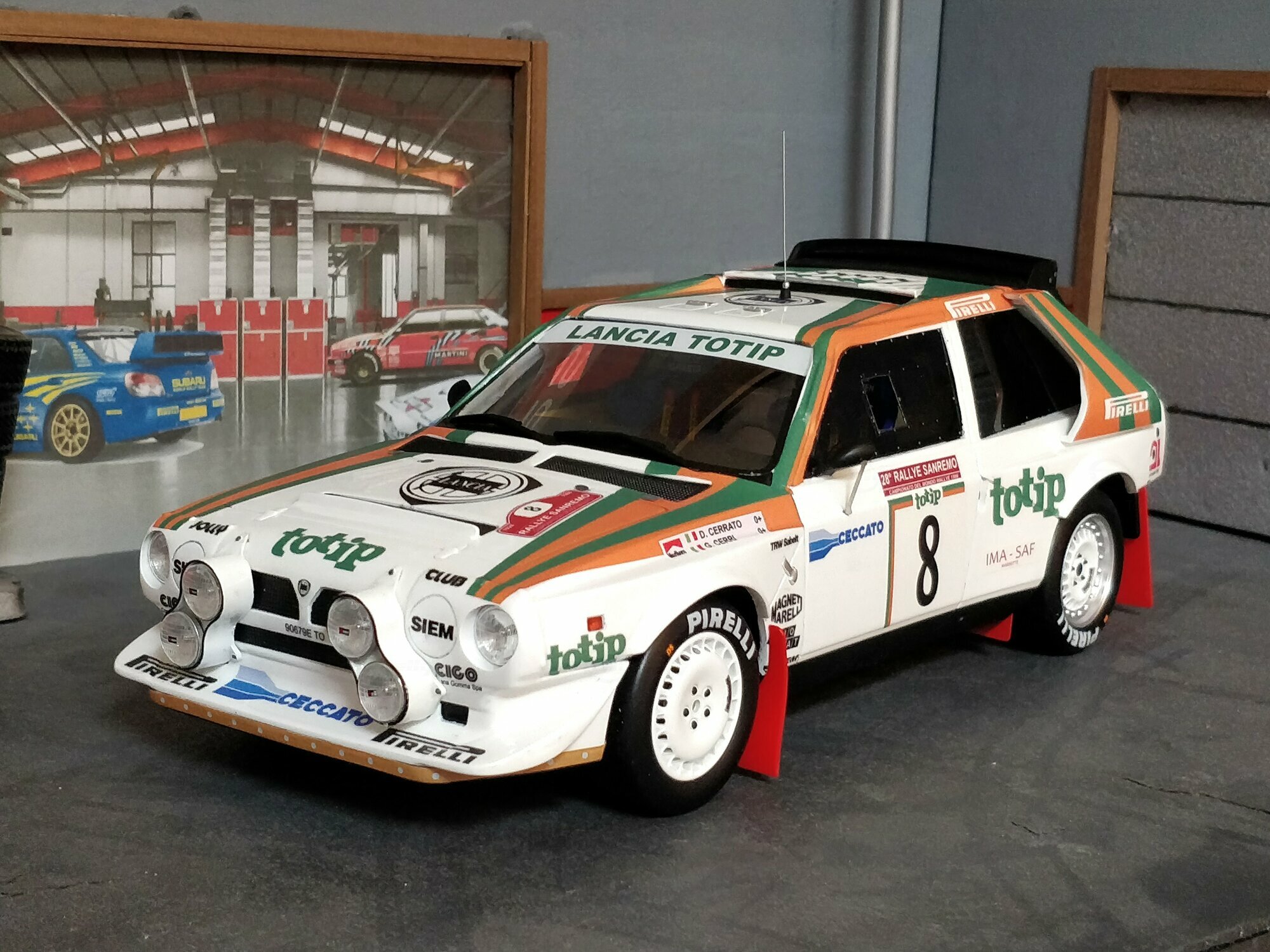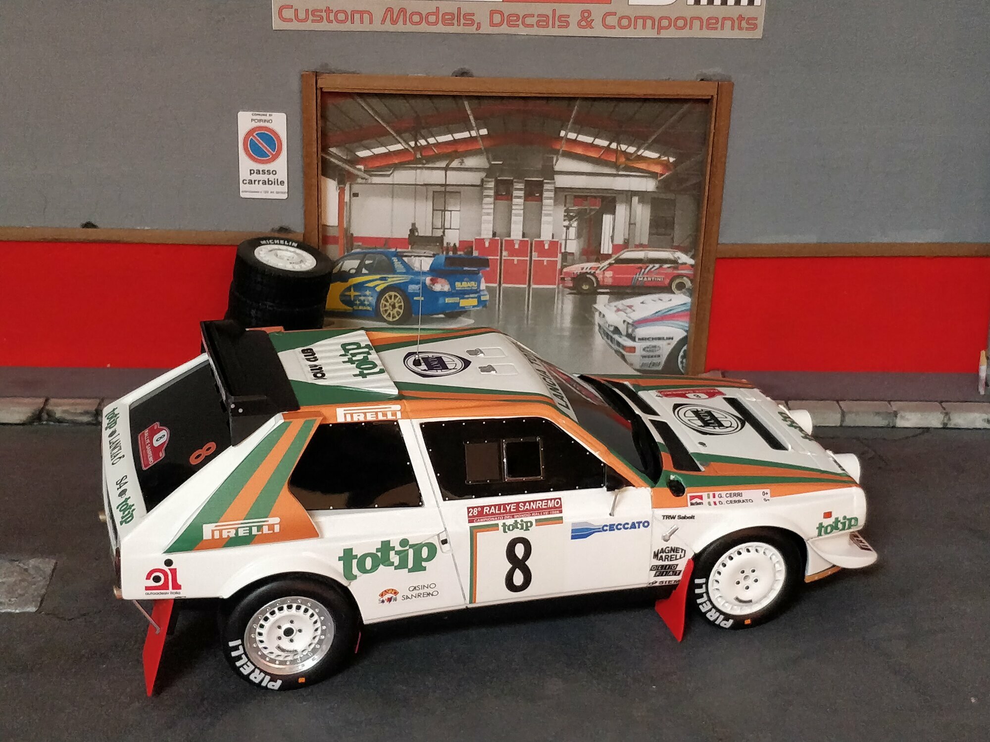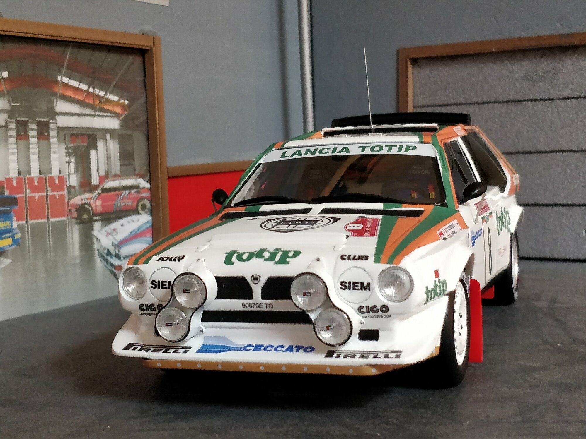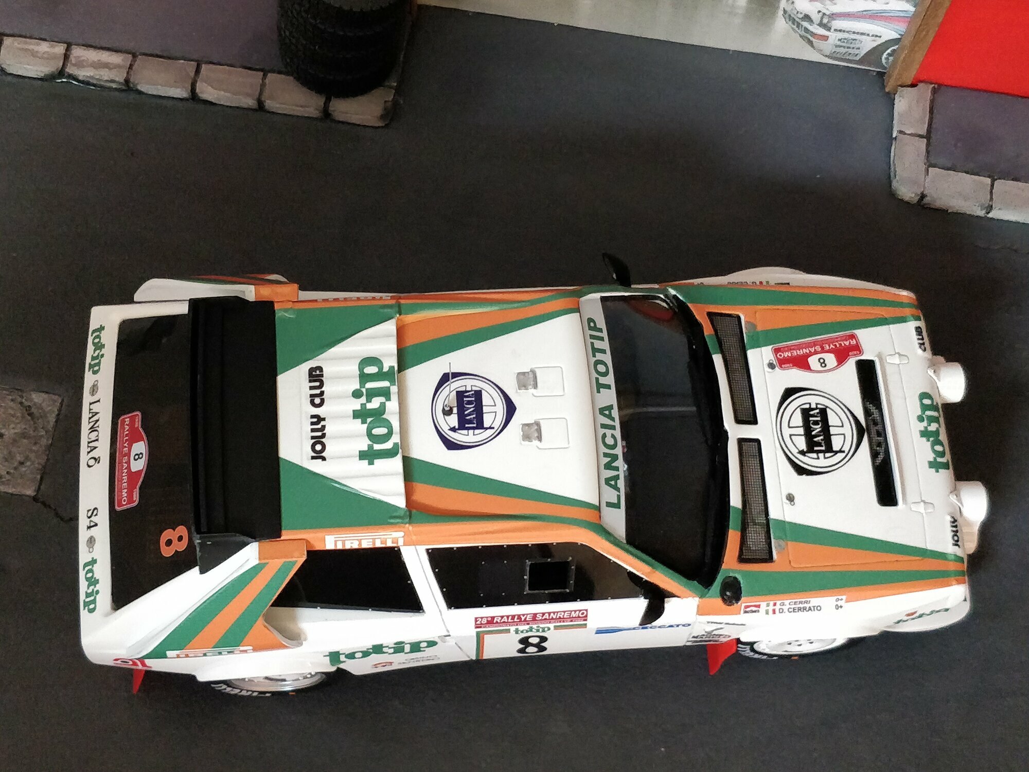 The model car, part of the collection of Modelly member "TopGun," features the distinctive color scheme of the Lancia Delta S4. It is presented in white with striking green and orange color accents that immediately catch the eye, reflecting the sponsor colors of Pirelli, Totip, and Magneti Marelli. Clear sponsor logos and race numbers can be seen on the hood and doors, reminiscent of the historical rally events. The prominent red mudflaps on the rear wheels and authentically replicated headlights and air intakes underline the attention to detail that has gone into this model.