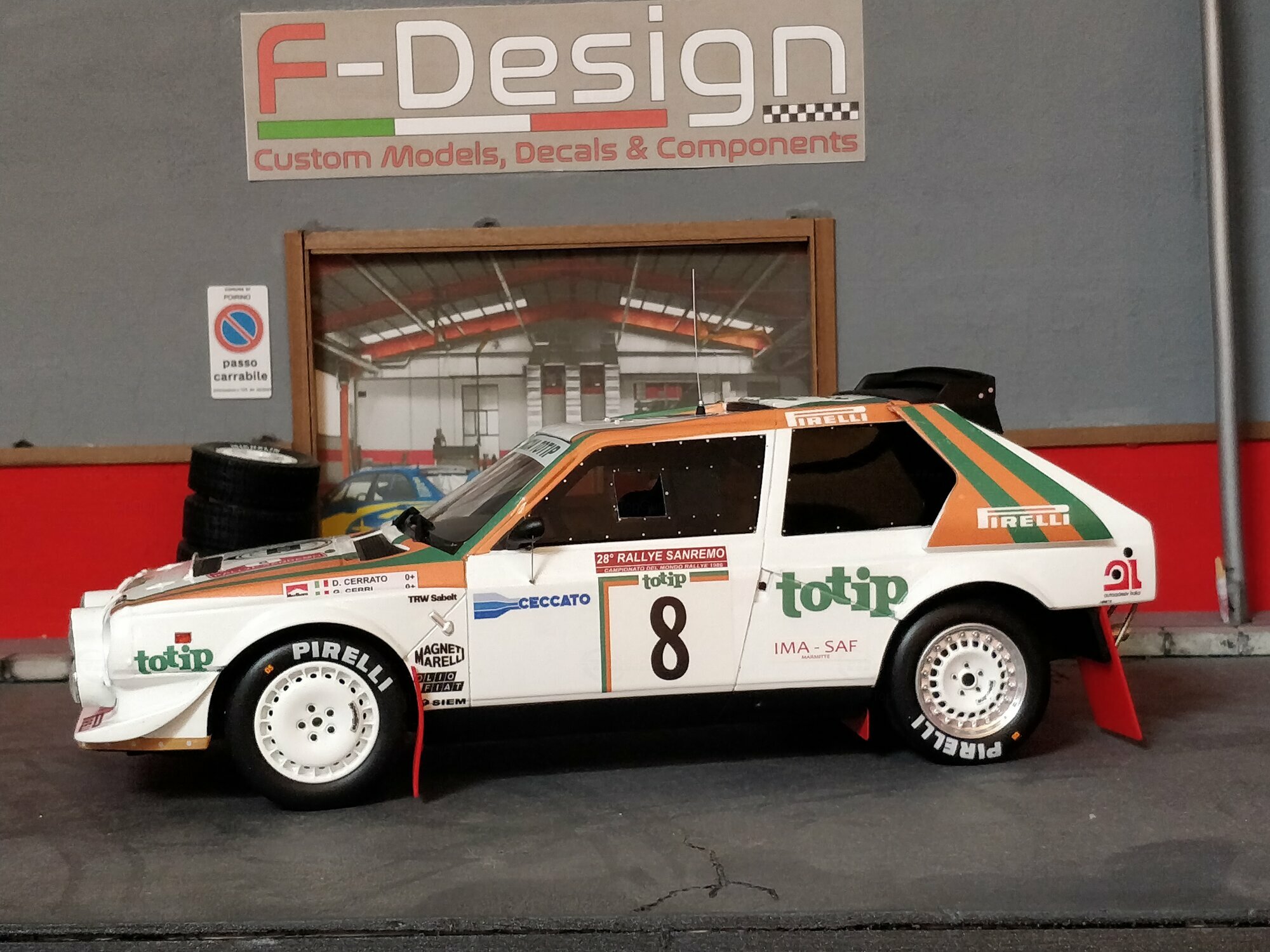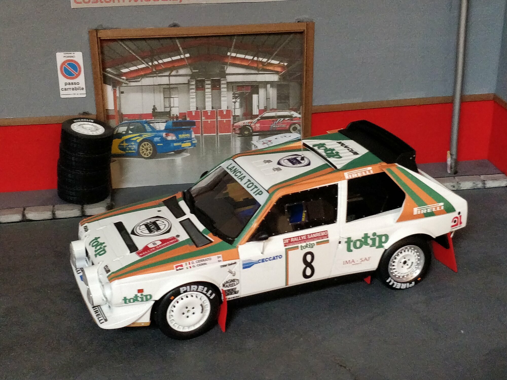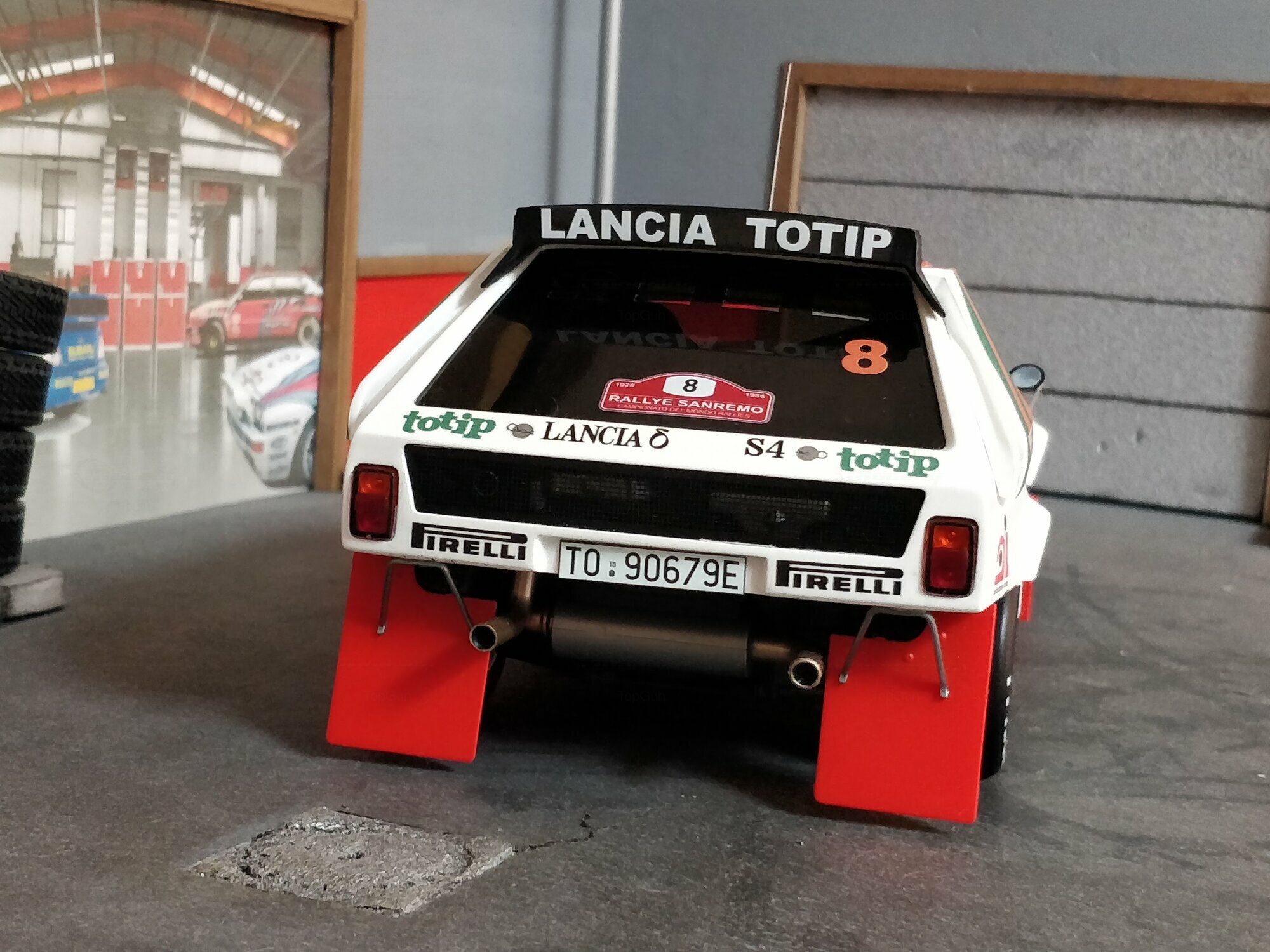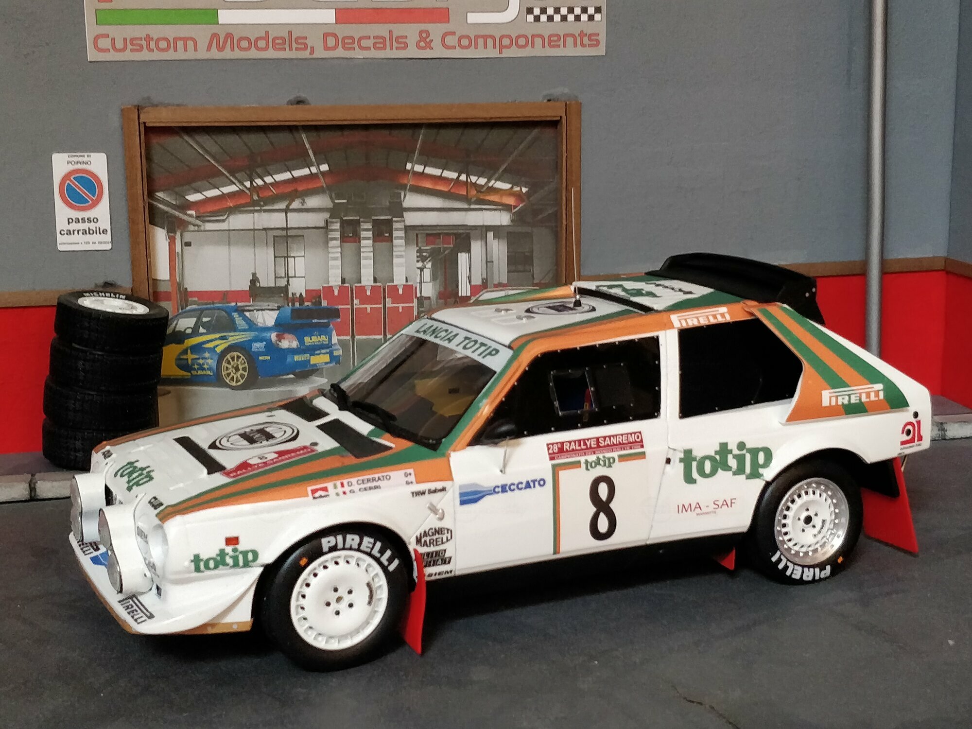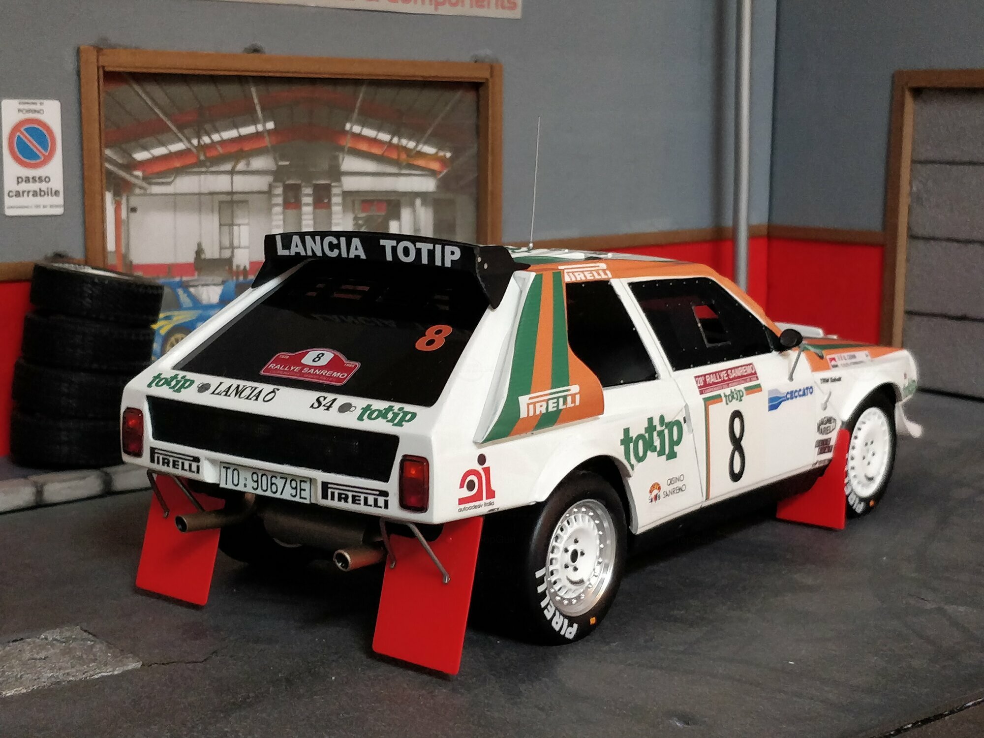 The model car, part of the collection of Modelly member "TopGun," features the distinctive color scheme of the Lancia Delta S4. It is presented in white with striking green and orange color accents that immediately catch the eye, reflecting the sponsor colors of Pirelli, Totip, and Magneti Marelli. Clear sponsor logos and race numbers can be seen on the hood and doors, reminiscent of the historical rally events. The prominent red mudflaps on the rear wheels and authentically replicated headlights and air intakes underline the attention to detail that has gone into this model.