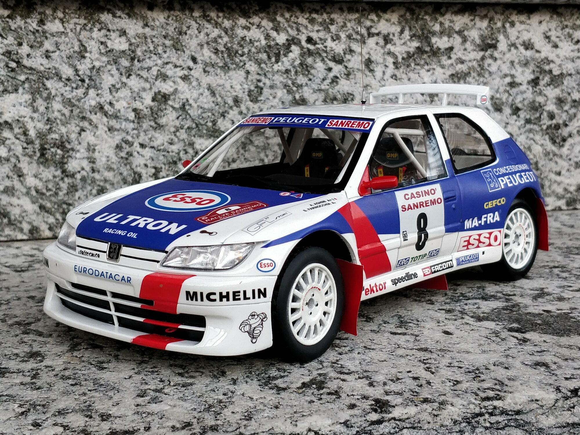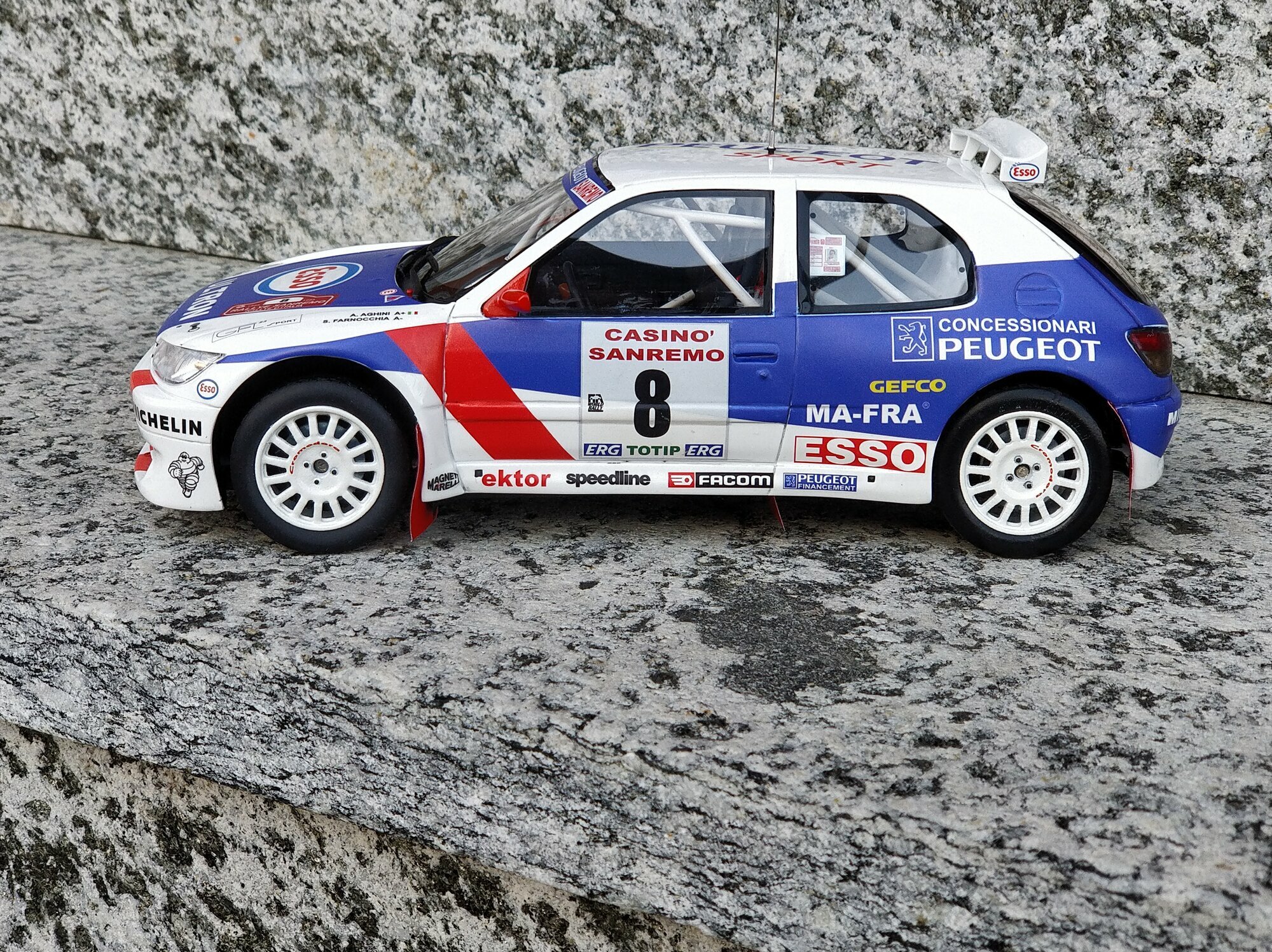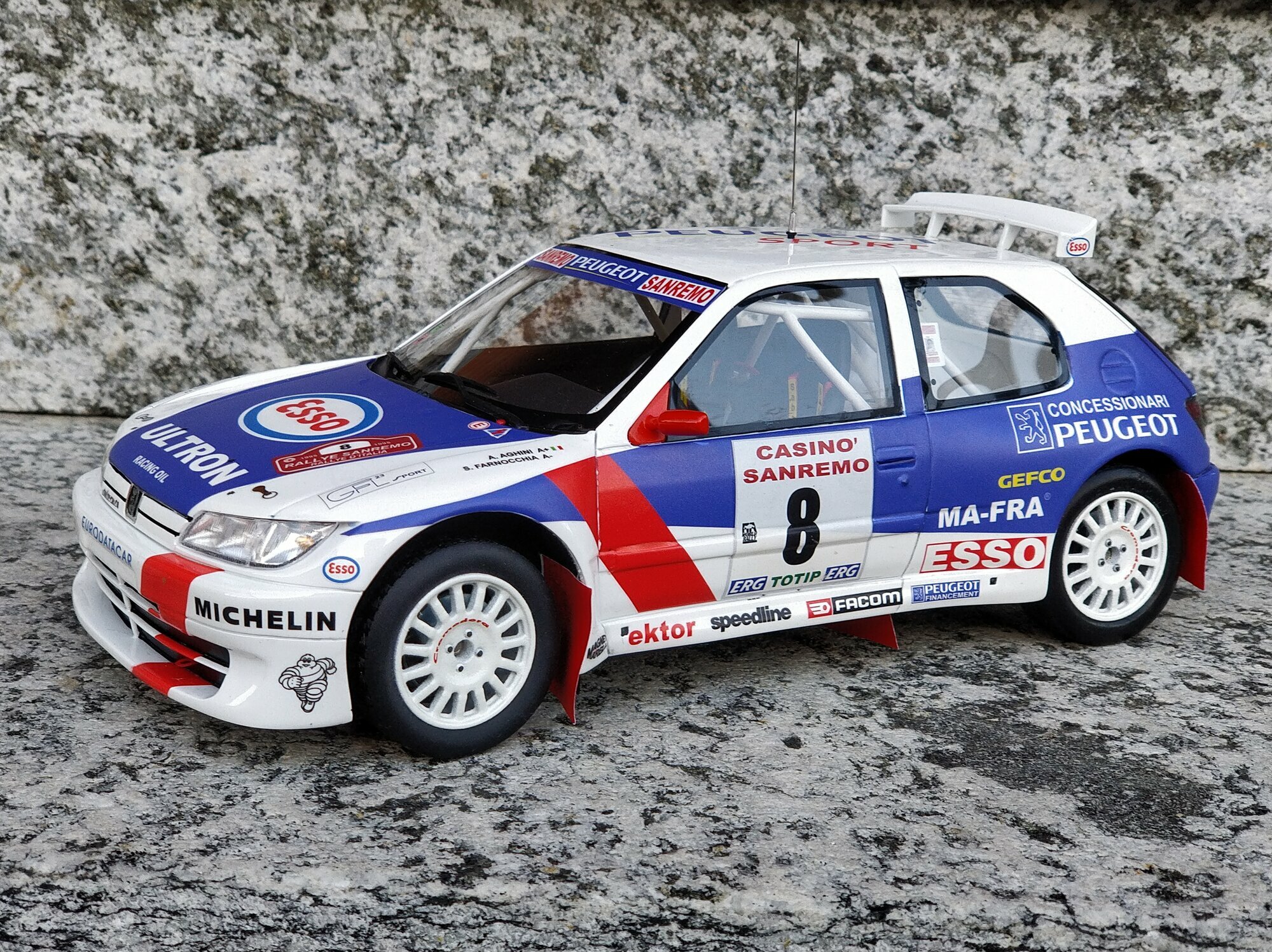 The paint scheme of the Peugeot 306 Maxi is a real eye-catcher on the rally stages. Mostly in the striking colors of white, blue, and red, the body is adorned with numerous sponsor logos. Key sponsors include Esso, Michelin, and Peugeot, prominently featured on the fenders, doors, and hood. The car proudly displayed the name "Casino Sanremo" on the windshield and was embellished with detailed sponsor decals emphasizing its racing heritage.