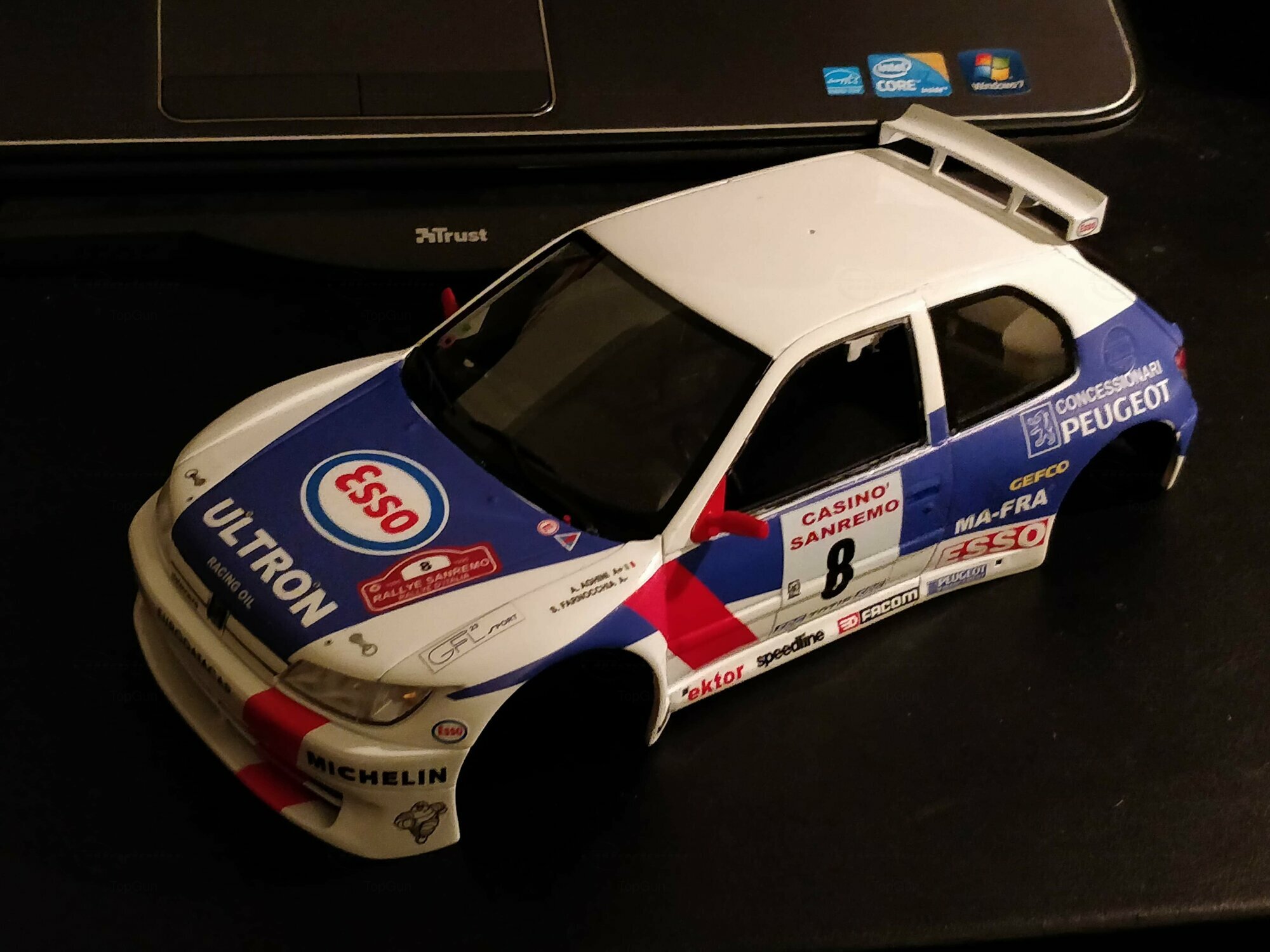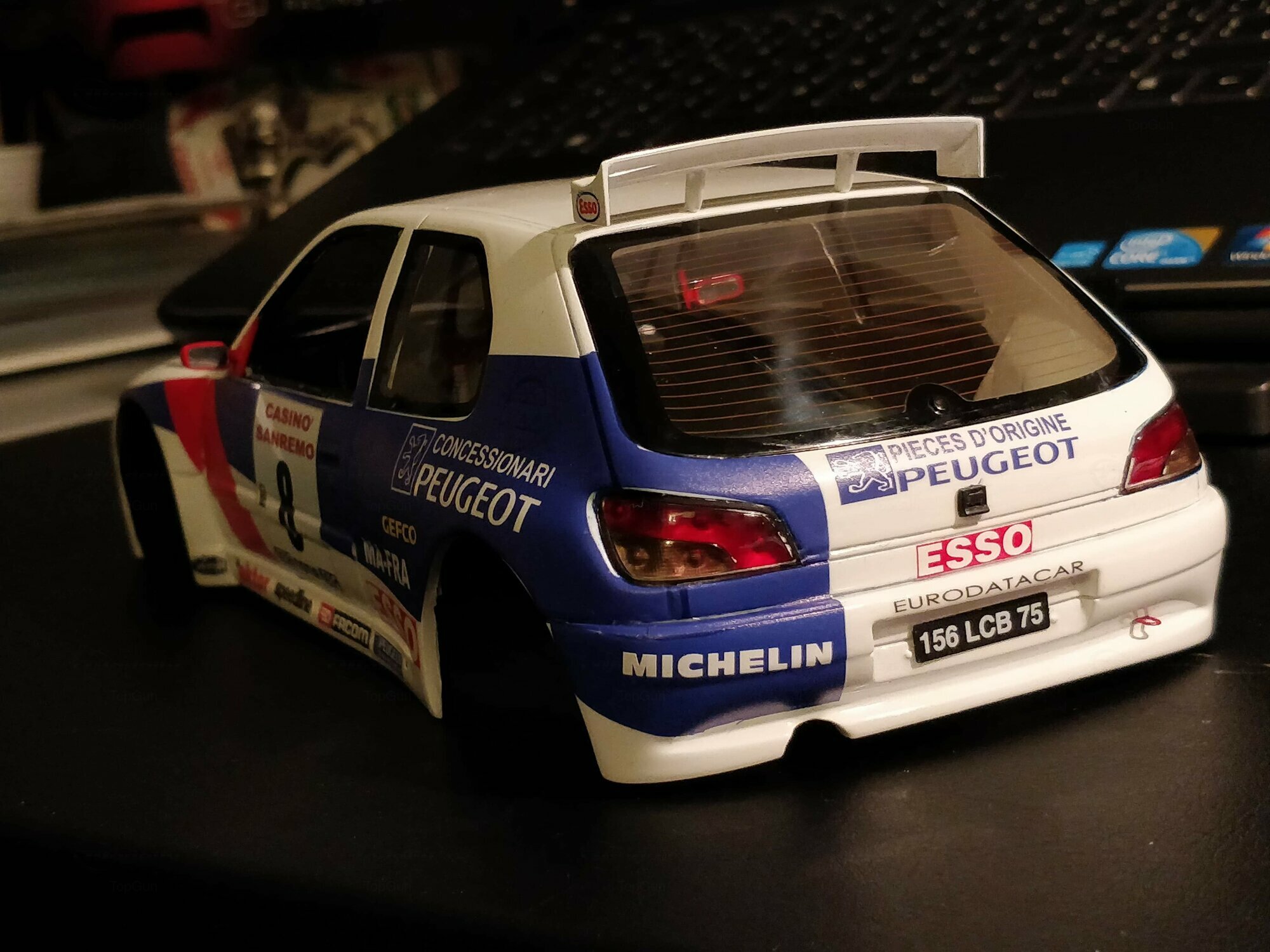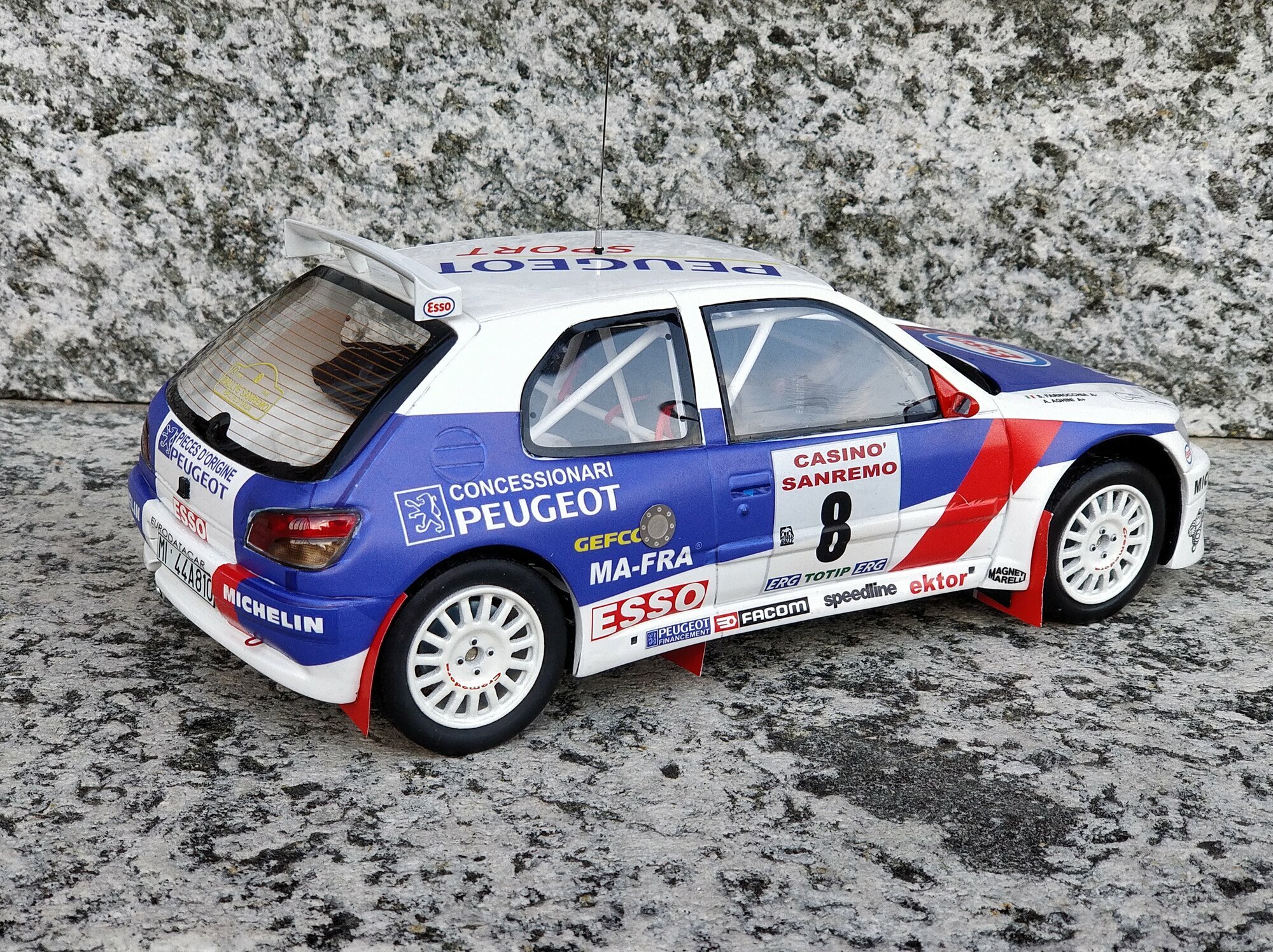 The paint scheme of the Peugeot 306 Maxi is a real eye-catcher on the rally stages. Mostly in the striking colors of white, blue, and red, the body is adorned with numerous sponsor logos. Key sponsors include Esso, Michelin, and Peugeot, prominently featured on the fenders, doors, and hood. The car proudly displayed the name "Casino Sanremo" on the windshield and was embellished with detailed sponsor decals emphasizing its racing heritage.