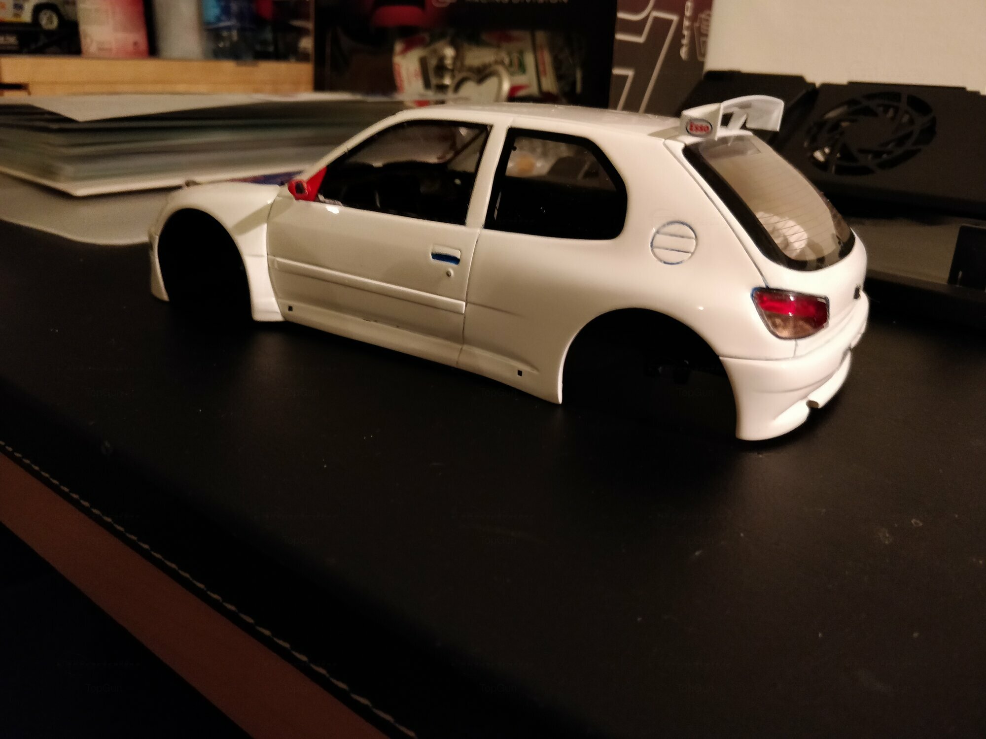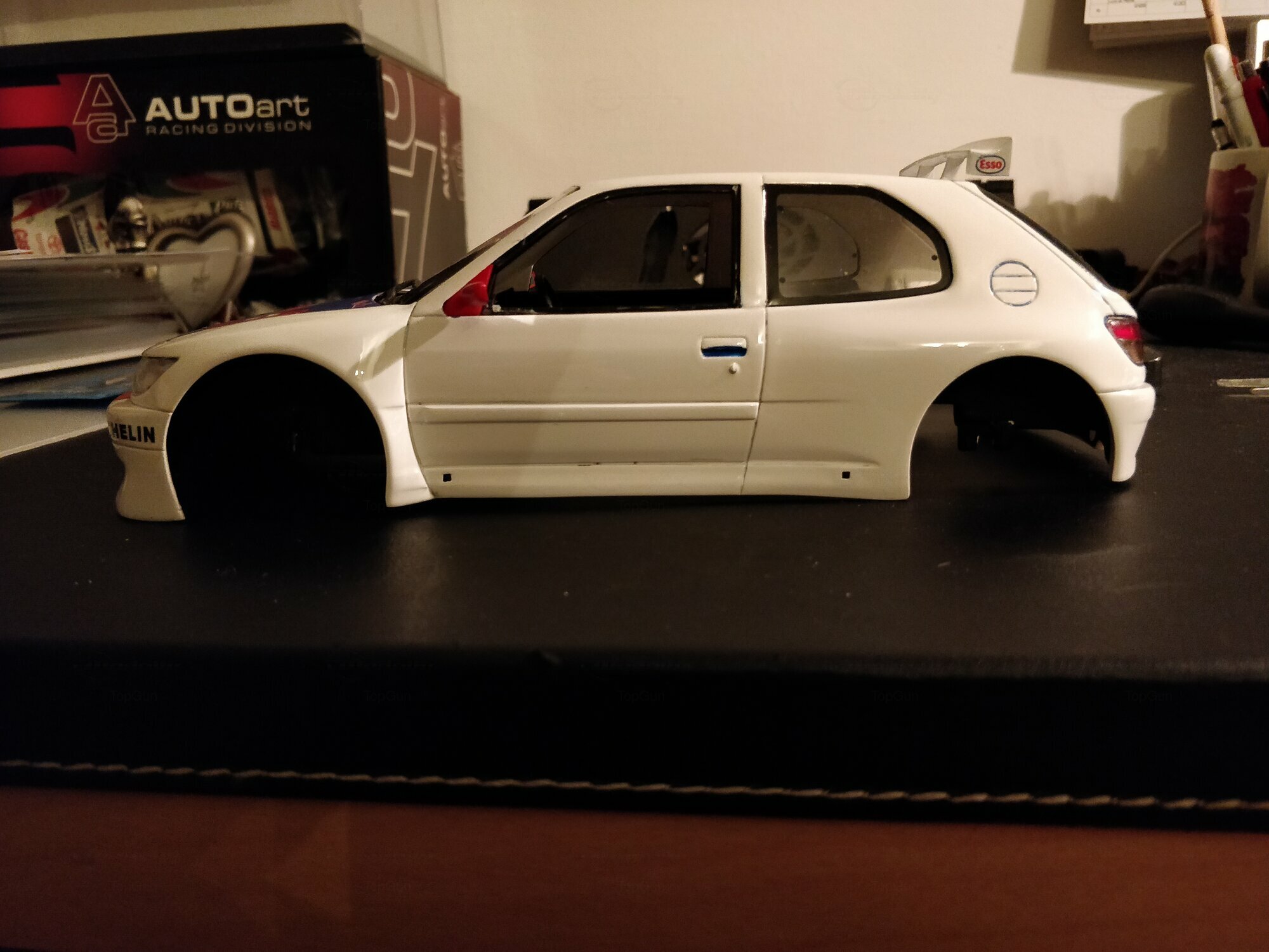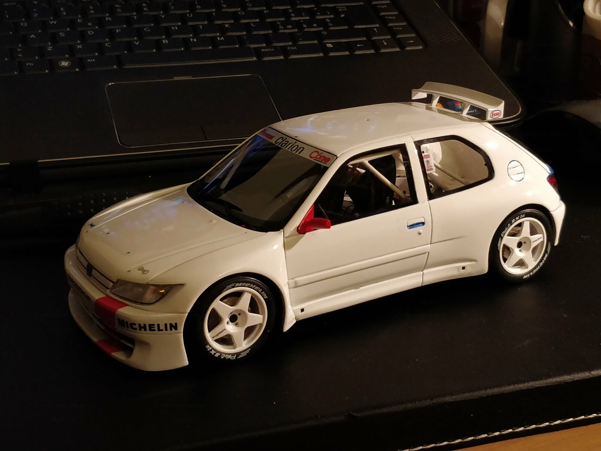The model car, part of the collection of Modelly member "TopGun," stands out for its impressive attention to detail. The paintwork in the typical rally colors of white, blue, and red is accurately reproduced. The sponsor decals, from Esso to Michelin to Peugeot, are precisely placed and cover the entire body. The model replica showcases the front and rear spoilers, the WRC-approved wheels, and the carefully replicated interior structure including the roll cage and bucket seats.