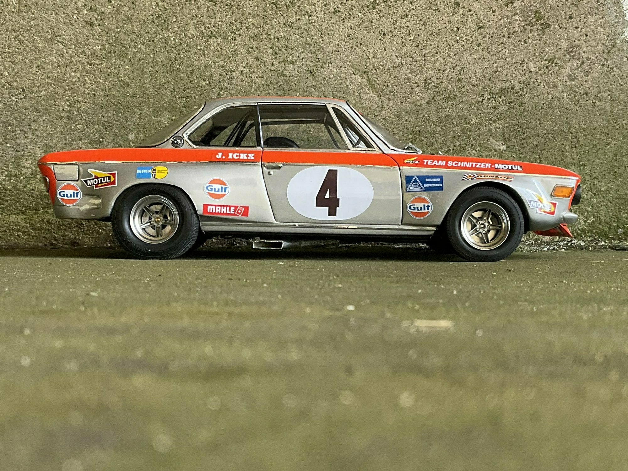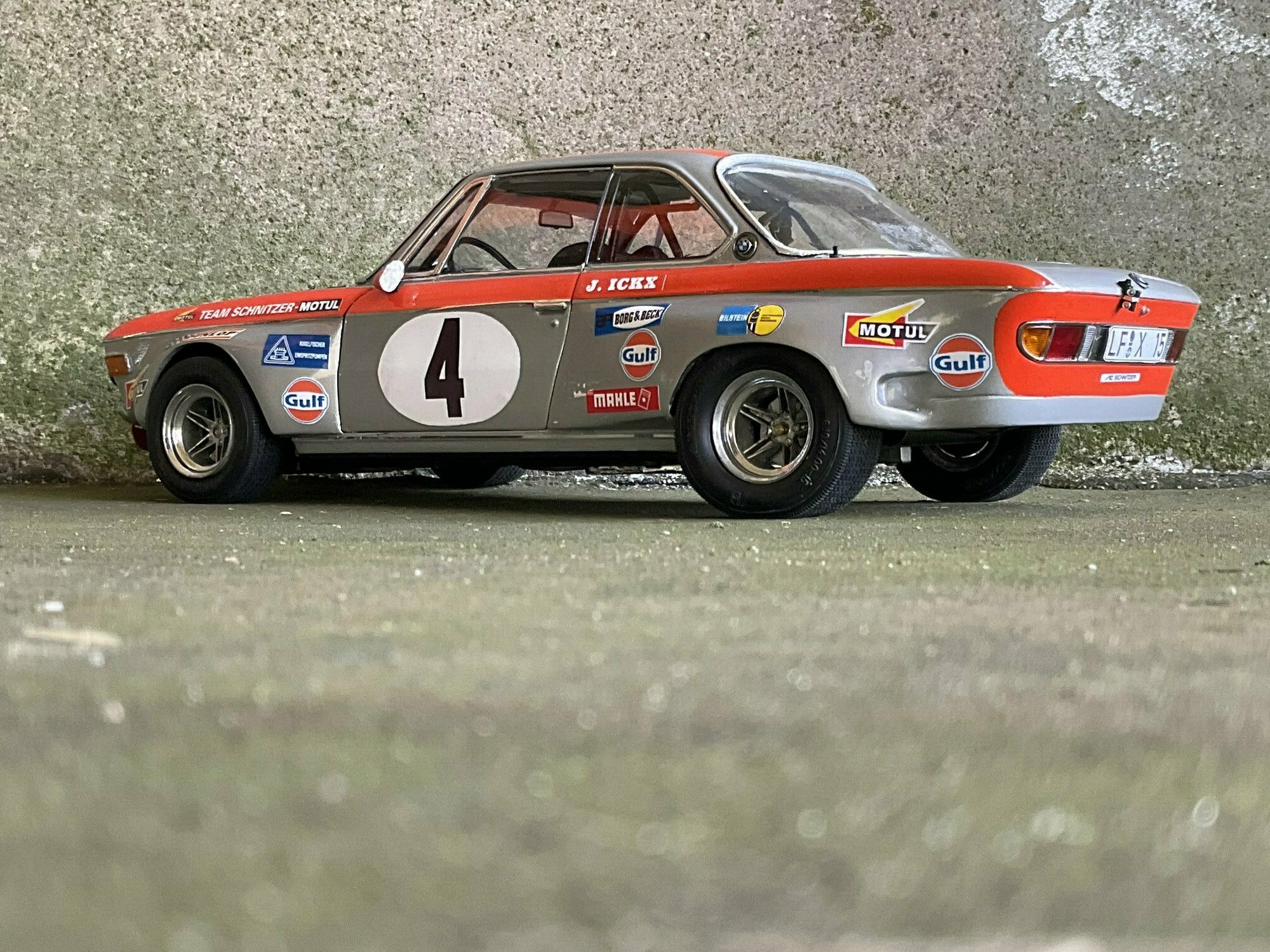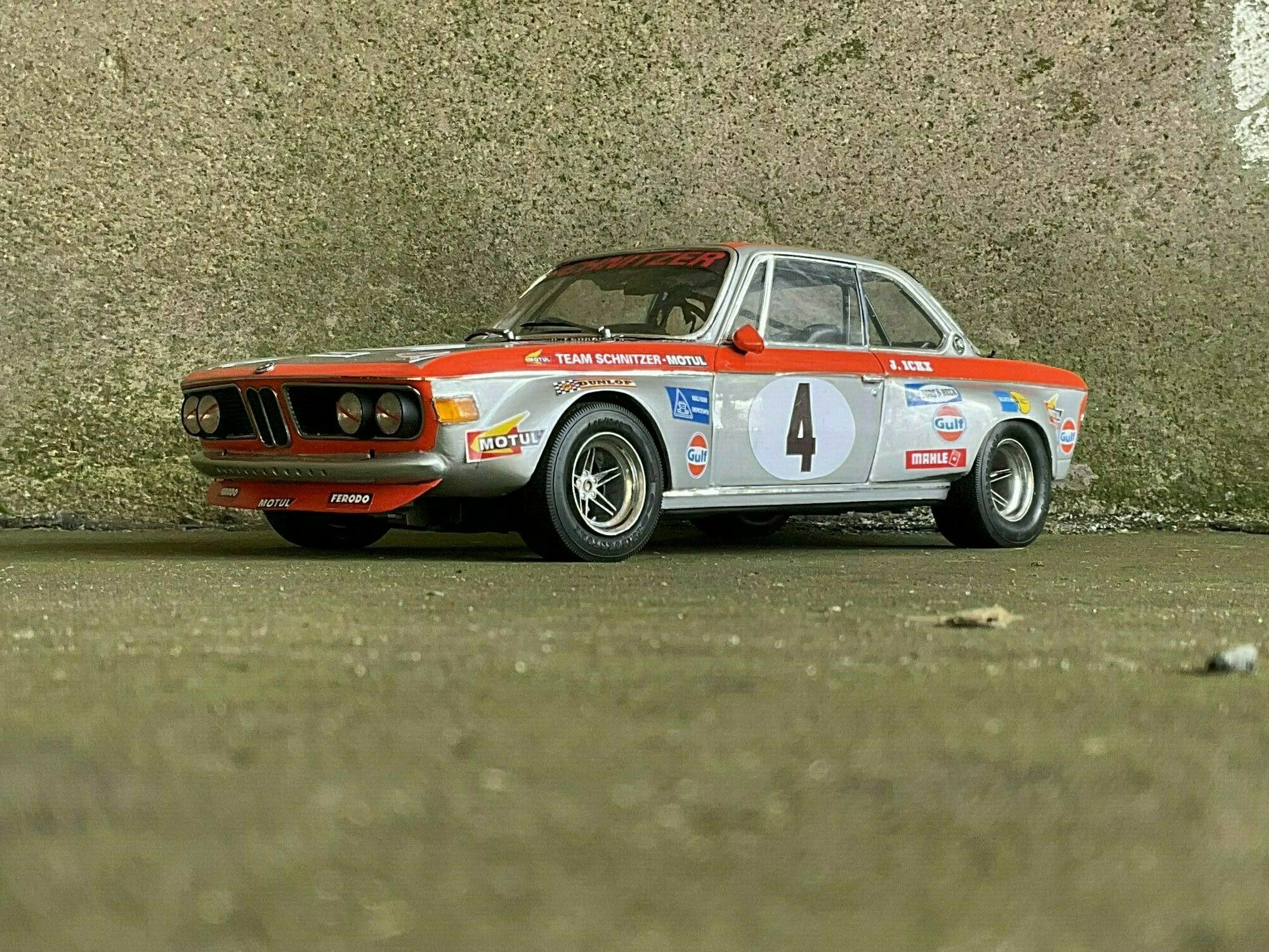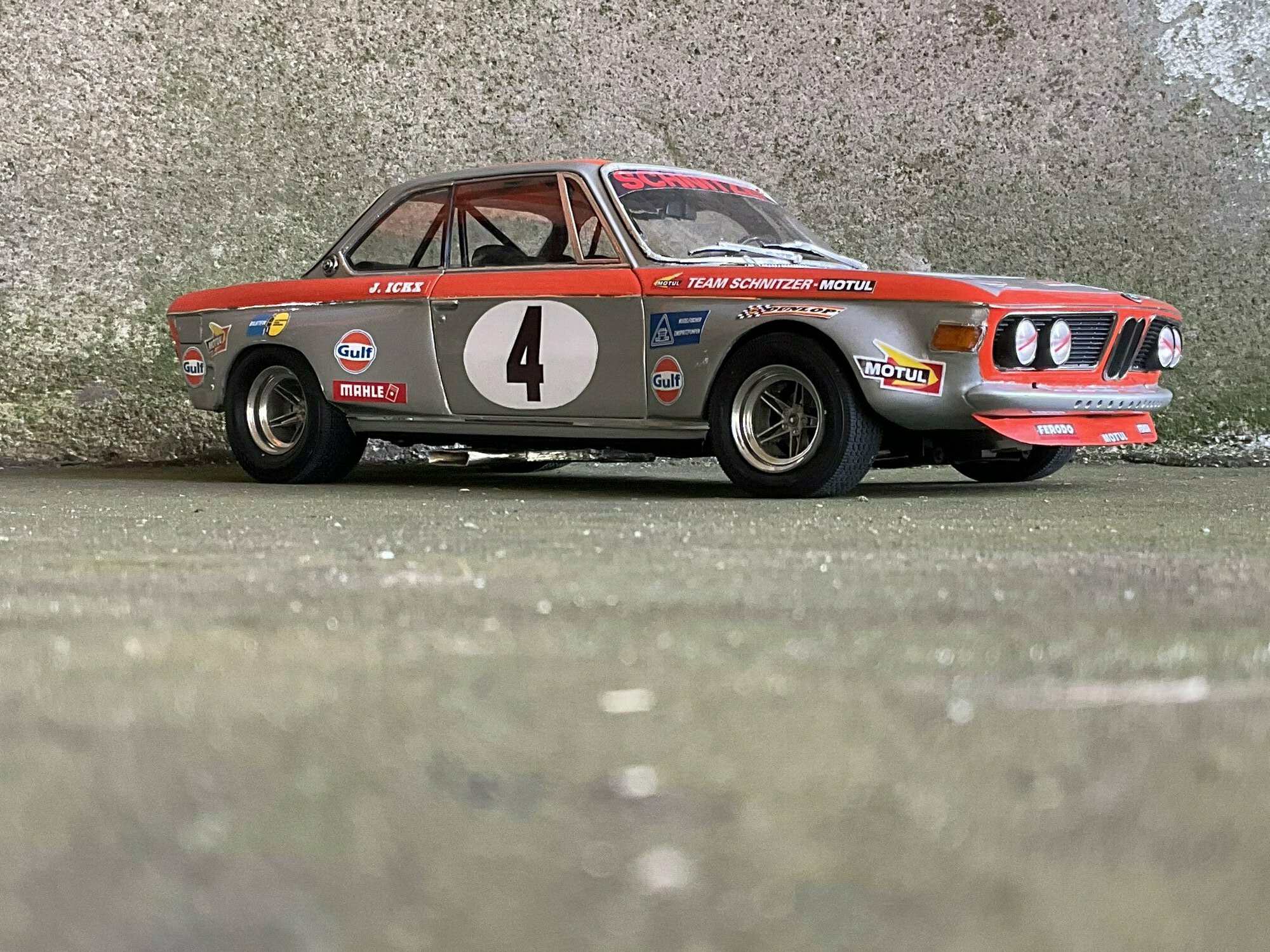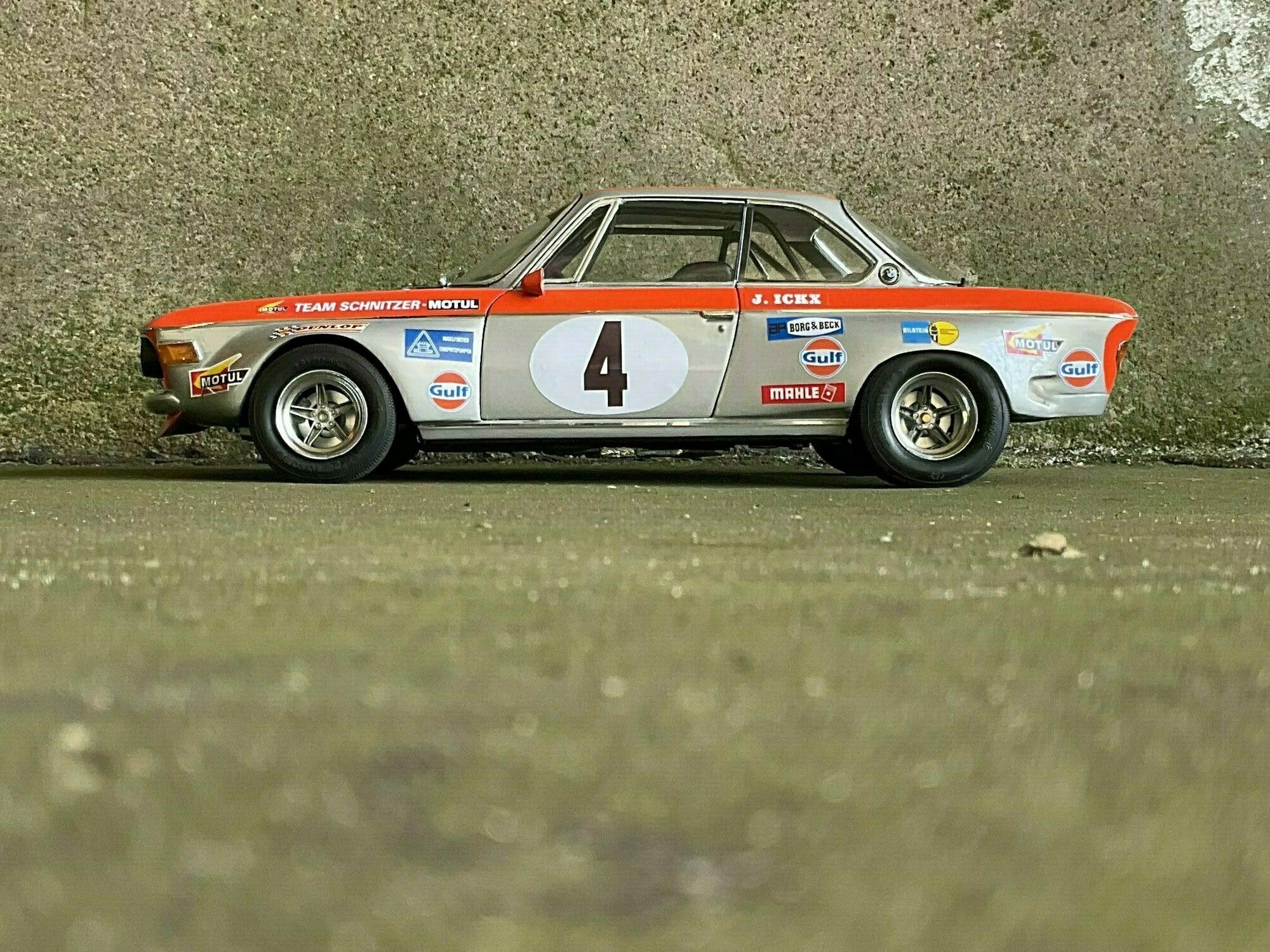 Team Schnitzer often ran silver paint with a bright contrasting color. On this BMW 2800 CS the upper trim line is orange, flowing over the front, fenders and door frames. There’s a white roundel with “4” on both doors and the hood. The windshield sunstrip reads “Schnitzer”, and the driver side carries “J. Ickx” (a nod to Jacky Ickx). The front has the twin BMW grille and four round lamps; the big red lower spoiler and visible sponsor decals include Gulf, Motul, Mahle, Ferodo and Borg & Beck. The five‑spoke rims with wide tires, a side exhaust and the removed chrome bumpers finish off the race look. The diecast body’s panel lines and gaps are clean, which is nice for a model this size. Once more: this particular piece is a customized 1/12 model from KK Scale, not the unmodified product from the maker.