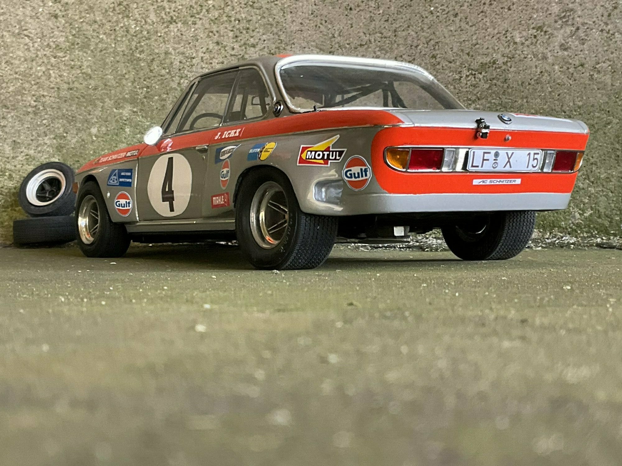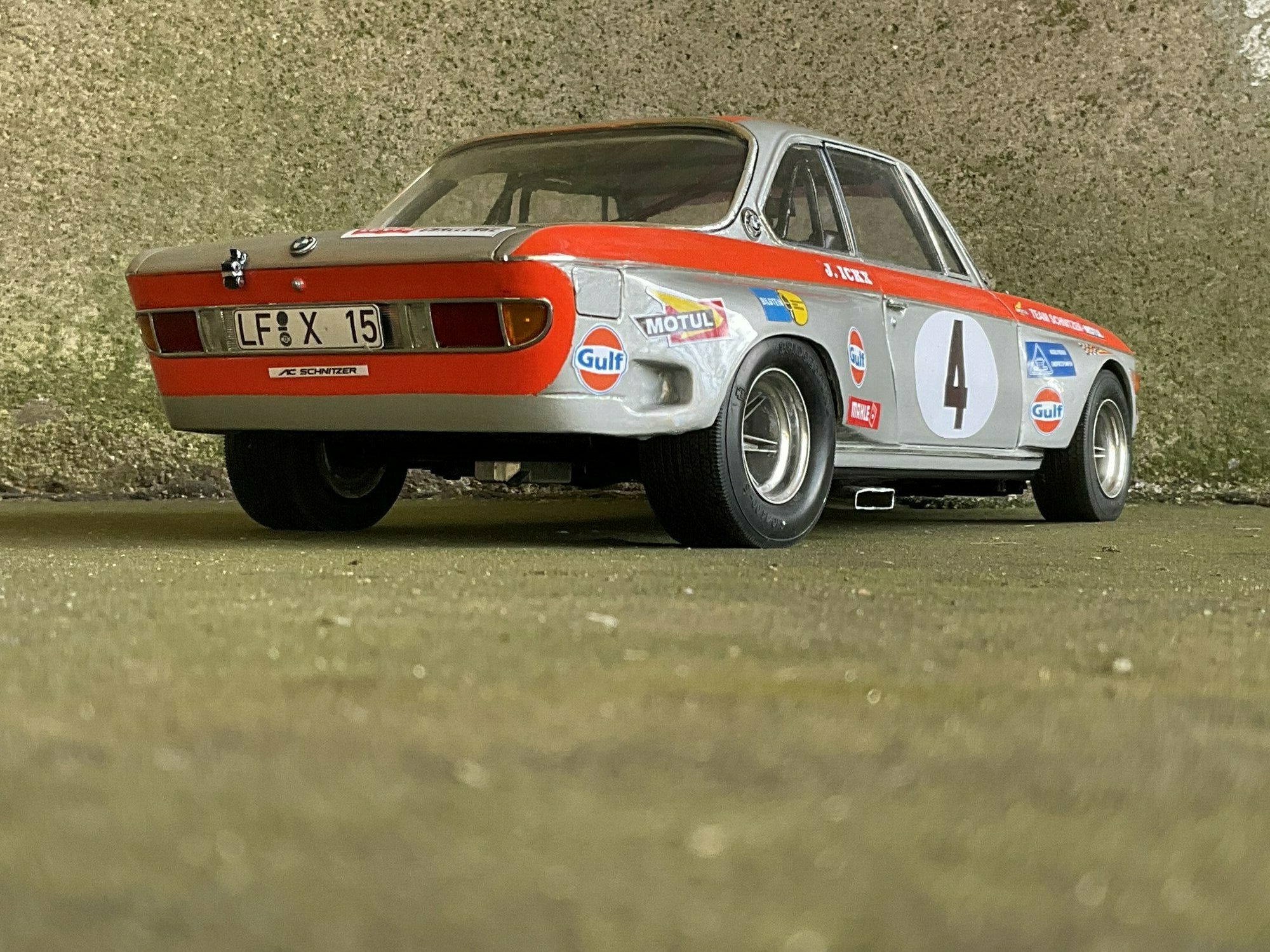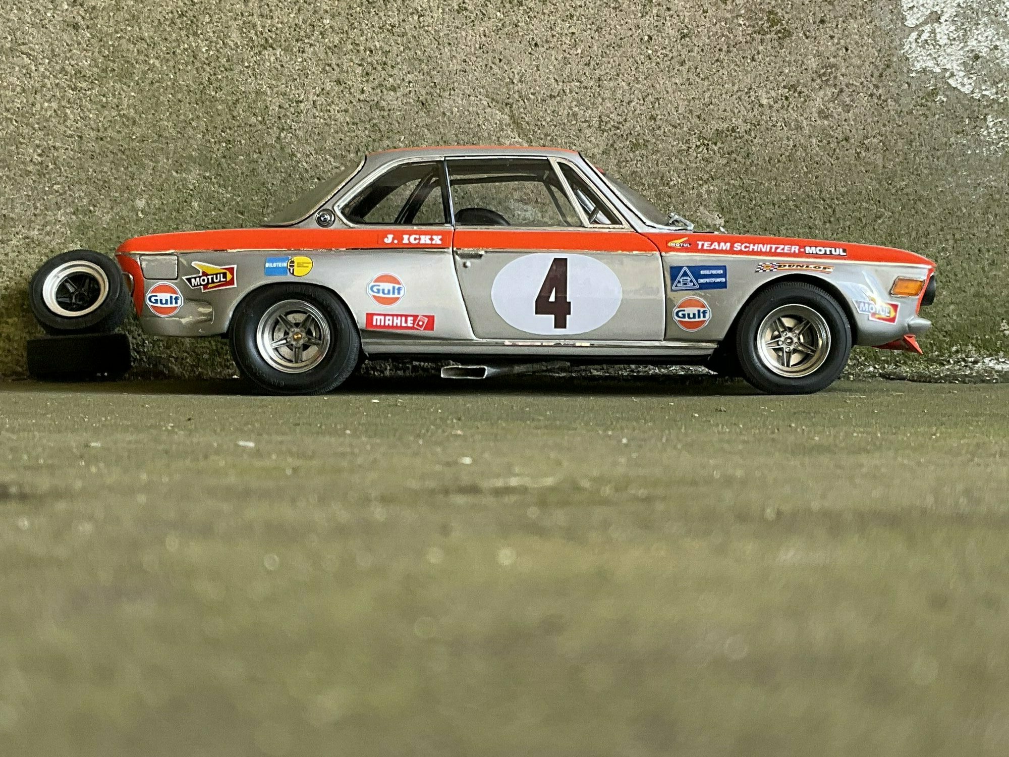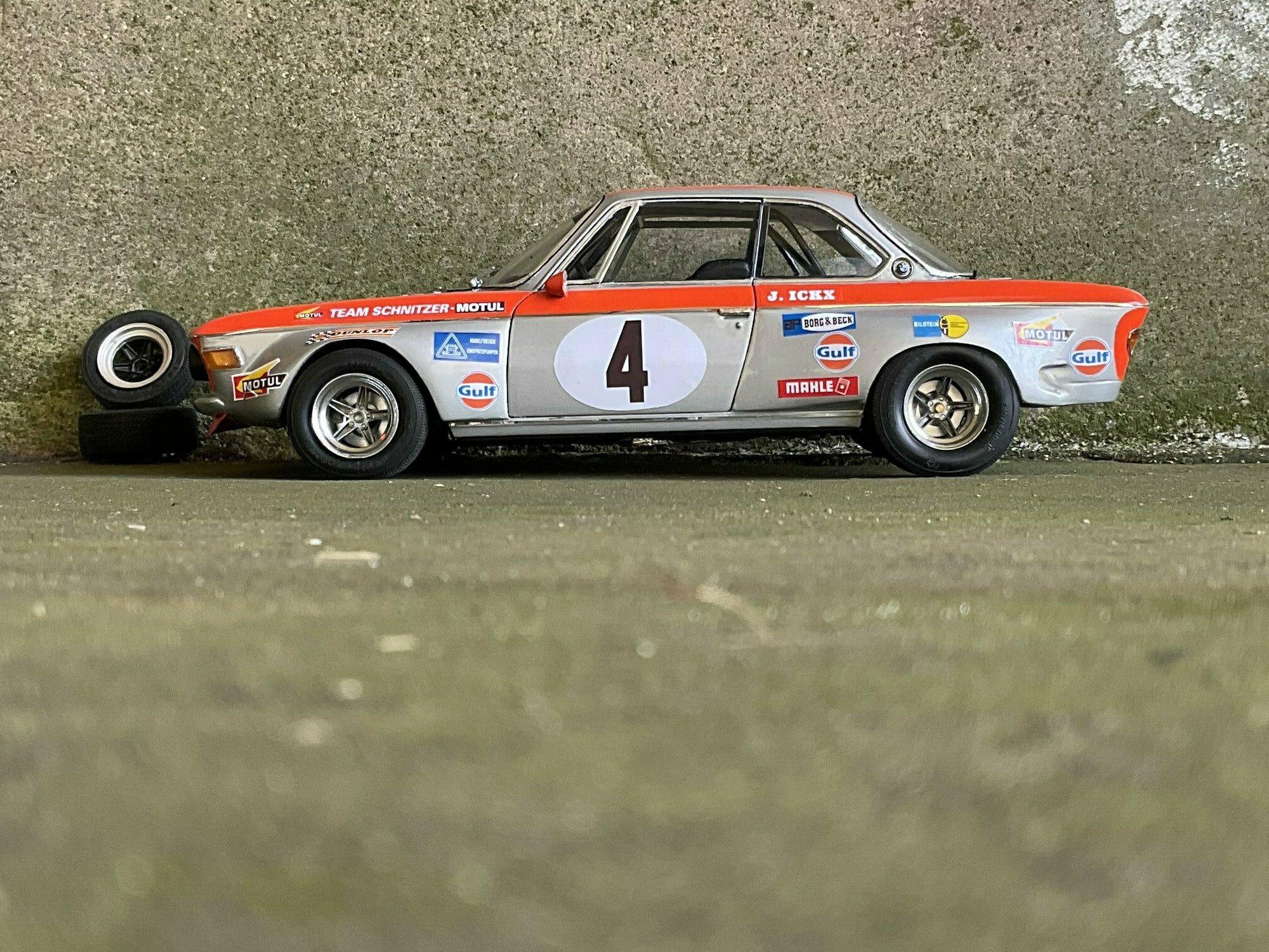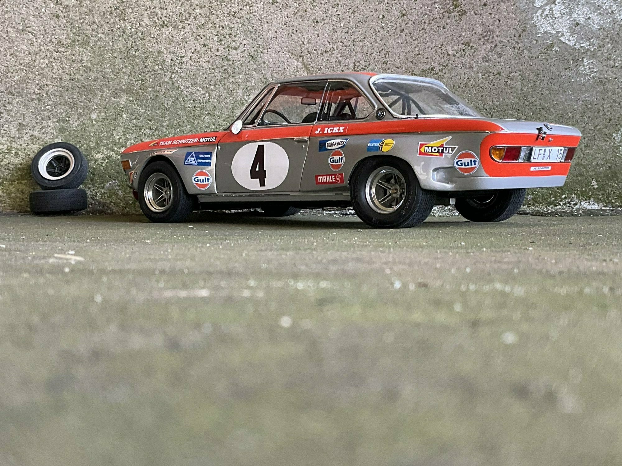 Team Schnitzer often ran silver paint with a bright contrasting color. On this BMW 2800 CS the upper trim line is orange, flowing over the front, fenders and door frames. There’s a white roundel with “4” on both doors and the hood. The windshield sunstrip reads “Schnitzer”, and the driver side carries “J. Ickx” (a nod to Jacky Ickx). The front has the twin BMW grille and four round lamps; the big red lower spoiler and visible sponsor decals include Gulf, Motul, Mahle, Ferodo and Borg & Beck. The five‑spoke rims with wide tires, a side exhaust and the removed chrome bumpers finish off the race look. The diecast body’s panel lines and gaps are clean, which is nice for a model this size. Once more: this particular piece is a customized 1/12 model from KK Scale, not the unmodified product from the maker.