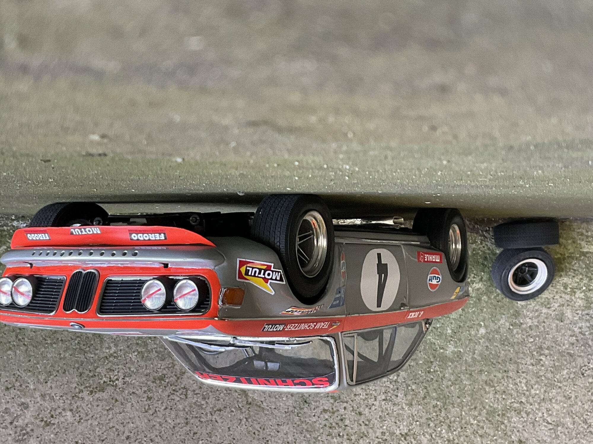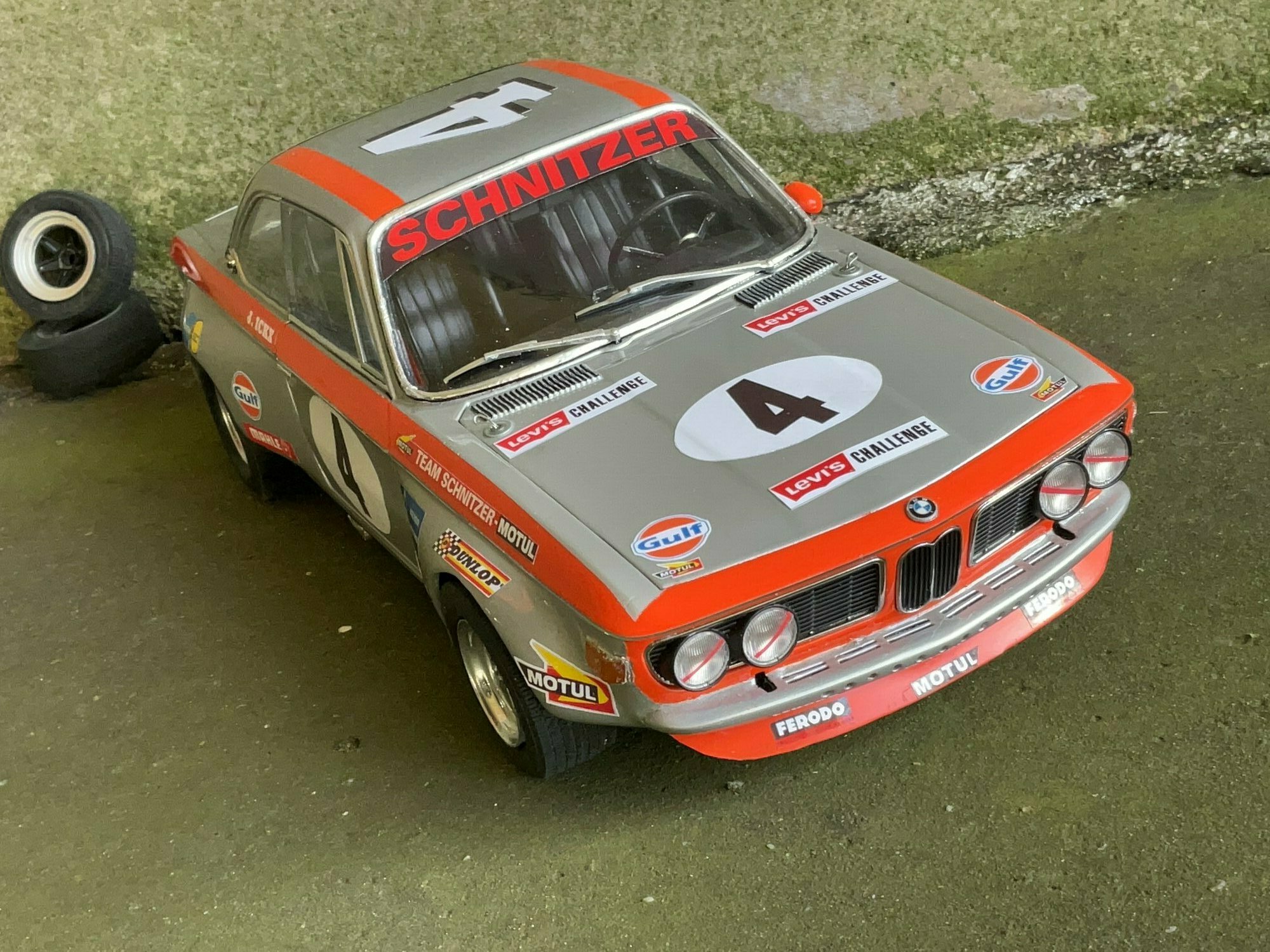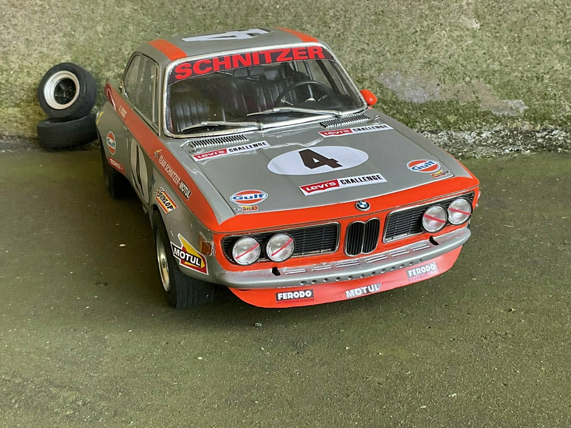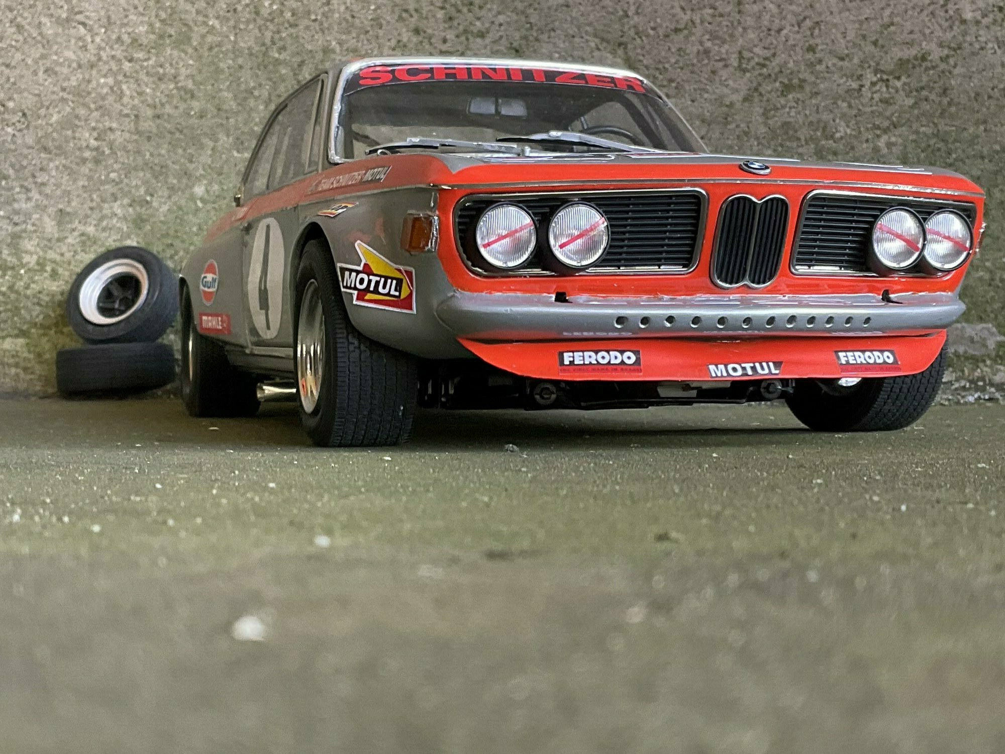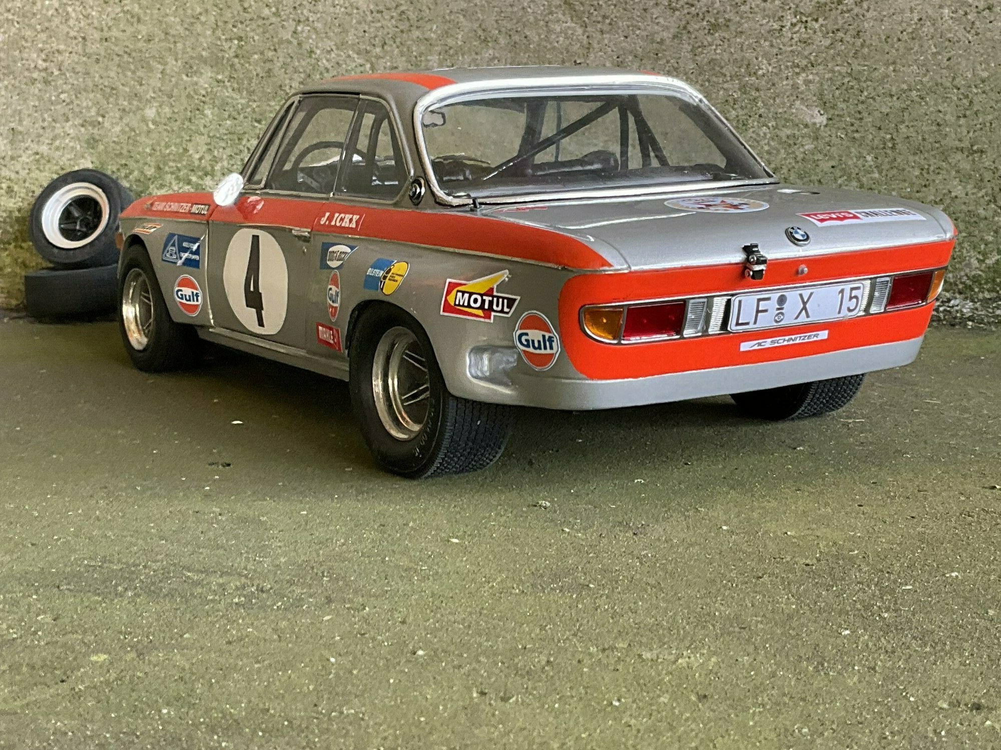 Team Schnitzer often ran silver paint with a bright contrasting color. On this BMW 2800 CS the upper trim line is orange, flowing over the front, fenders and door frames. There’s a white roundel with “4” on both doors and the hood. The windshield sunstrip reads “Schnitzer”, and the driver side carries “J. Ickx” (a nod to Jacky Ickx). The front has the twin BMW grille and four round lamps; the big red lower spoiler and visible sponsor decals include Gulf, Motul, Mahle, Ferodo and Borg & Beck. The five‑spoke rims with wide tires, a side exhaust and the removed chrome bumpers finish off the race look. The diecast body’s panel lines and gaps are clean, which is nice for a model this size. Once more: this particular piece is a customized 1/12 model from KK Scale, not the unmodified product from the maker.