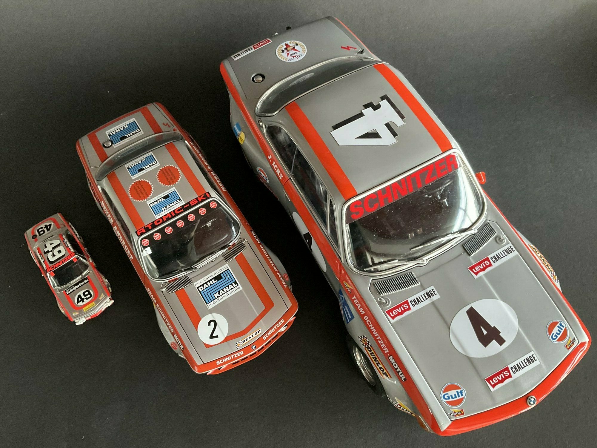 The model shown at 1/12 scale originally comes from KK Scale and is a diecast piece. Important: this example has been modified and is not the stock product from KK Scale. You can see changes in the livery and detailing: the side number circles with the “4”, the sunstrip reading “Schnitzer” and extra sponsor decals match a Team Schnitzer race setup for the BMW 2800 CS. Visible are Minilite‑style wheels, a lowered ride height and a red front spoiler; the missing bumpers underline the Group‑2 look. The body is silver with an orange trim line running over the front, sides and rear. On the hood and both doors there’s a white roundel with the number “4”. The front shows the classic BMW kidney grille and four round headlights, plus a small red lower spoiler with tiny brand stickers. Inside you can spot a stripped interior with a hinted roll cage. At 1/12 scale (the real car is about 4.66 m (15.3 ft)) the model measures just under 39 cm (15.4 inches), which matches the proportions of the BMW 2800 CS nicely. Again: the displayed item is a modified 1/12 KK Scale model from the collector “TrolleyJack”, not an unaltered factory release.
